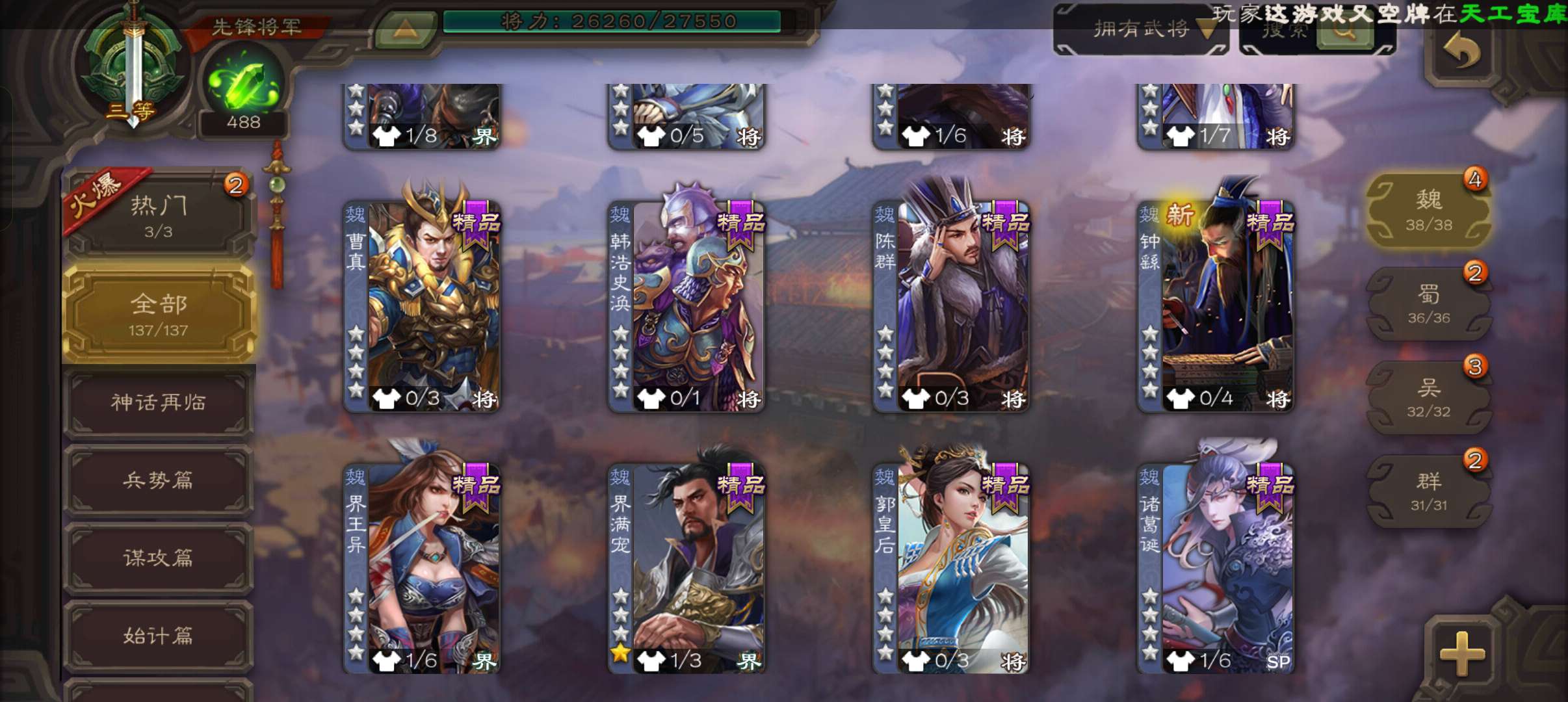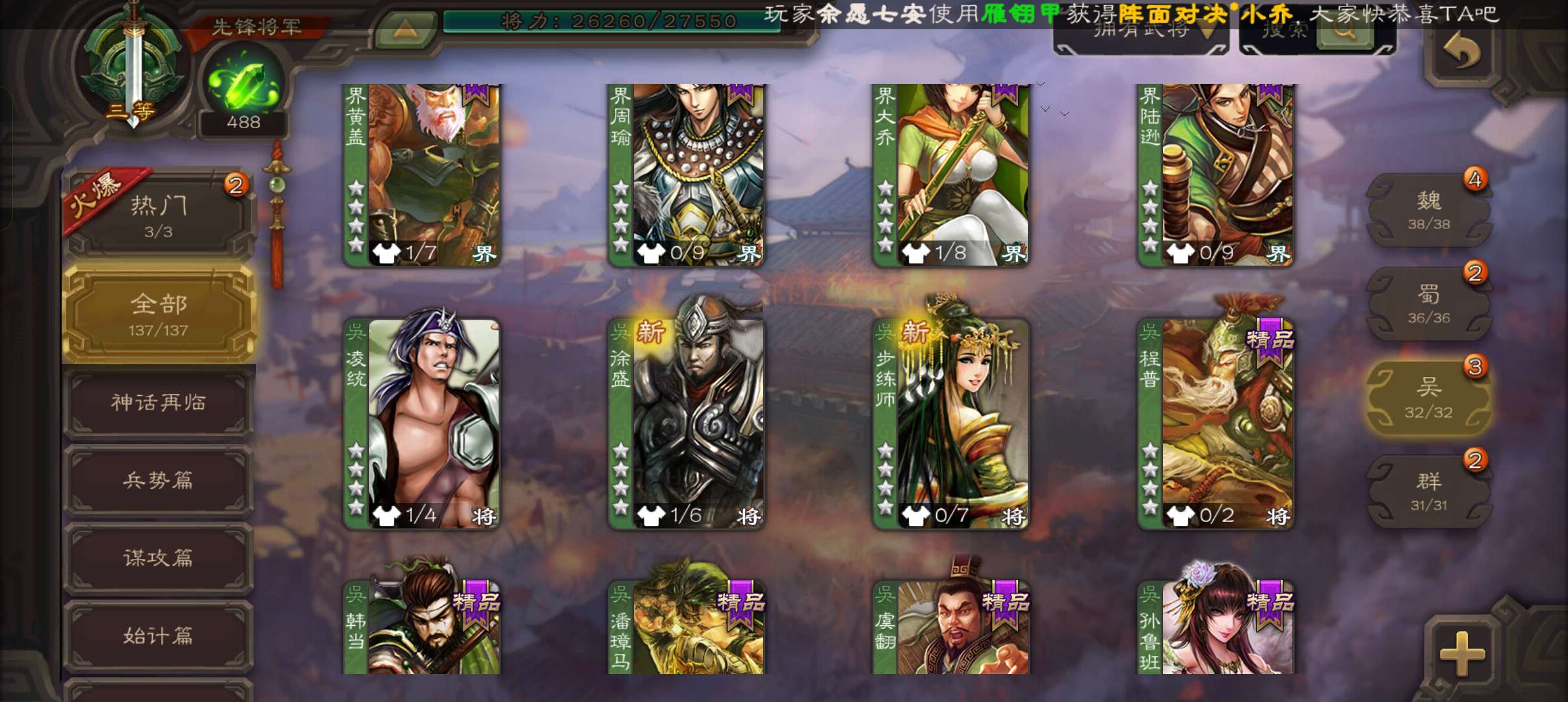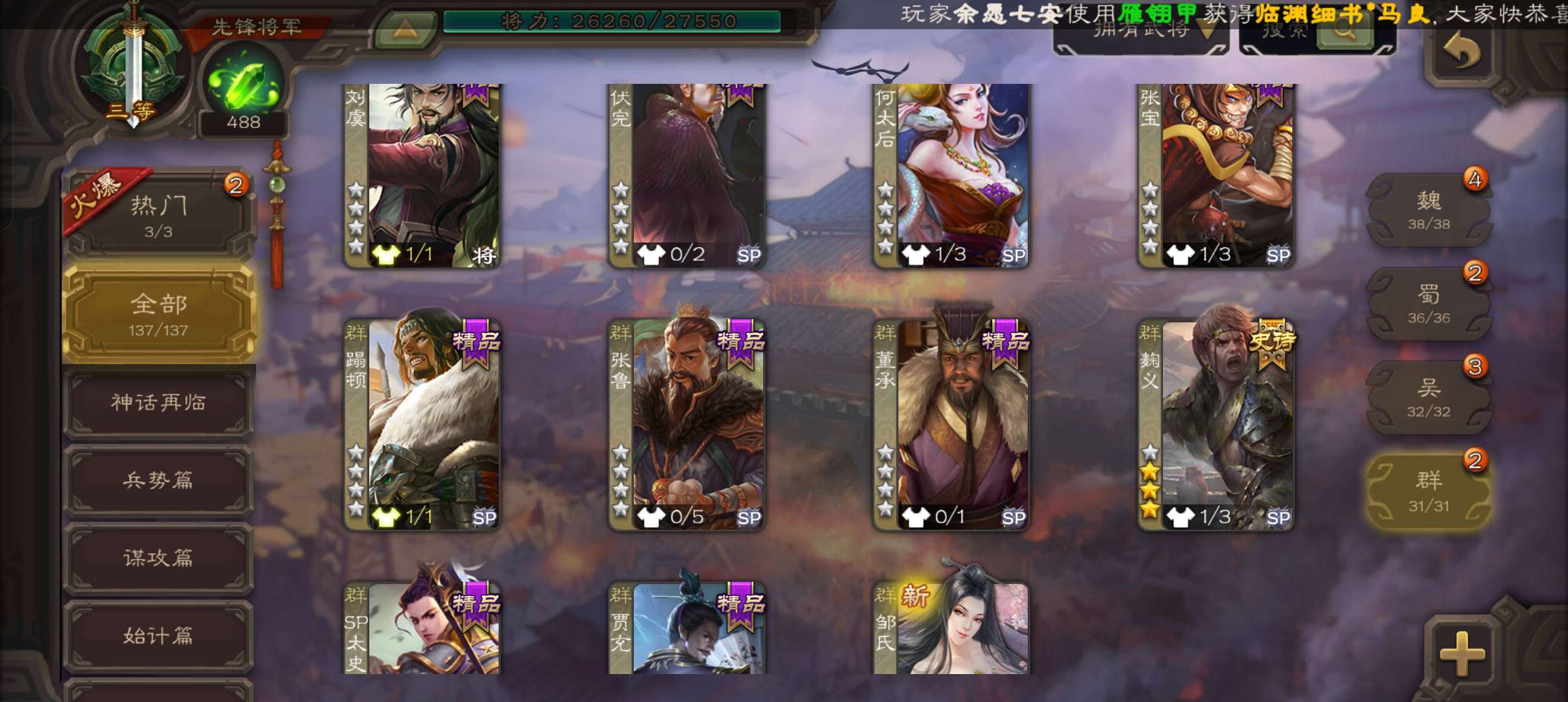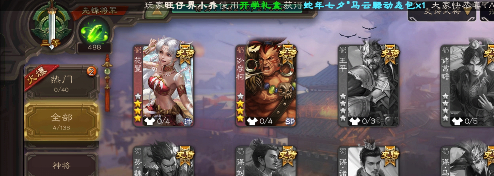 4史诗先锋,7.5万豆,回廊动白马神吕布沙摩柯花鬘,甘夫人谋韩当界满宠崔琰谋高顺137将