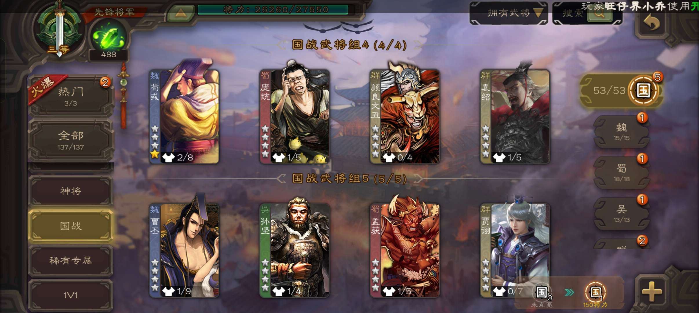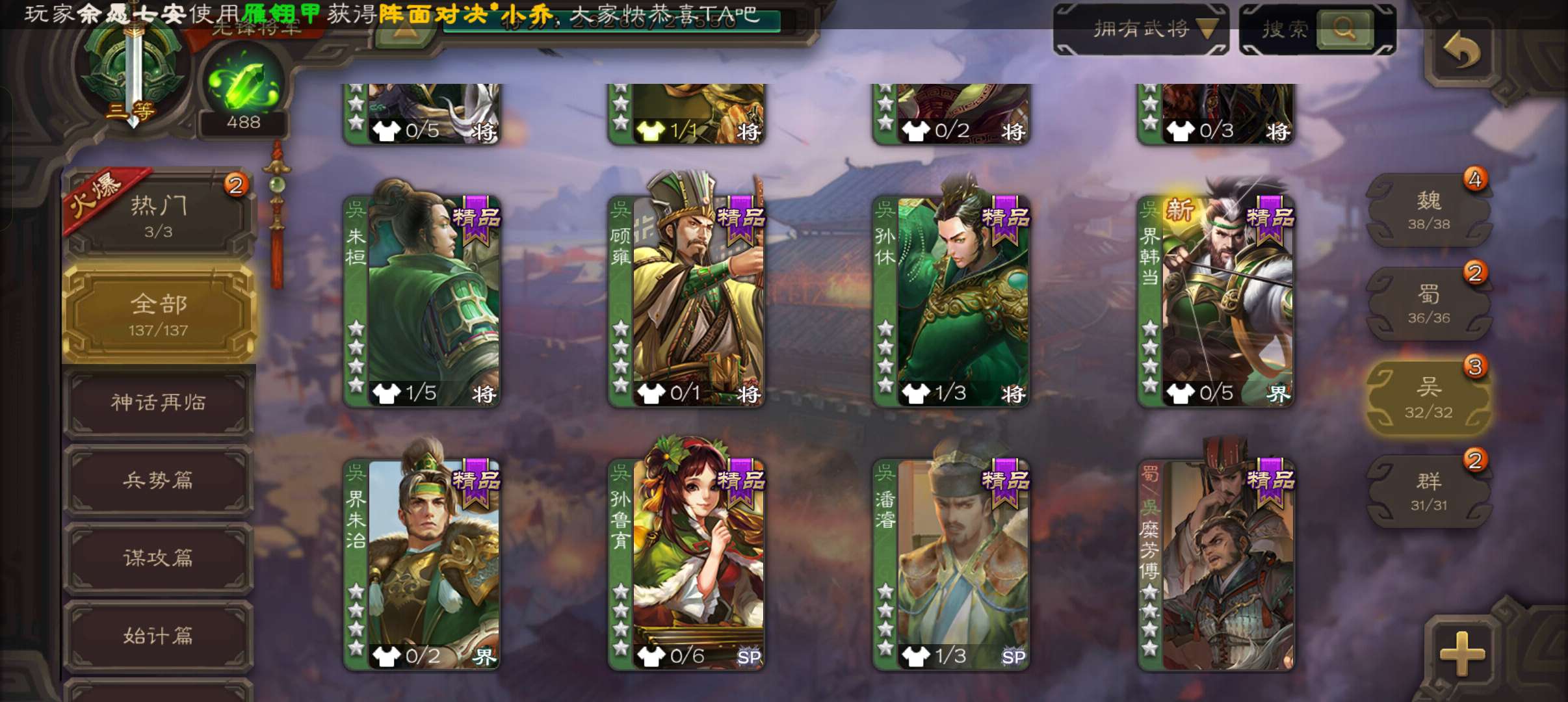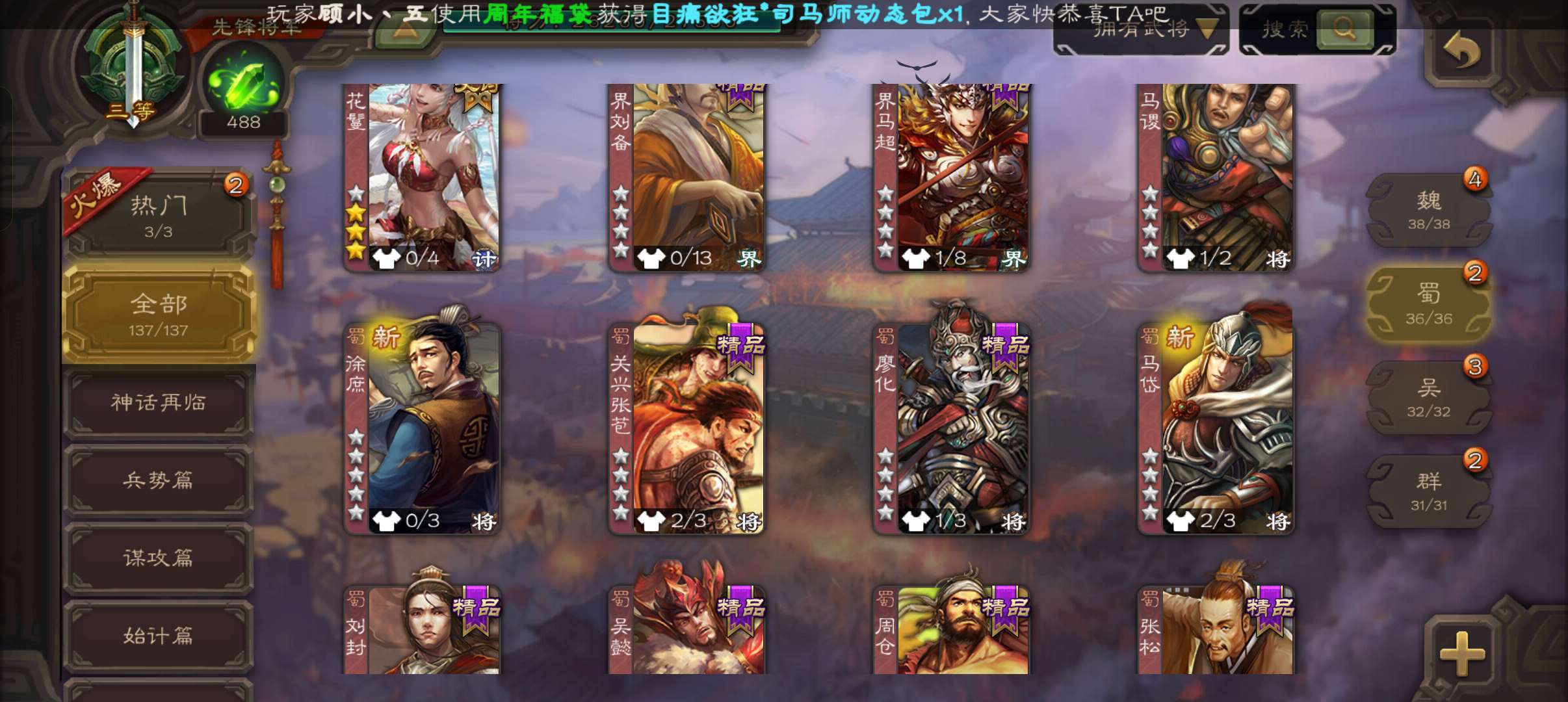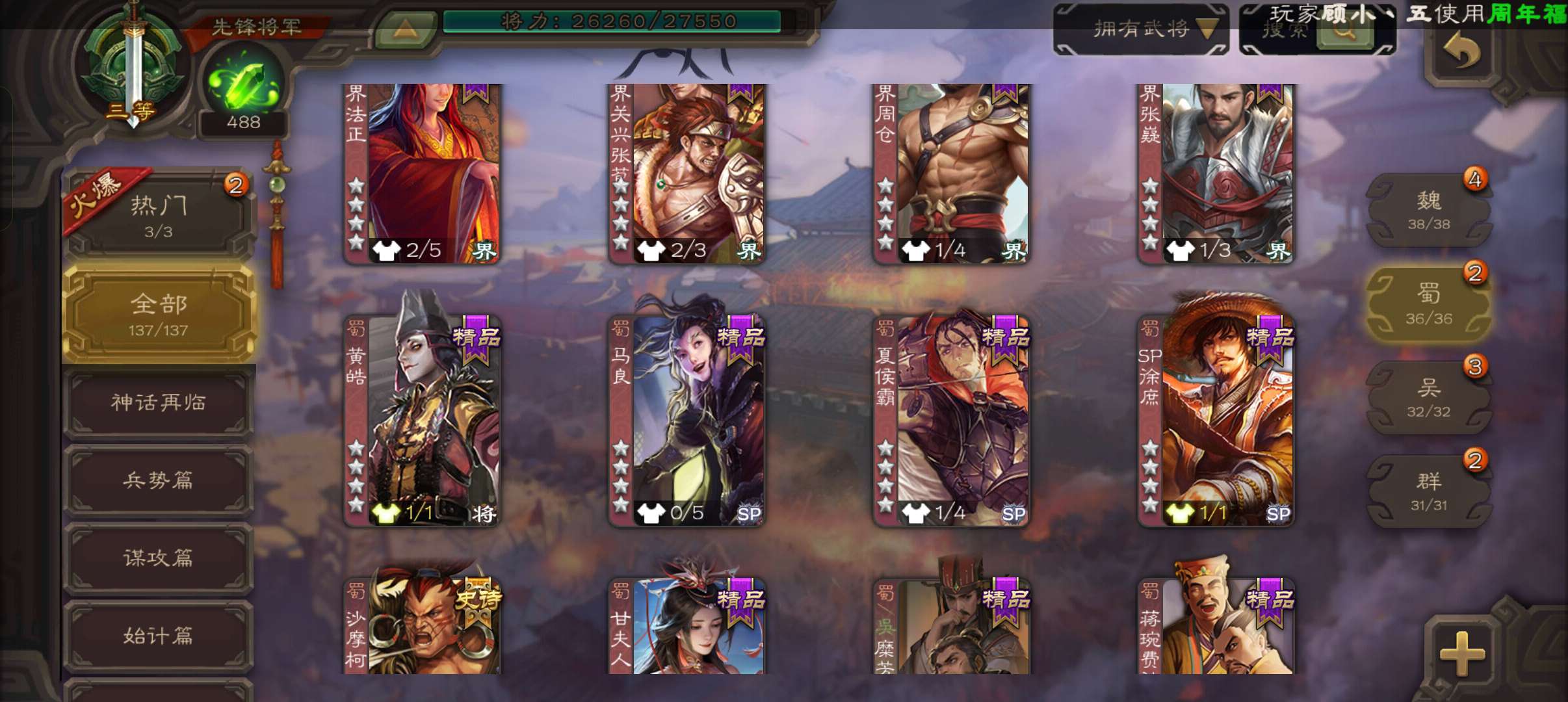 4史诗先锋,7.5万豆,回廊动白马神吕布沙摩柯花鬘,甘夫人谋韩当界满宠崔琰谋高顺137将