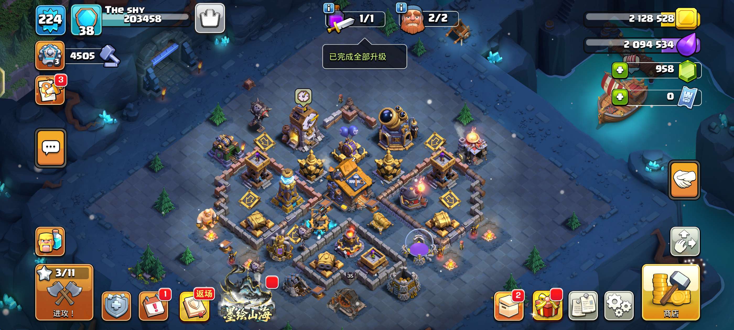 18本123繁荣度,嫦娥皮肤,铁扇公主皮肤,废土世界,三个家乡大本营皮肤,夜世界除了城墙全满