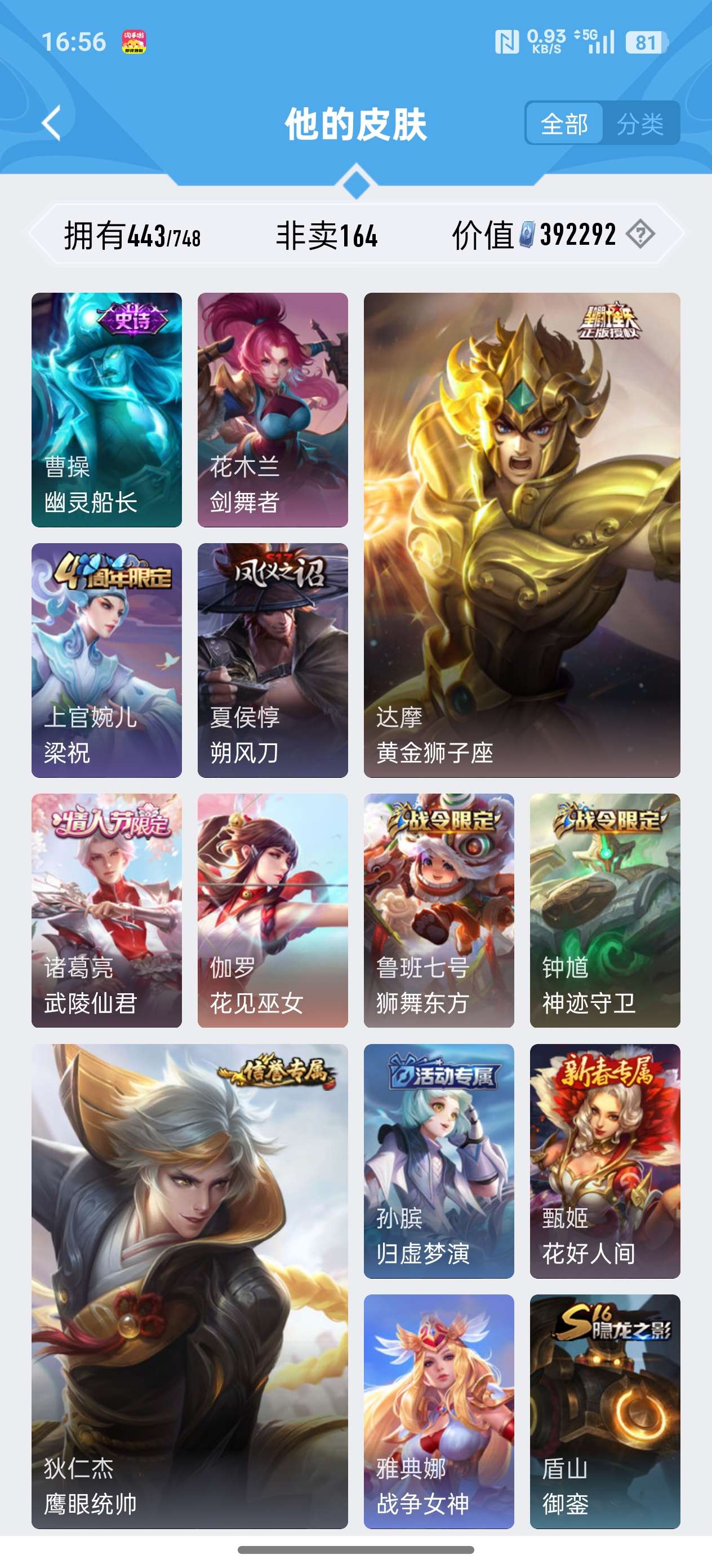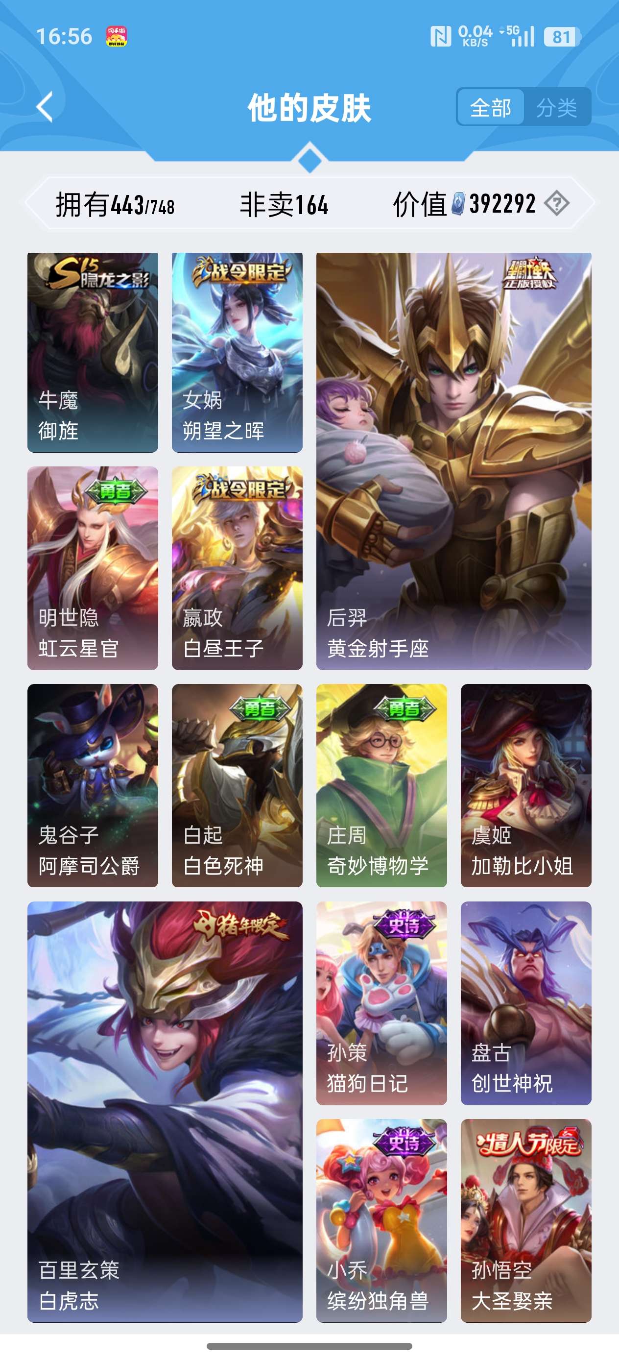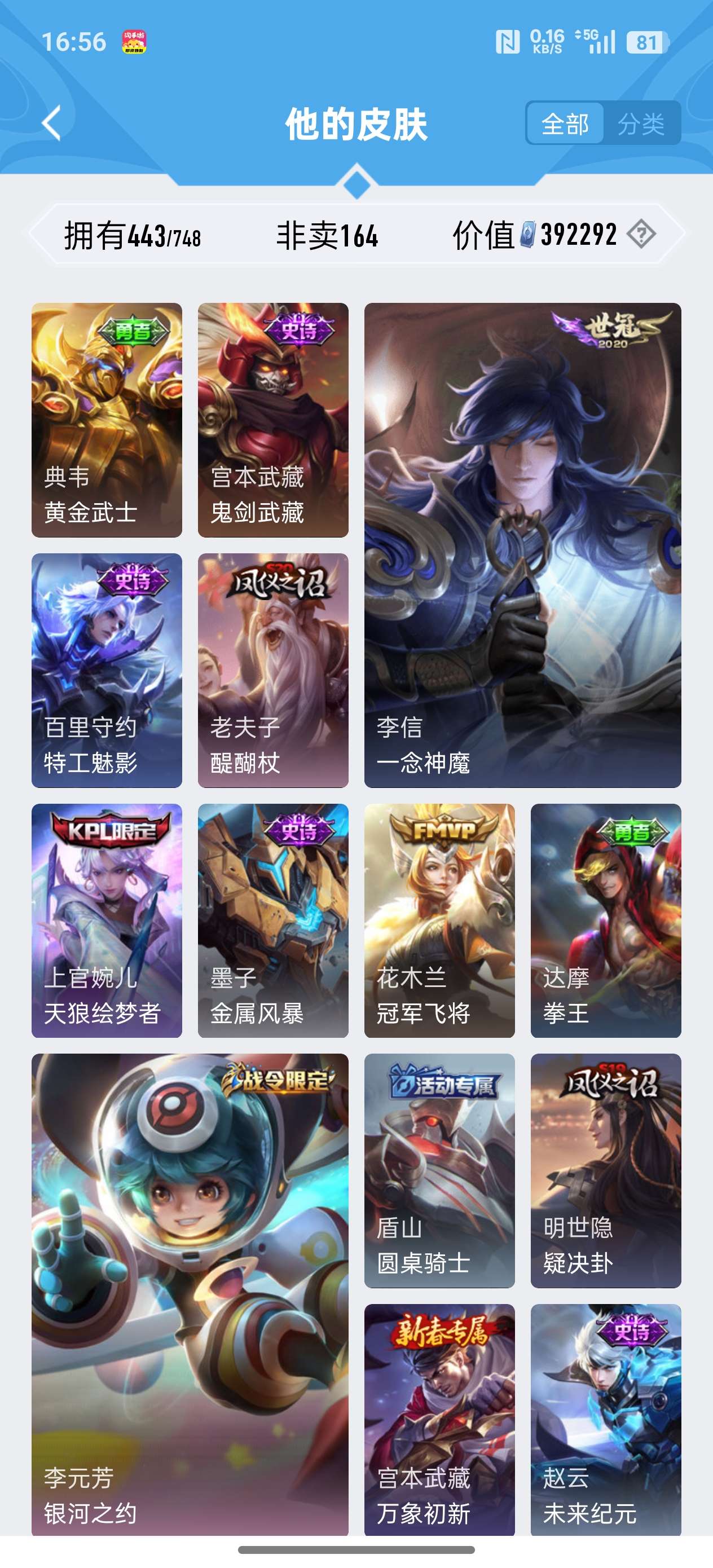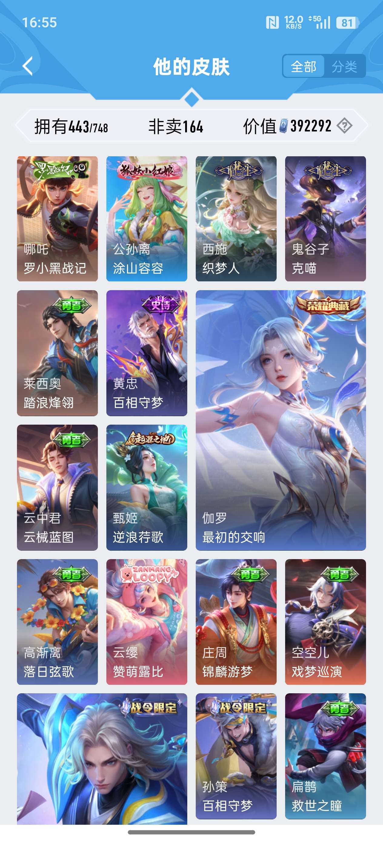 安卓QQ/至尊星耀/443皮肤/125英雄/4典藏/0珍品无双/2无双/0珍品传说/37传说/141