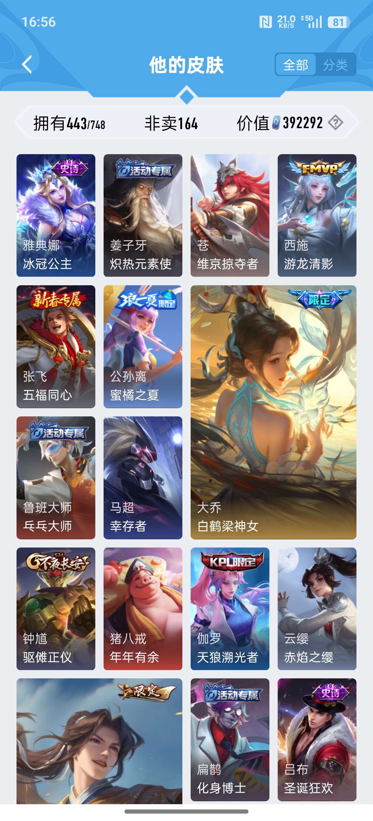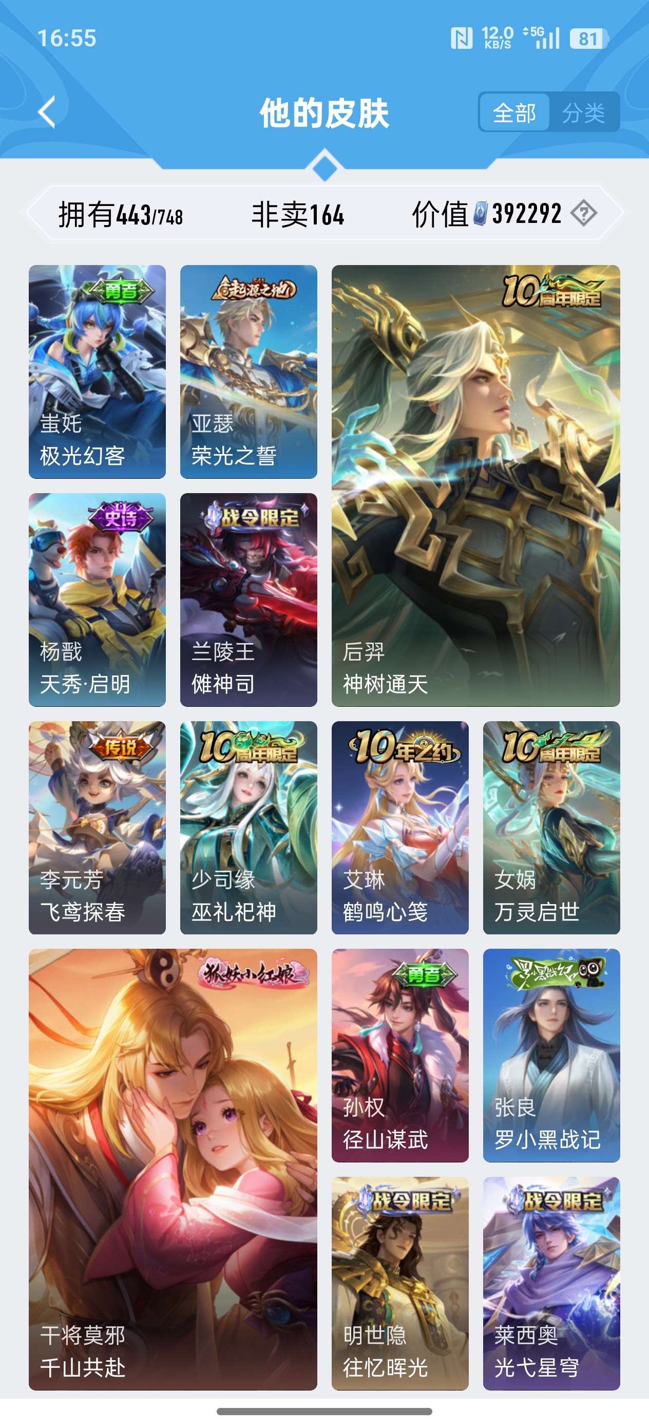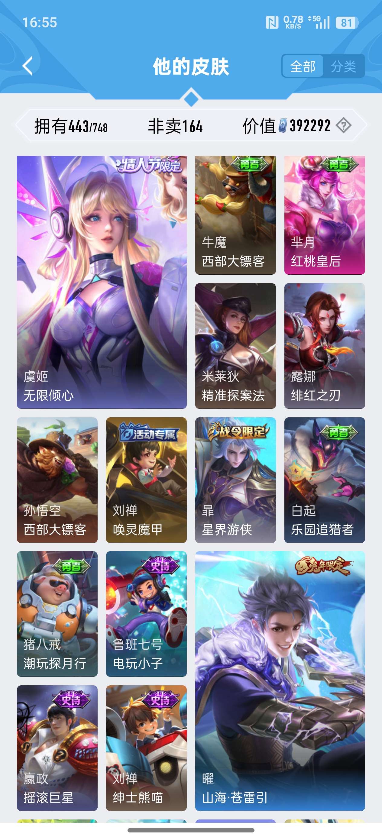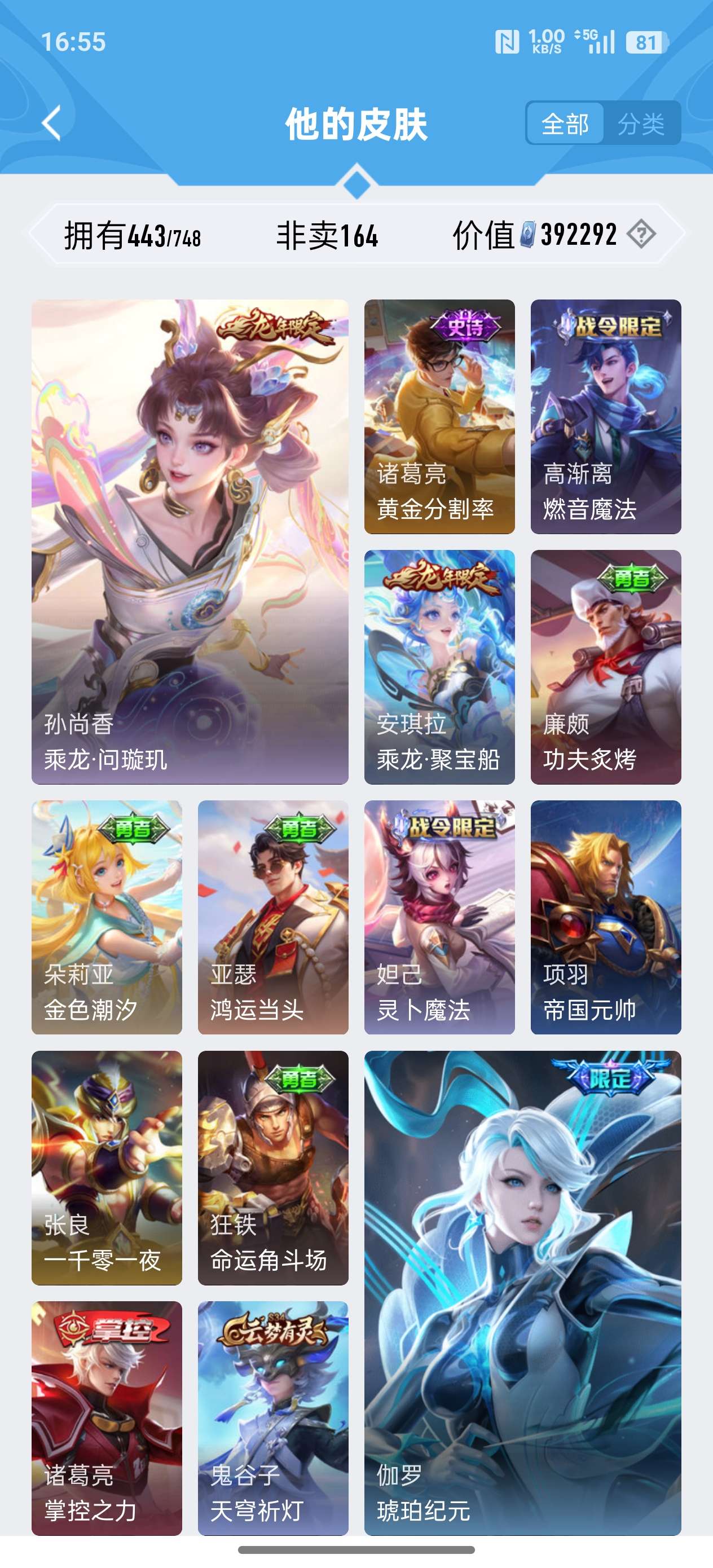 安卓QQ/至尊星耀/443皮肤/125英雄/4典藏/0珍品无双/2无双/0珍品传说/37传说/141