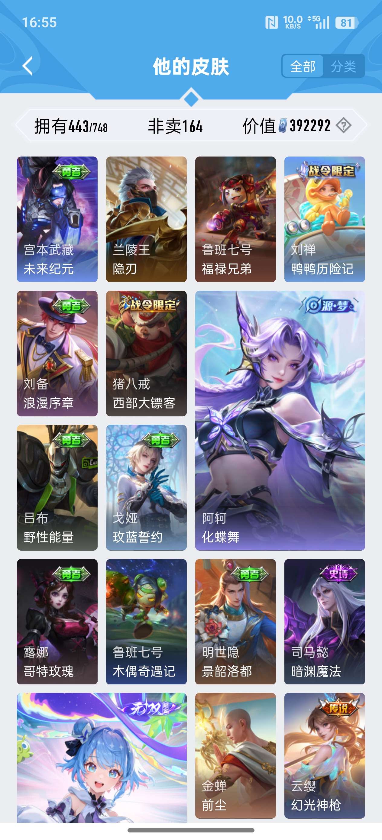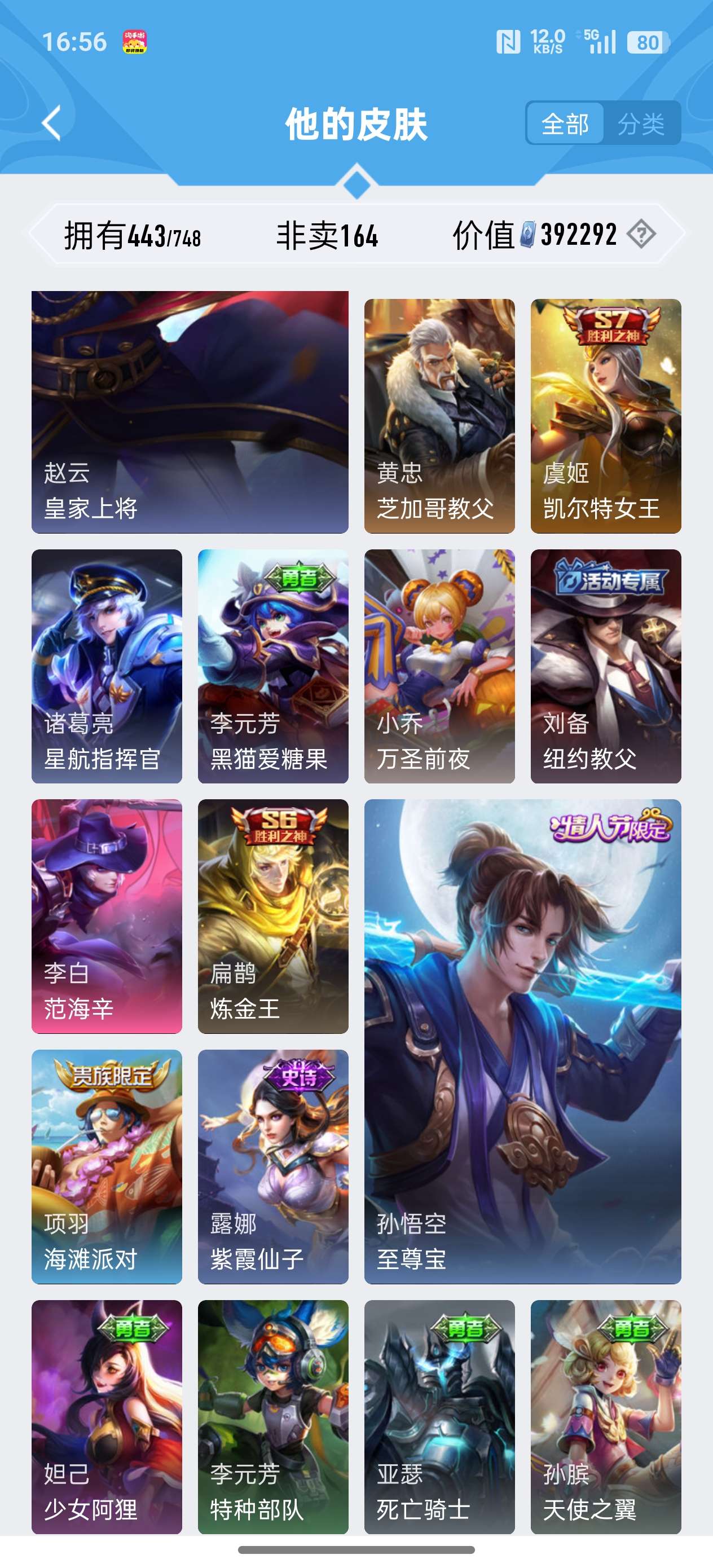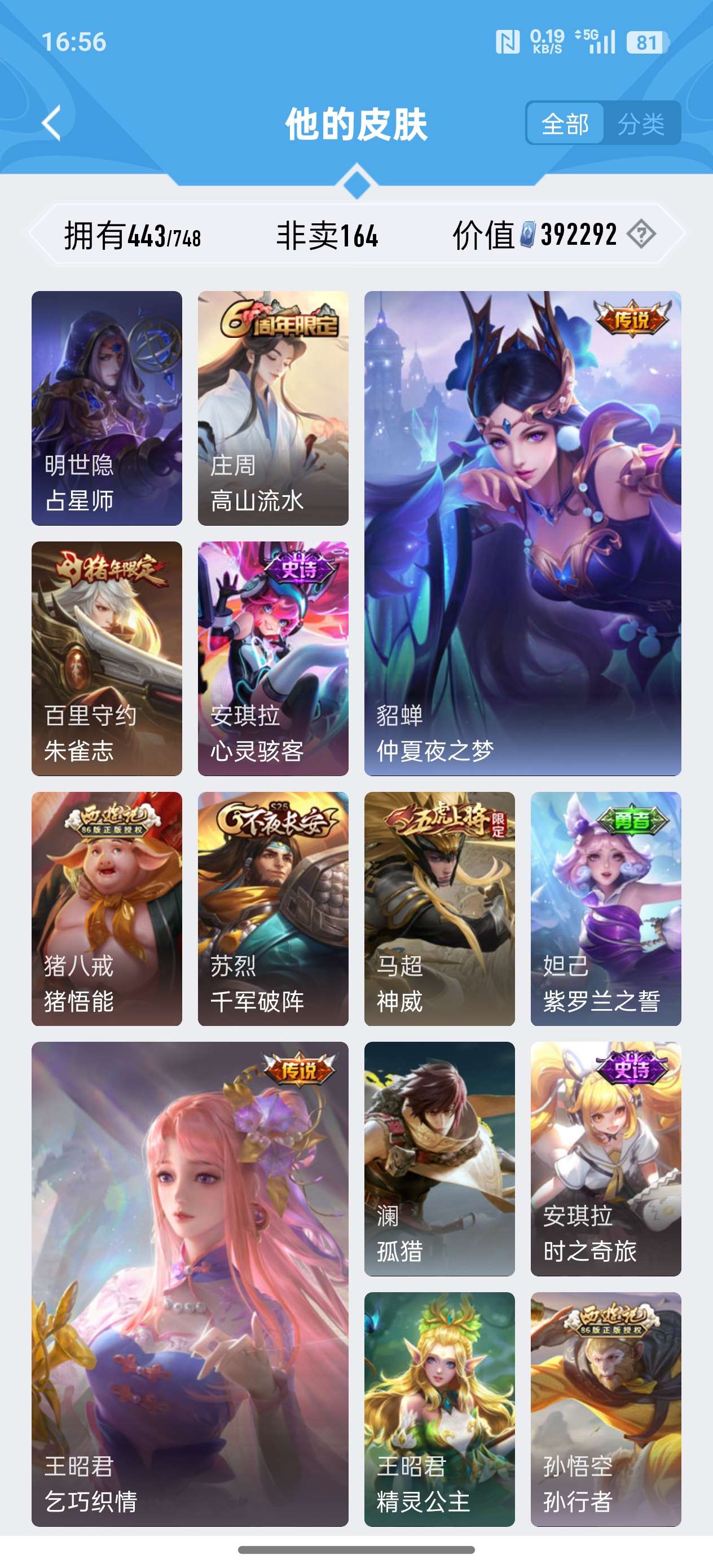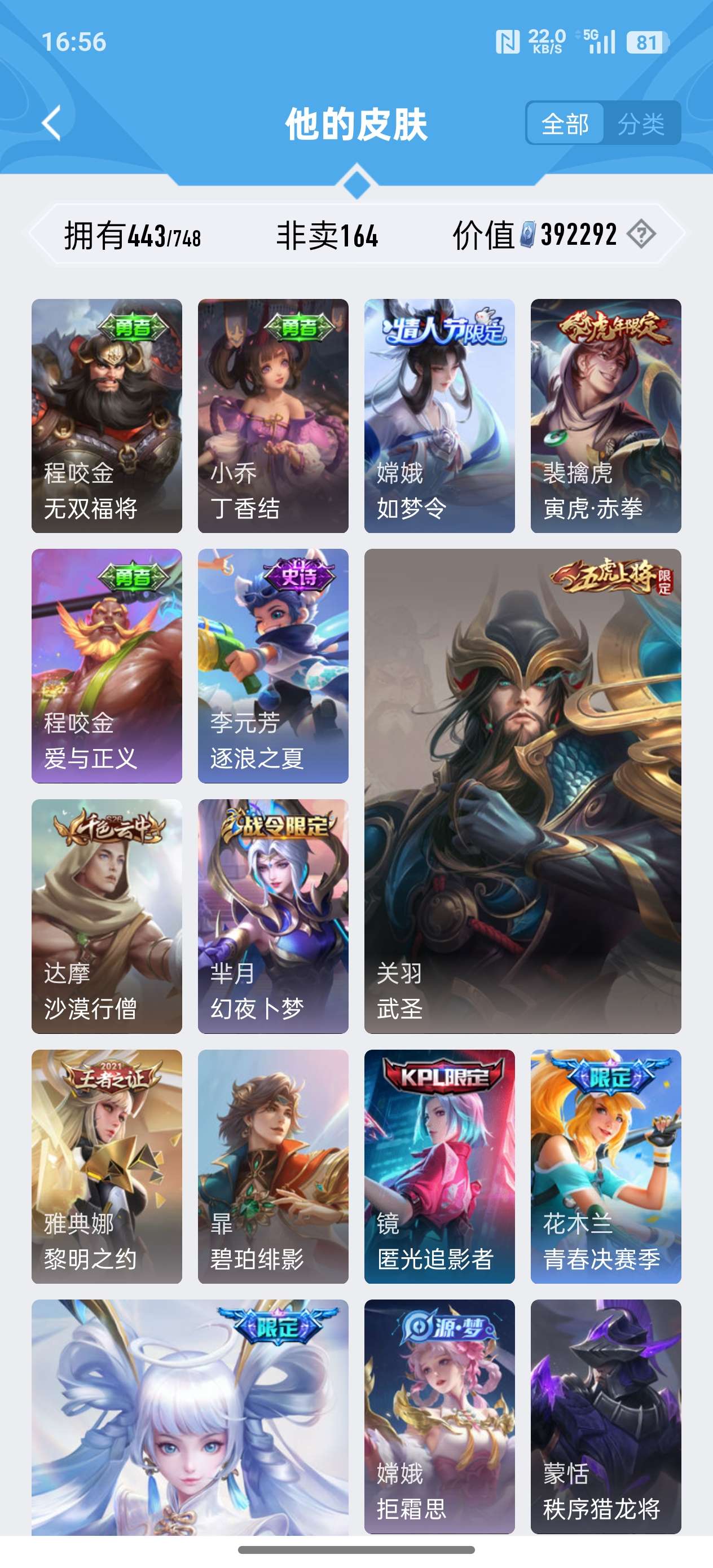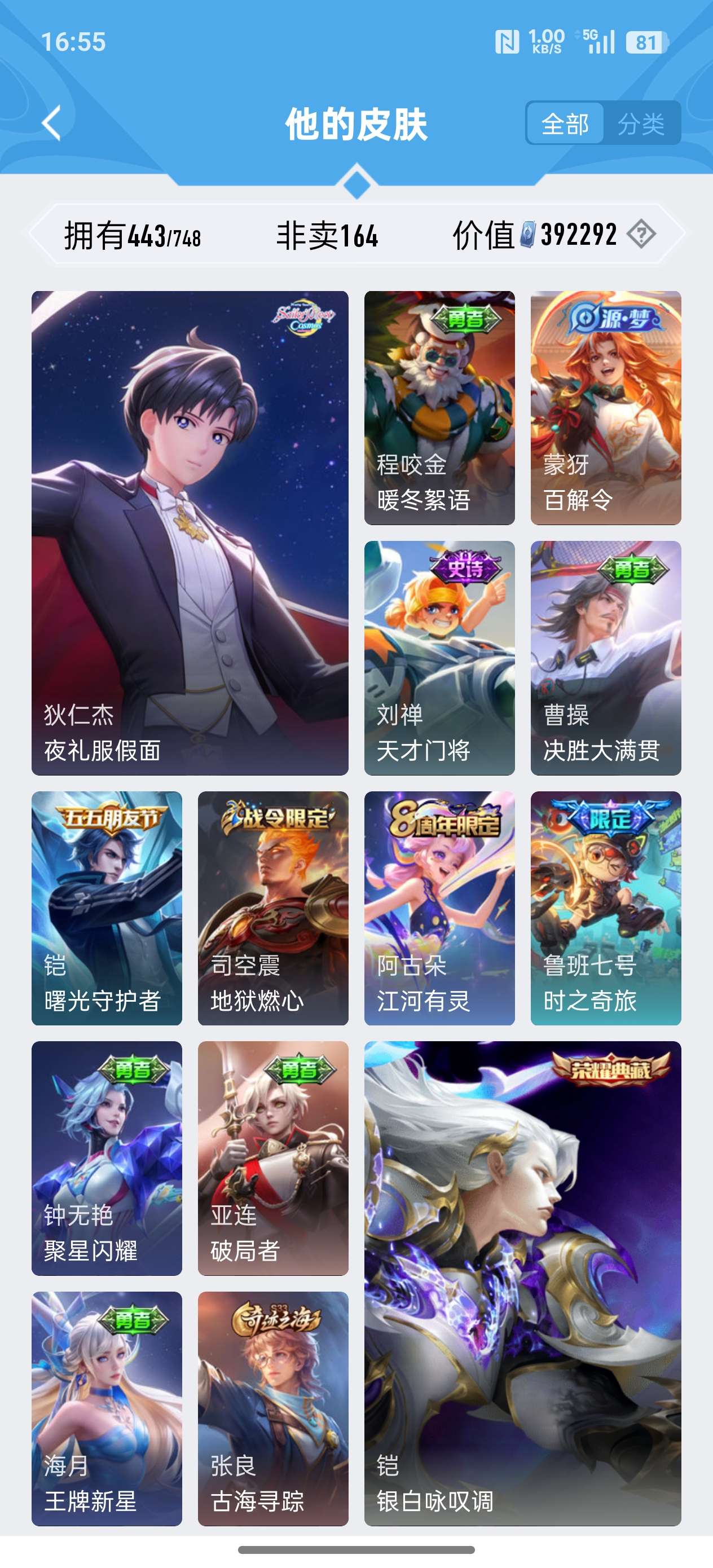 安卓QQ/至尊星耀/443皮肤/125英雄/4典藏/0珍品无双/2无双/0珍品传说/37传说/141