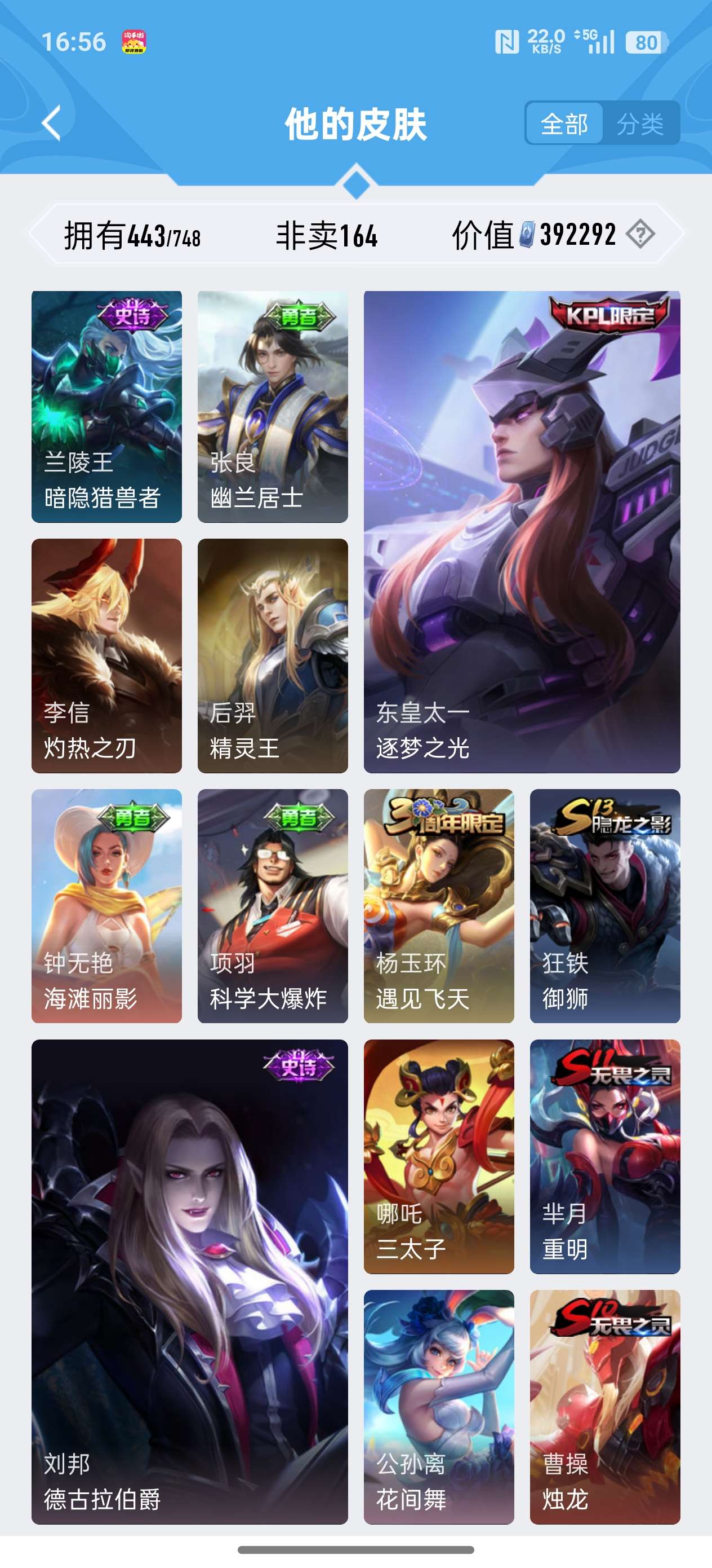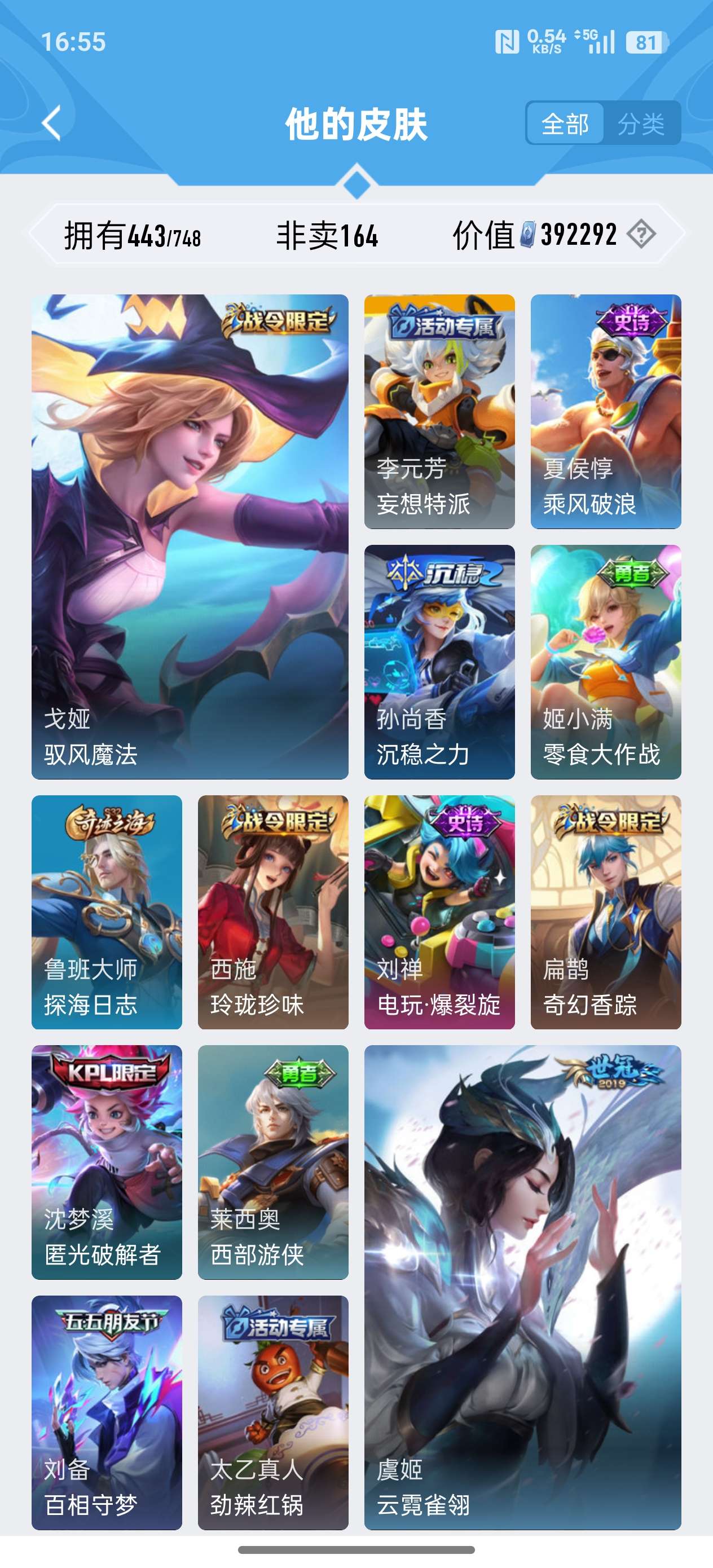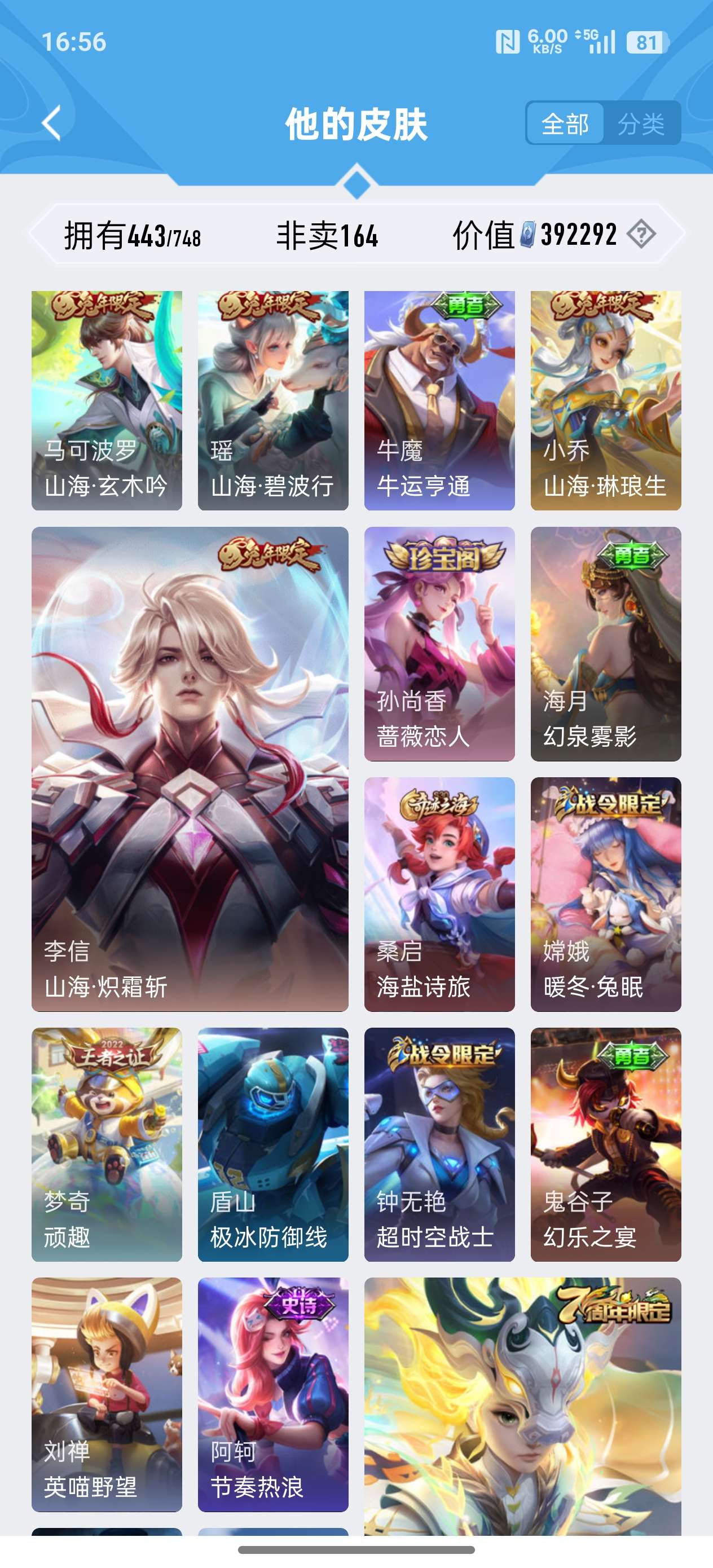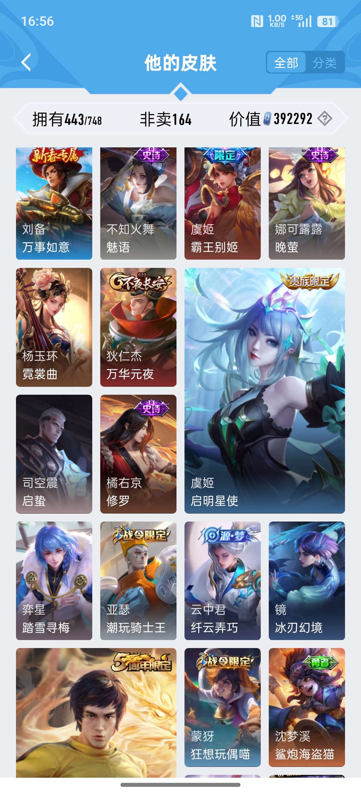 安卓QQ/至尊星耀/443皮肤/125英雄/4典藏/0珍品无双/2无双/0珍品传说/37传说/141