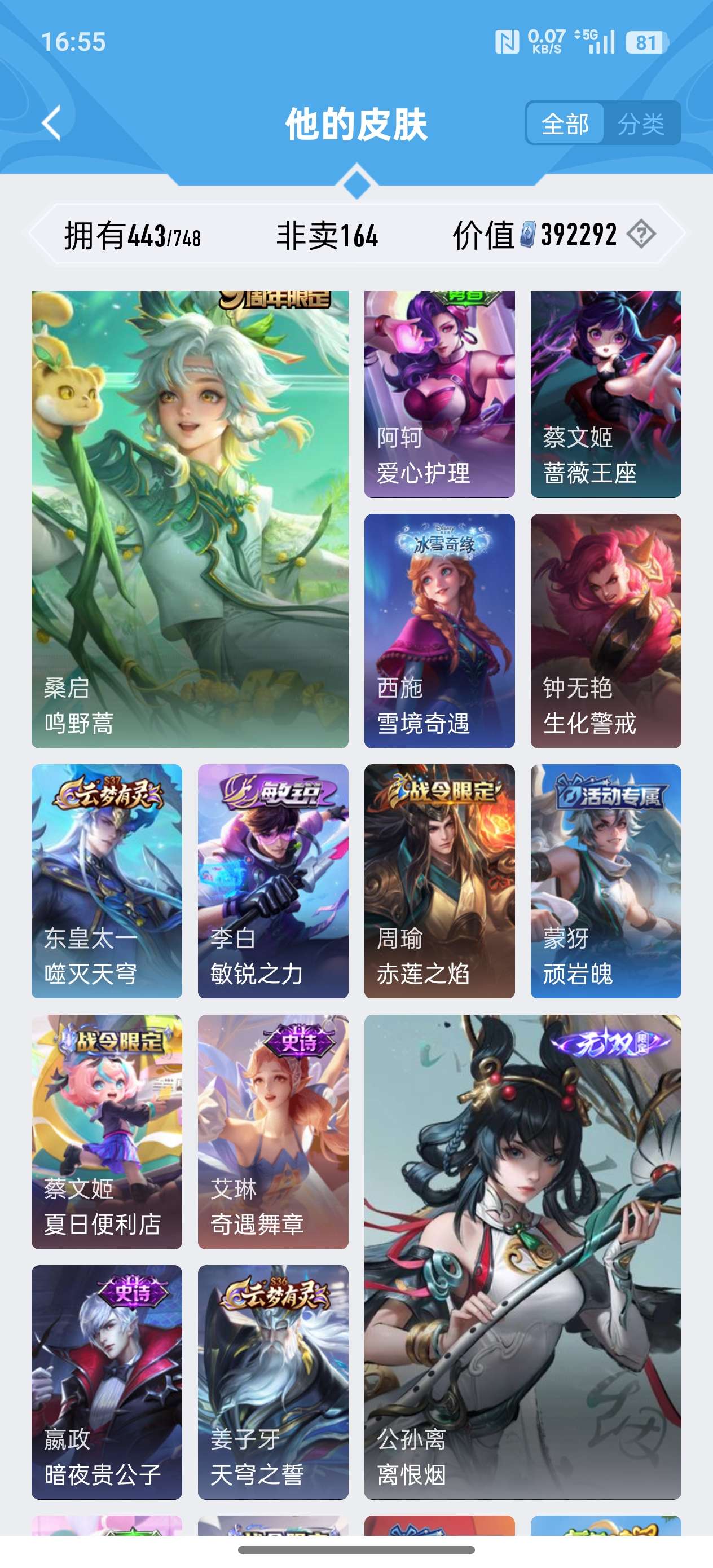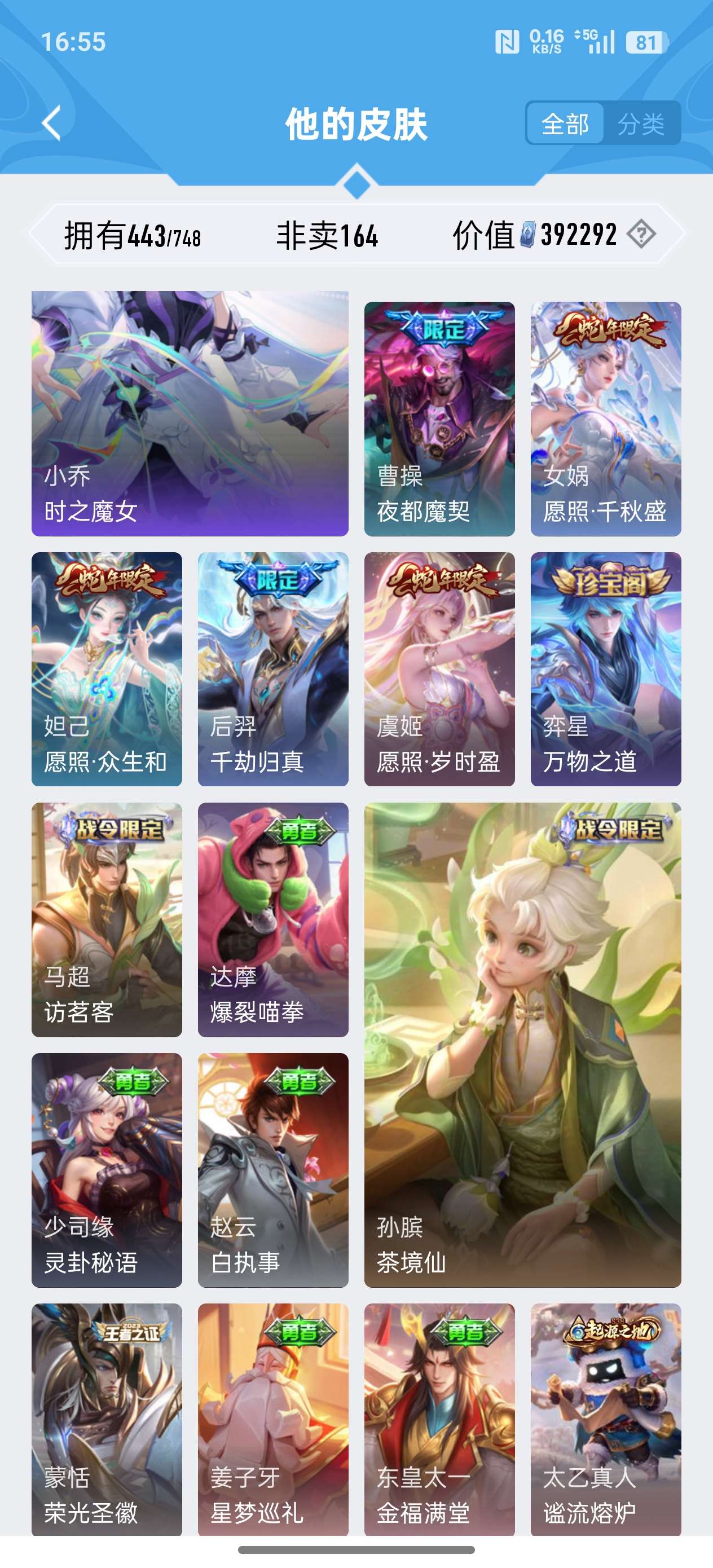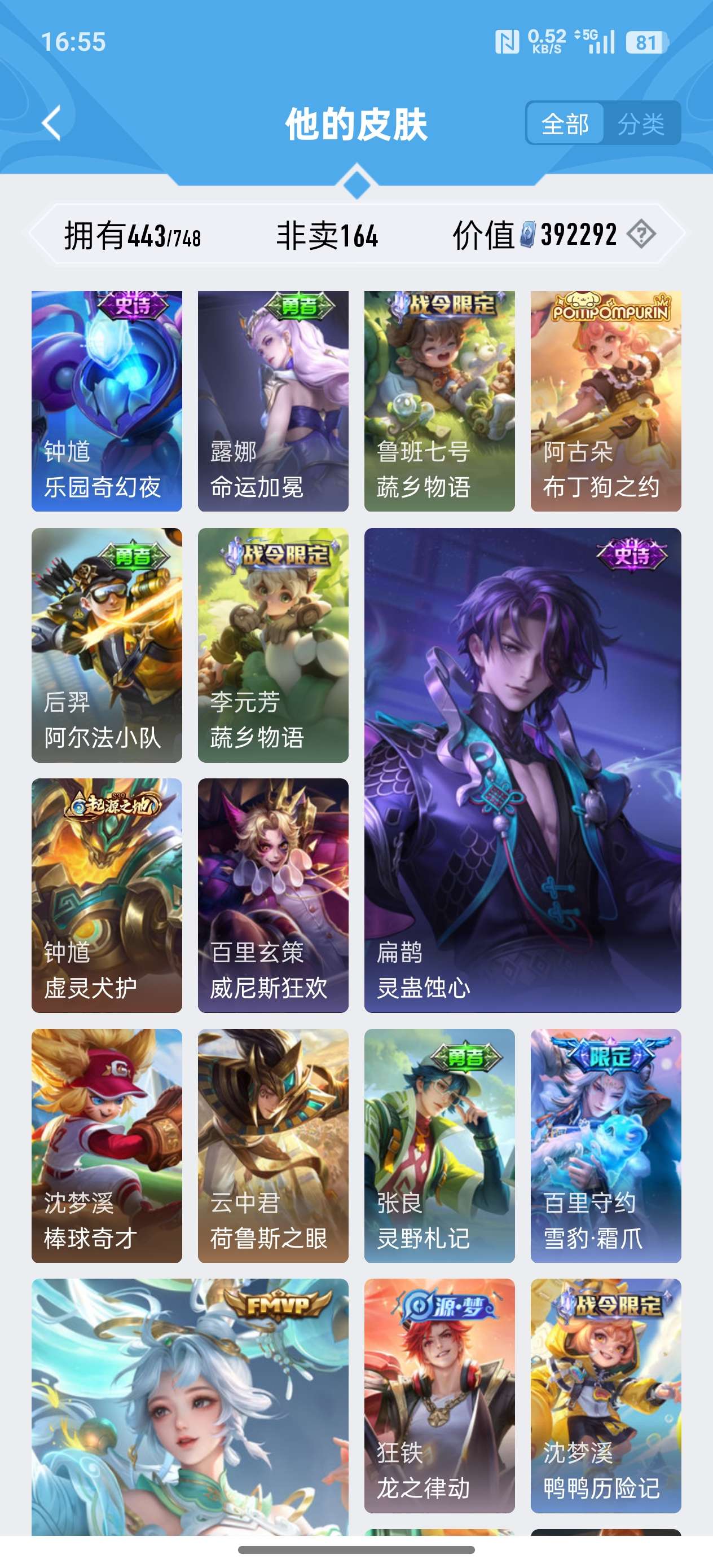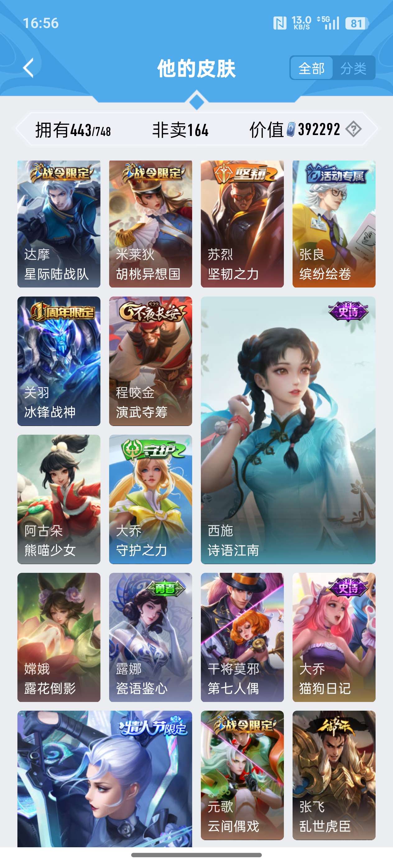安卓QQ/至尊星耀/443皮肤/125英雄/4典藏/0珍品无双/2无双/0珍品传说/37传说/141