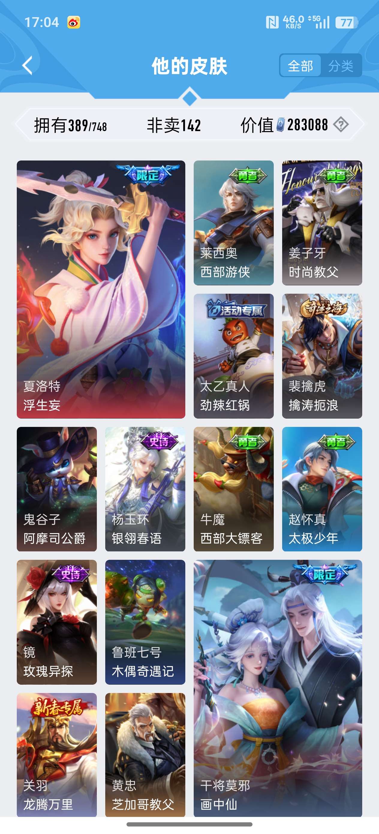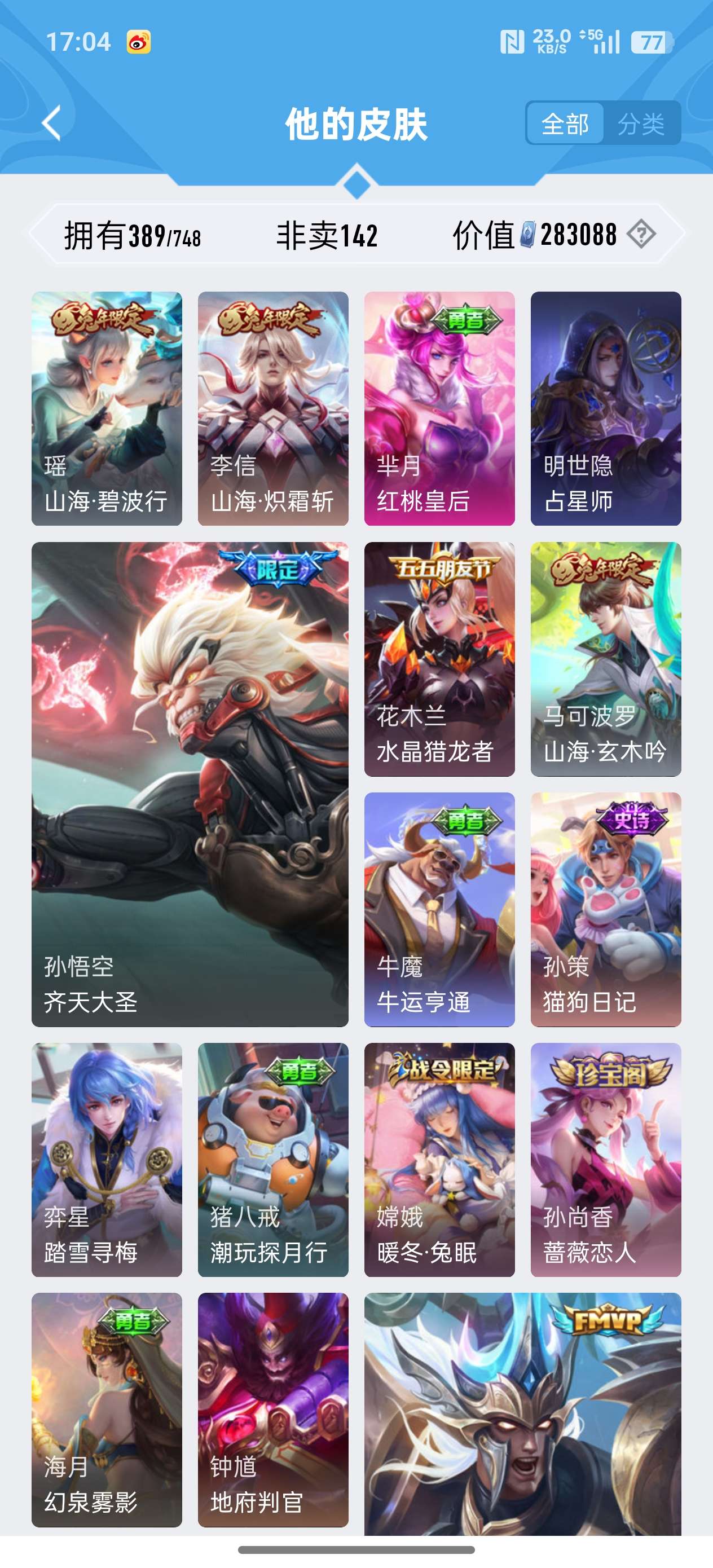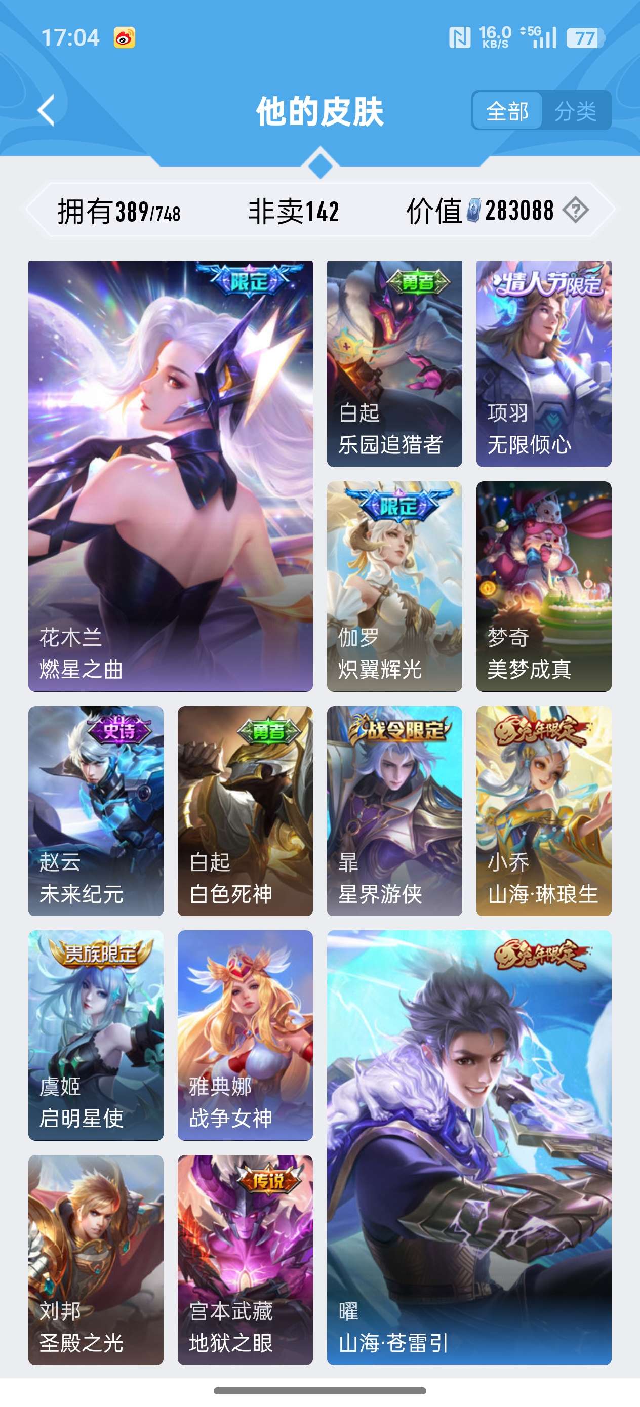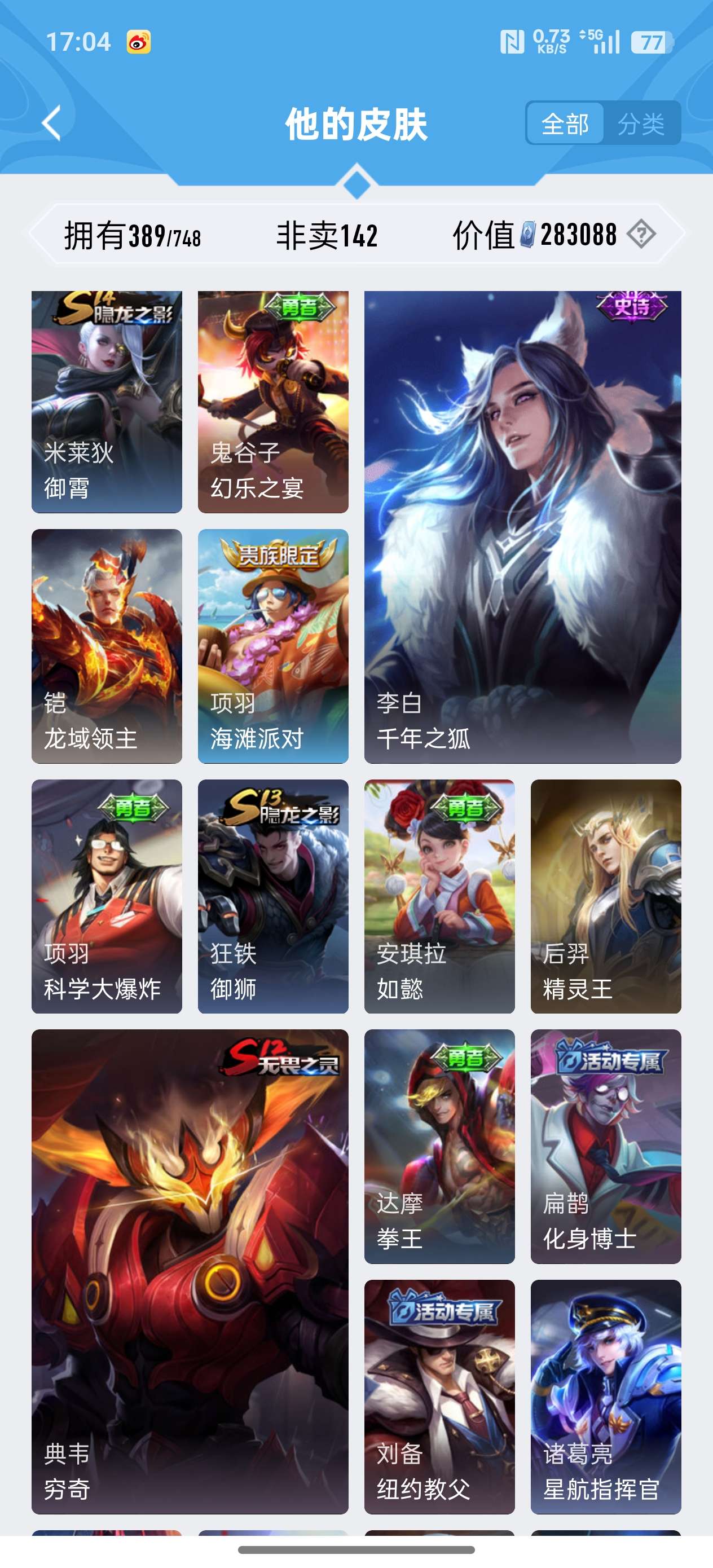 苹果QQ/荣耀王者/389皮肤/126英雄/1典藏/0珍品无双/2无双/1珍品传说/30传说/103