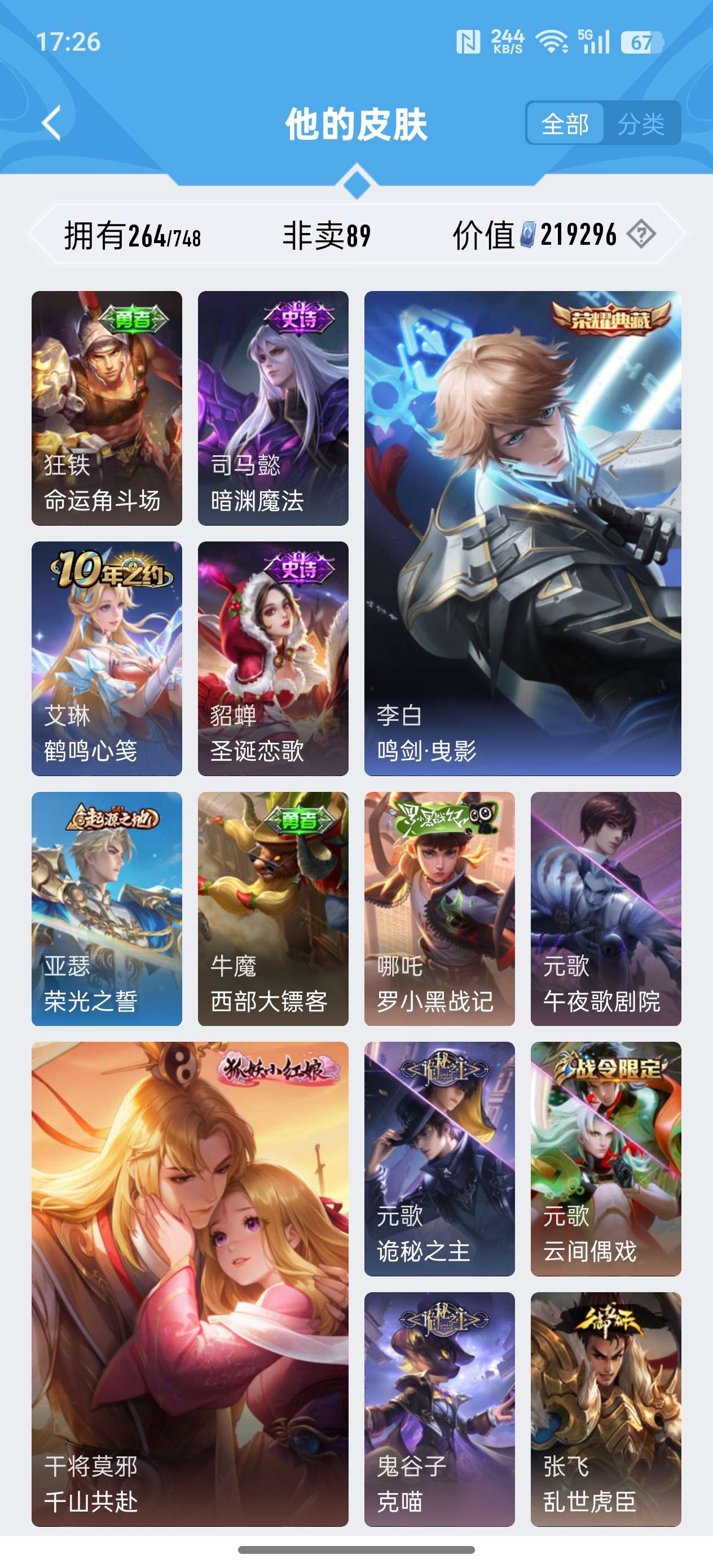 安卓QQ/至尊星耀/264皮肤/127英雄/1典藏/0珍品无双/1无双/1珍品传说/29传说/76史