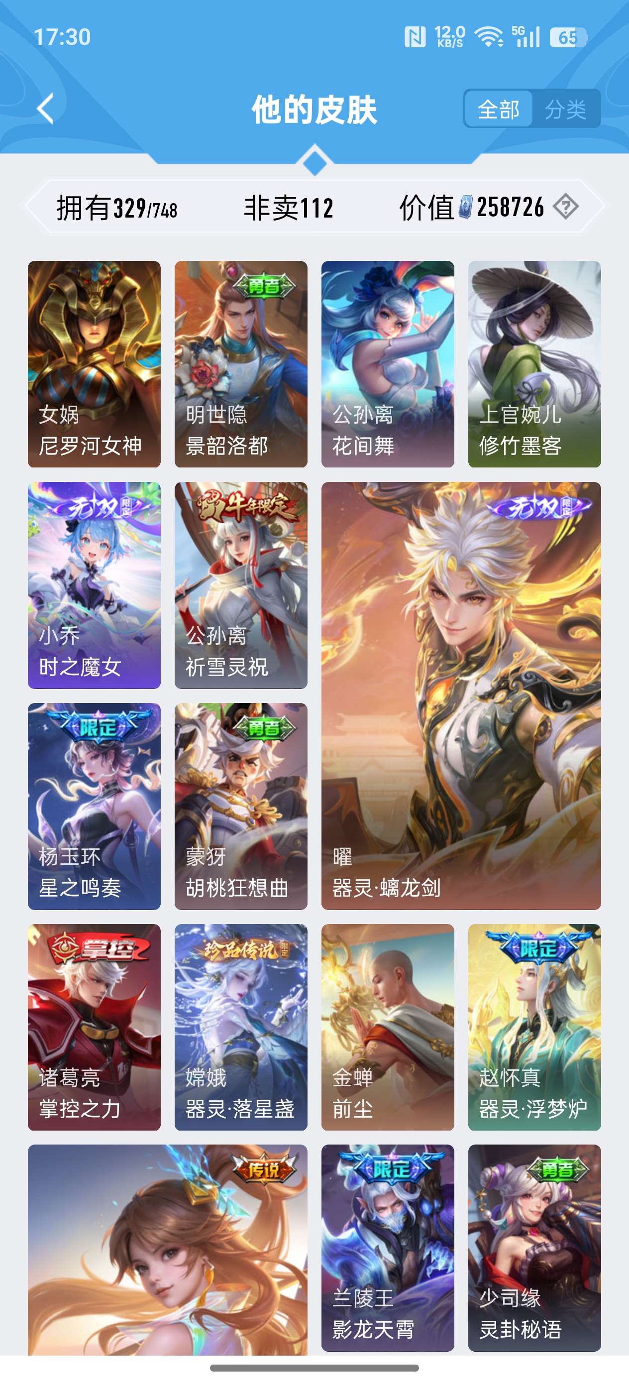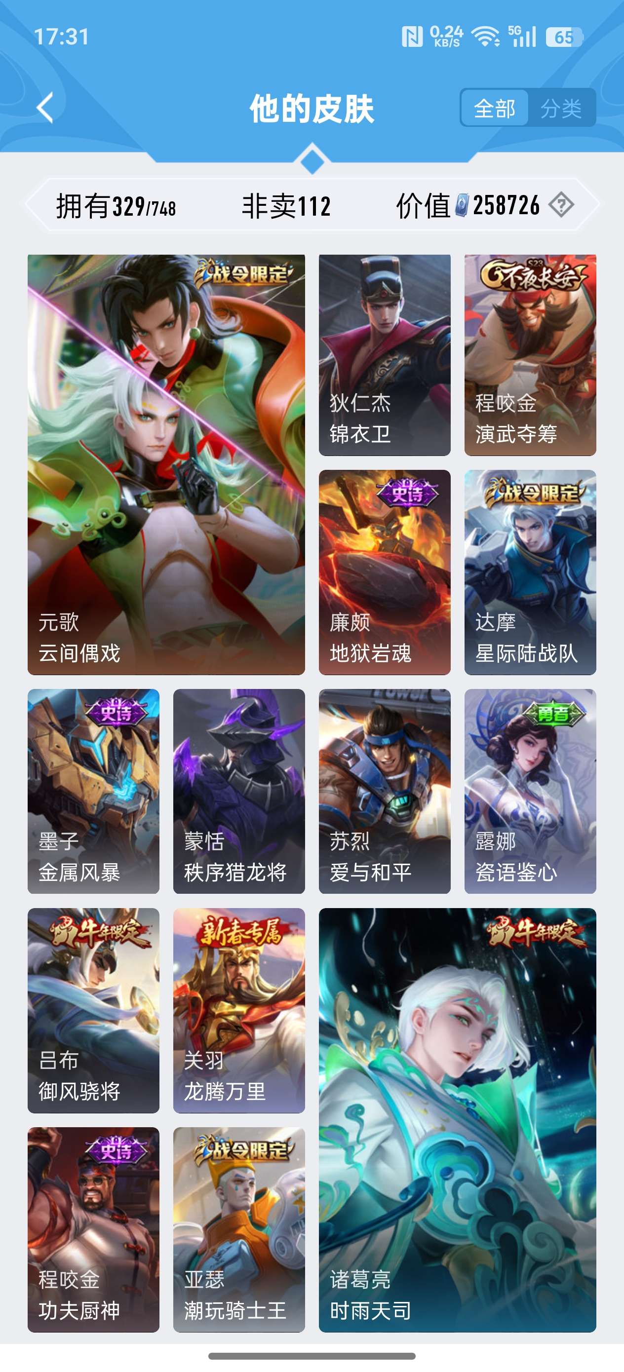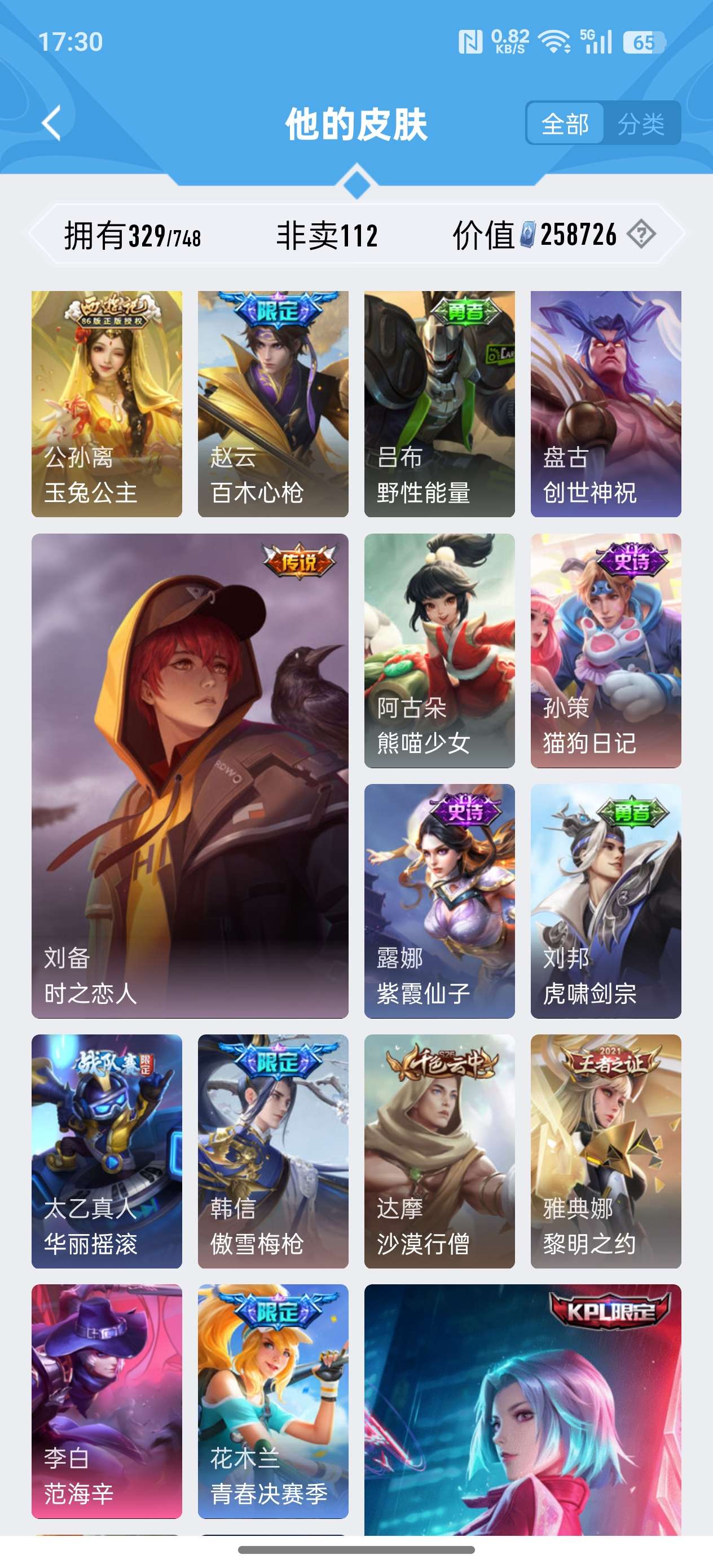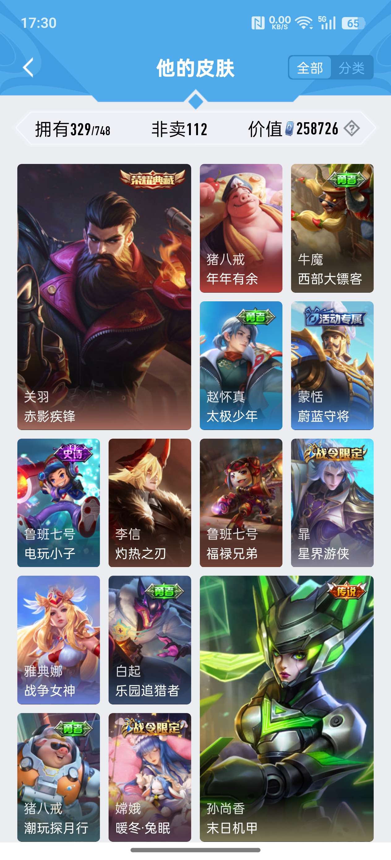 苹果v/无双王者/329皮肤/126英雄/1典藏/0珍品无双/2无双/2珍品传说/36传说/92史