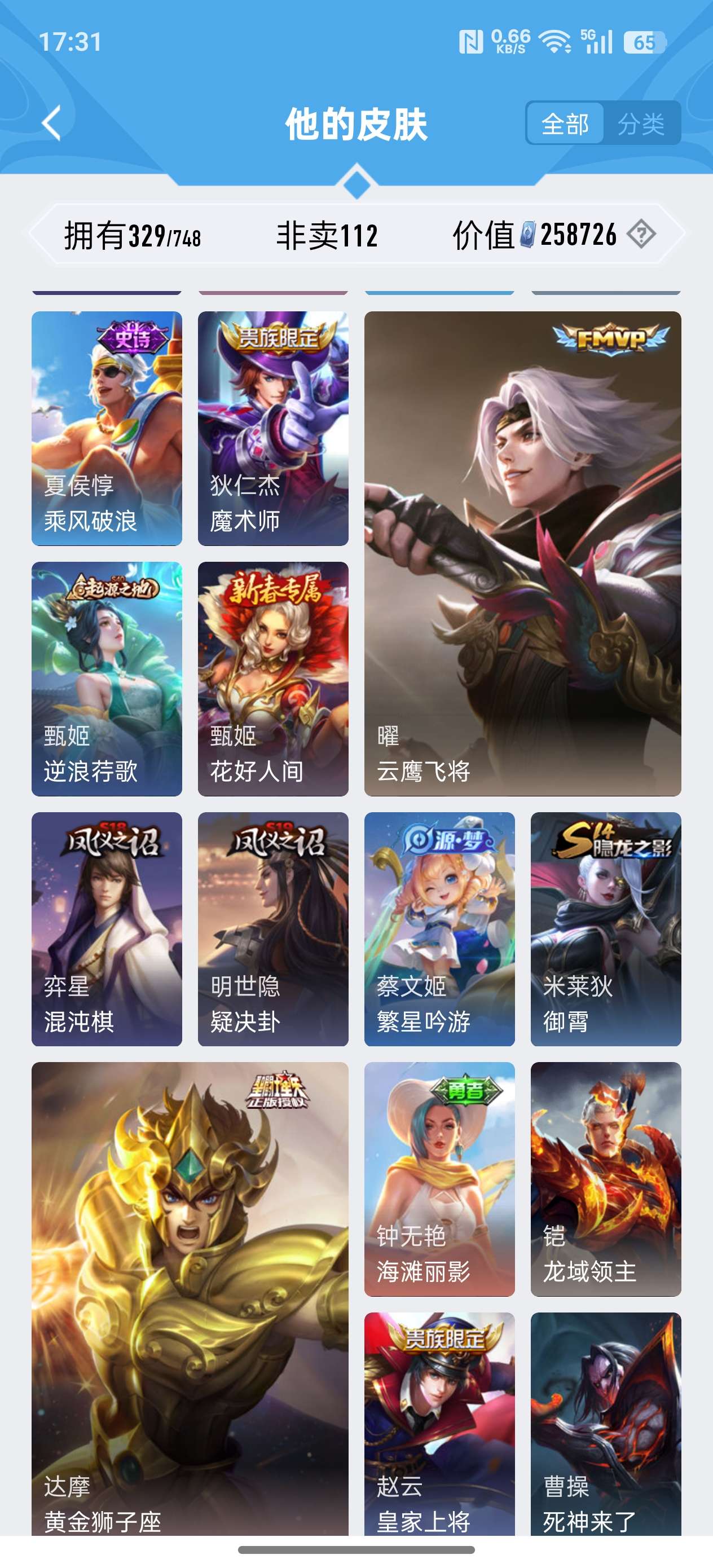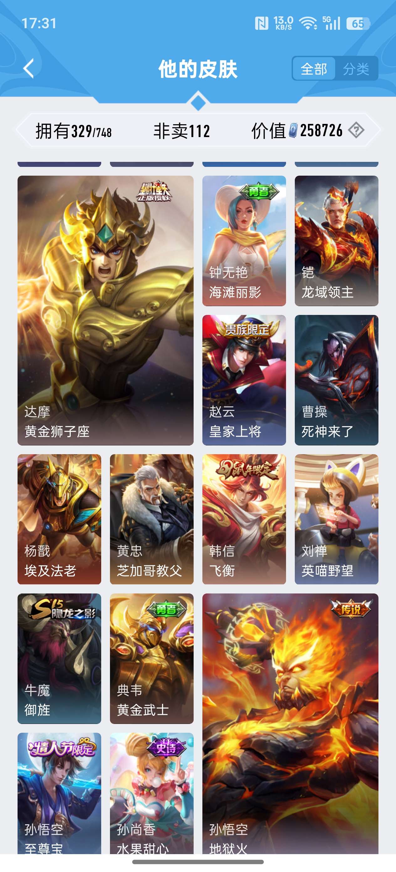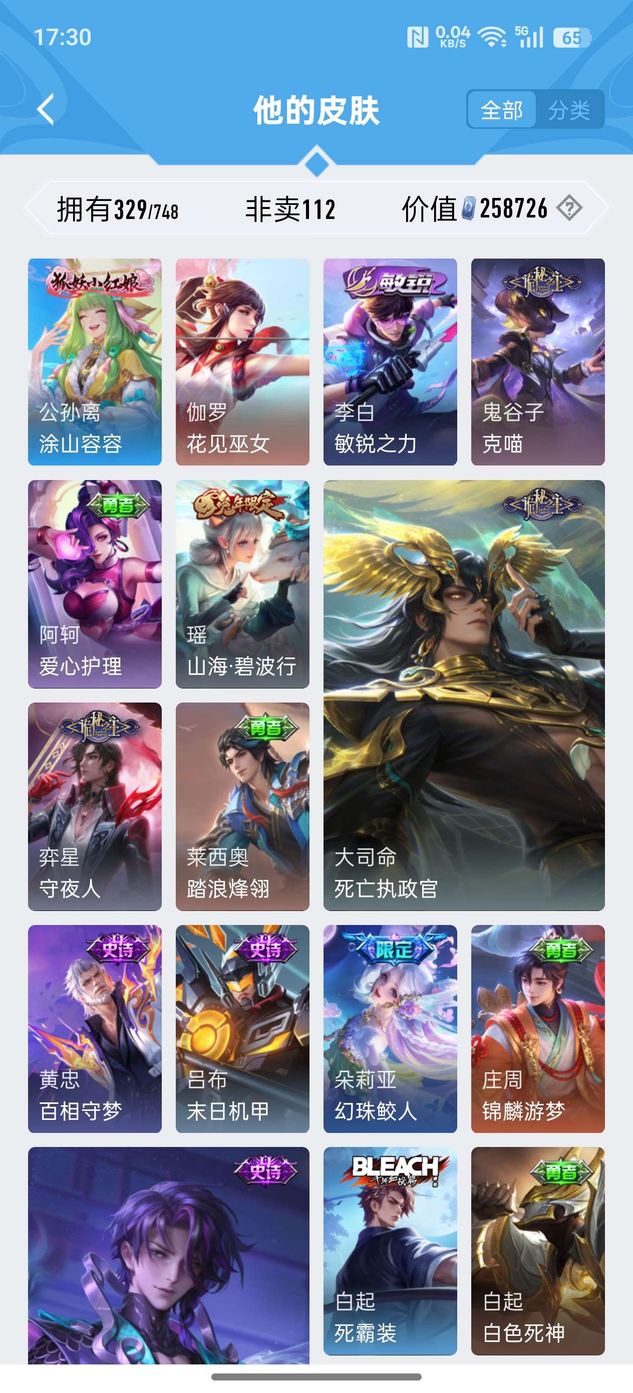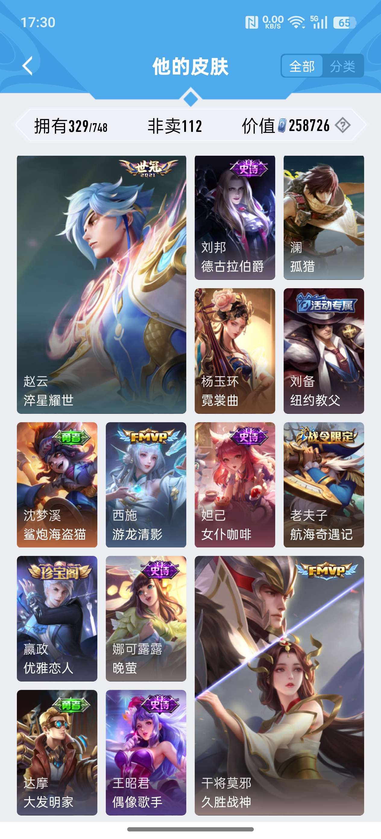 苹果v/无双王者/329皮肤/126英雄/1典藏/0珍品无双/2无双/2珍品传说/36传说/92史