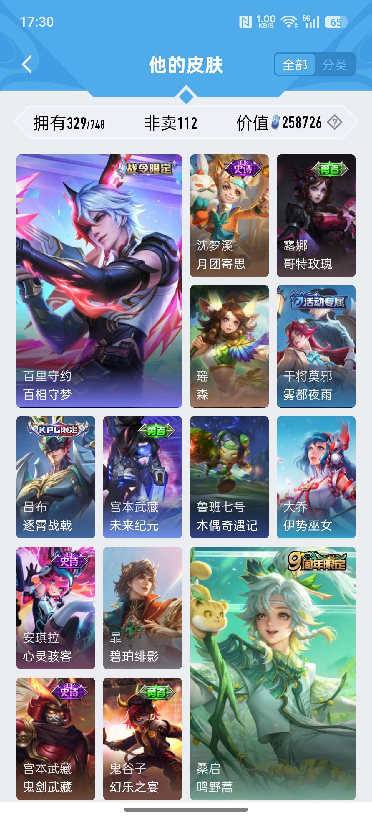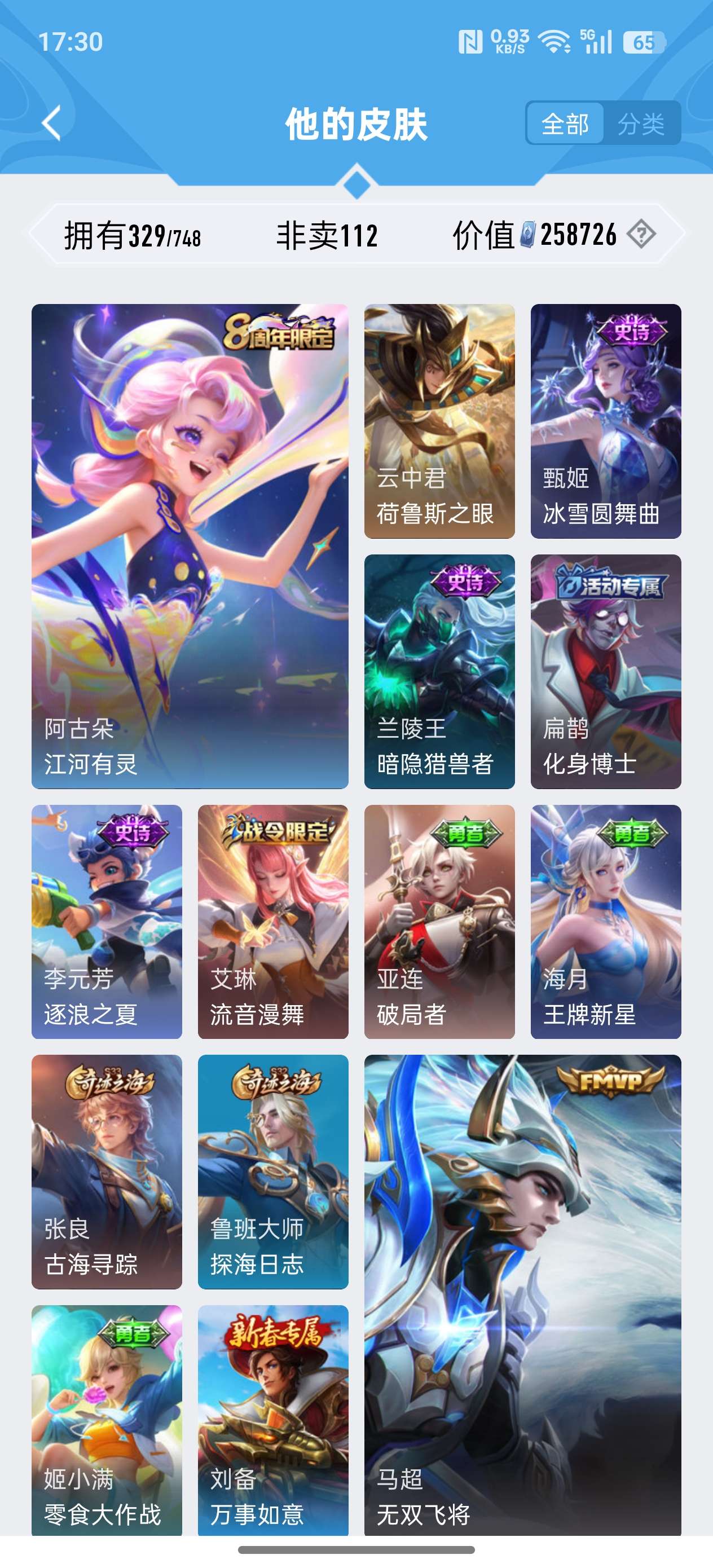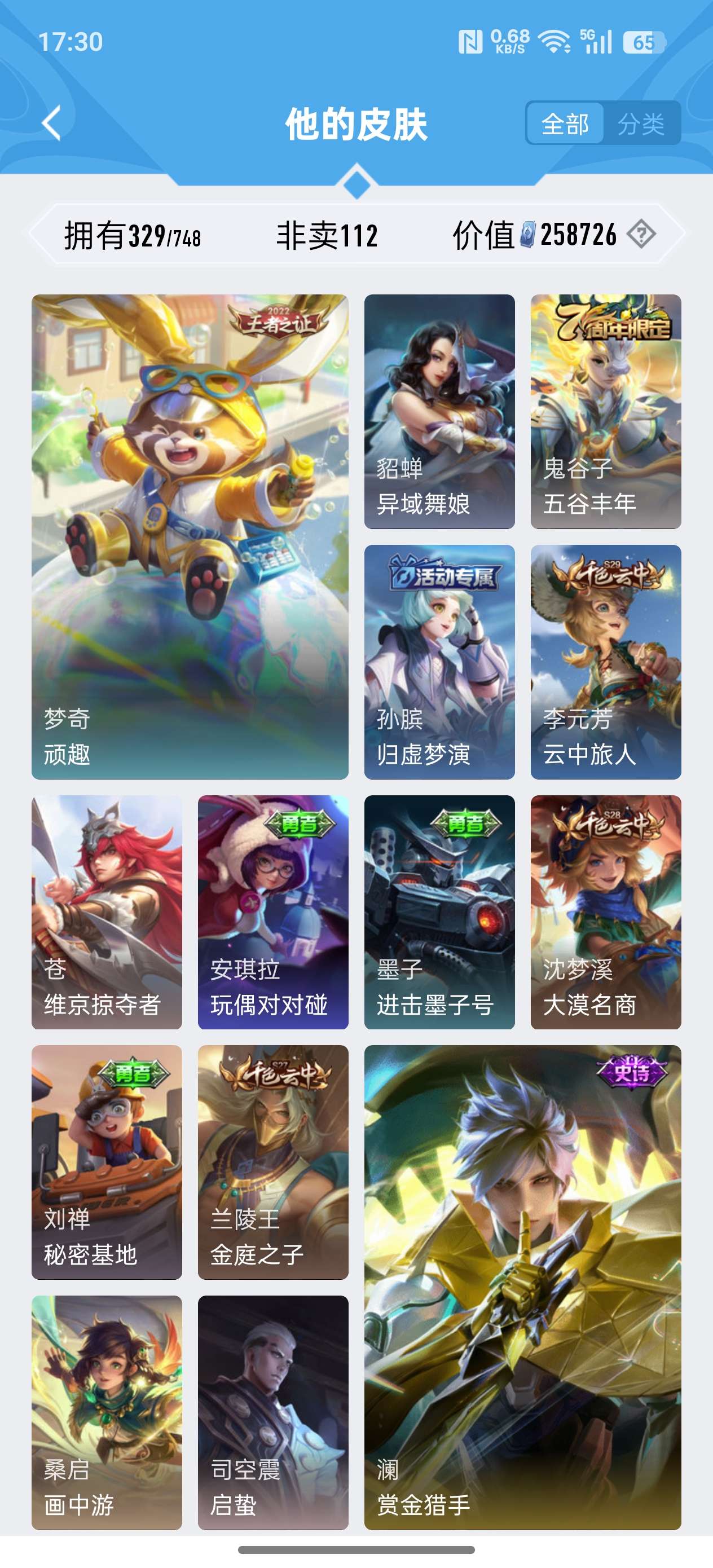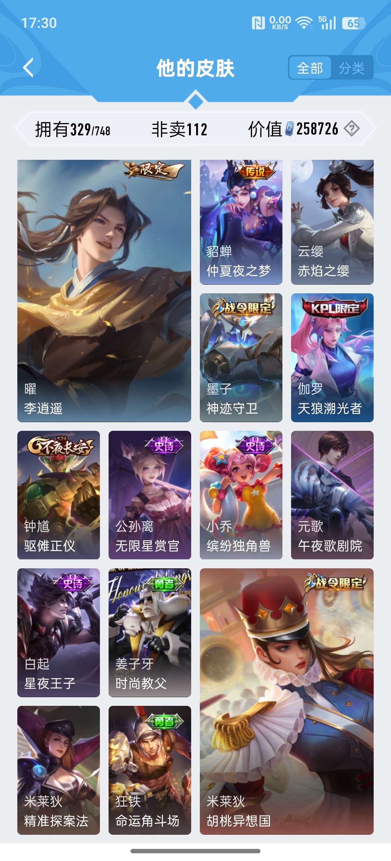 苹果v/无双王者/329皮肤/126英雄/1典藏/0珍品无双/2无双/2珍品传说/36传说/92史
