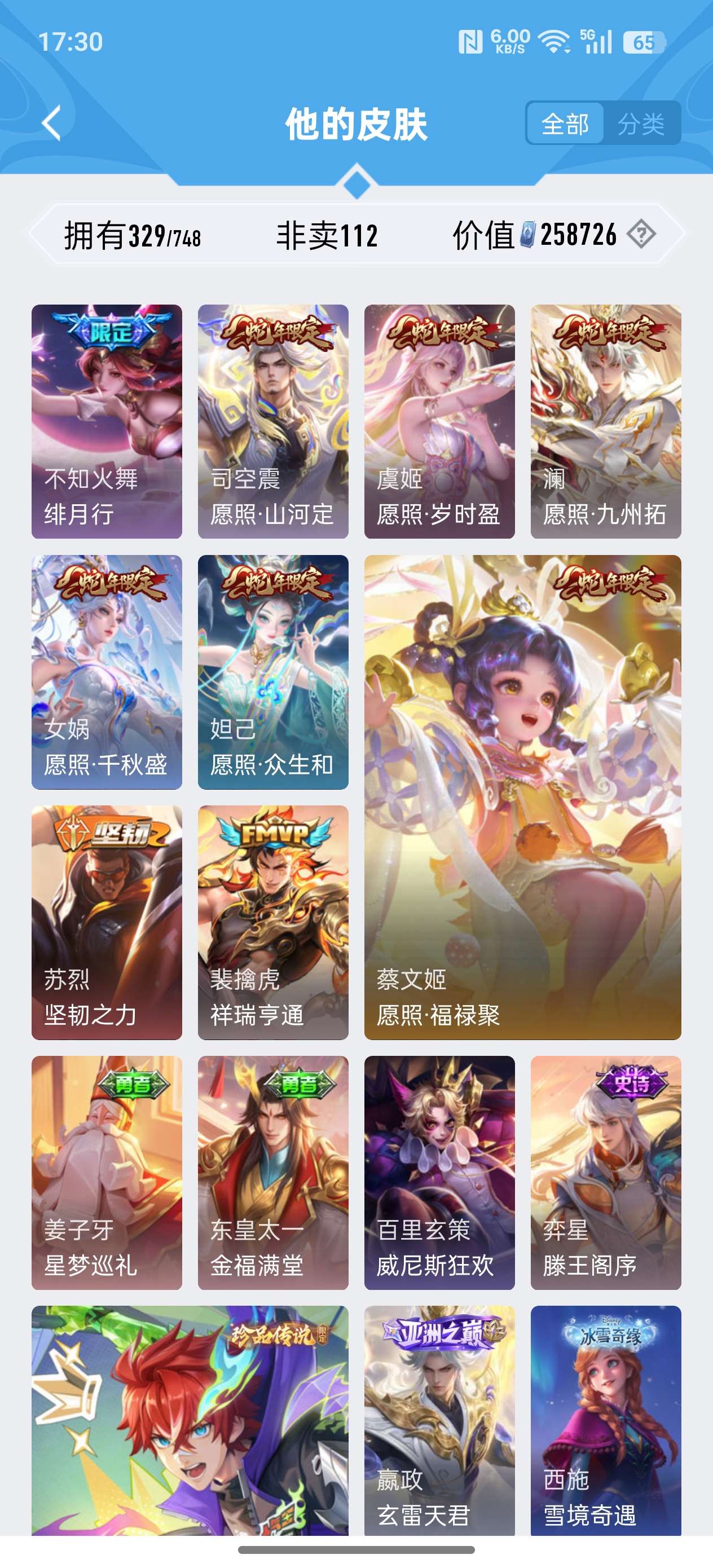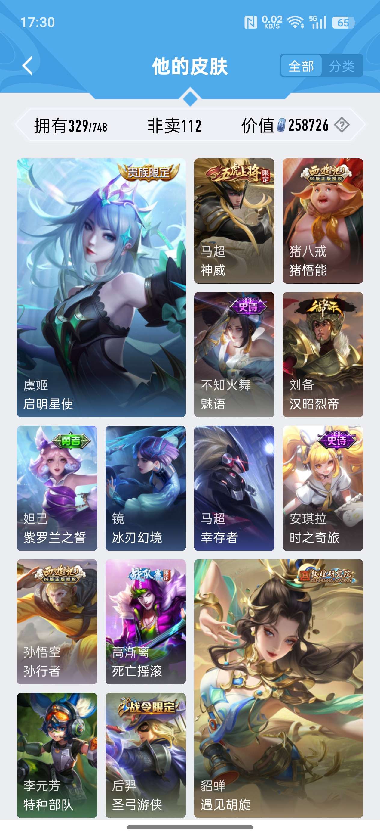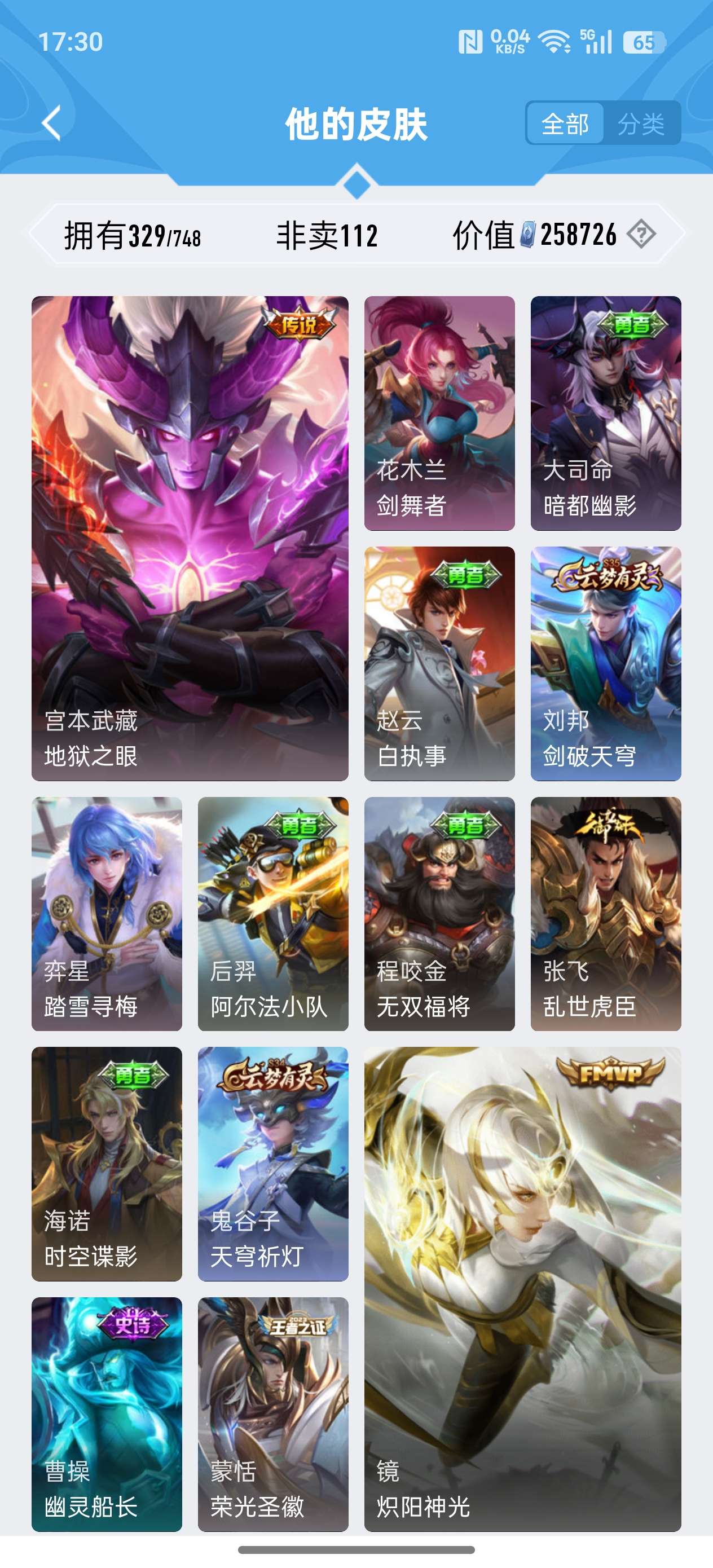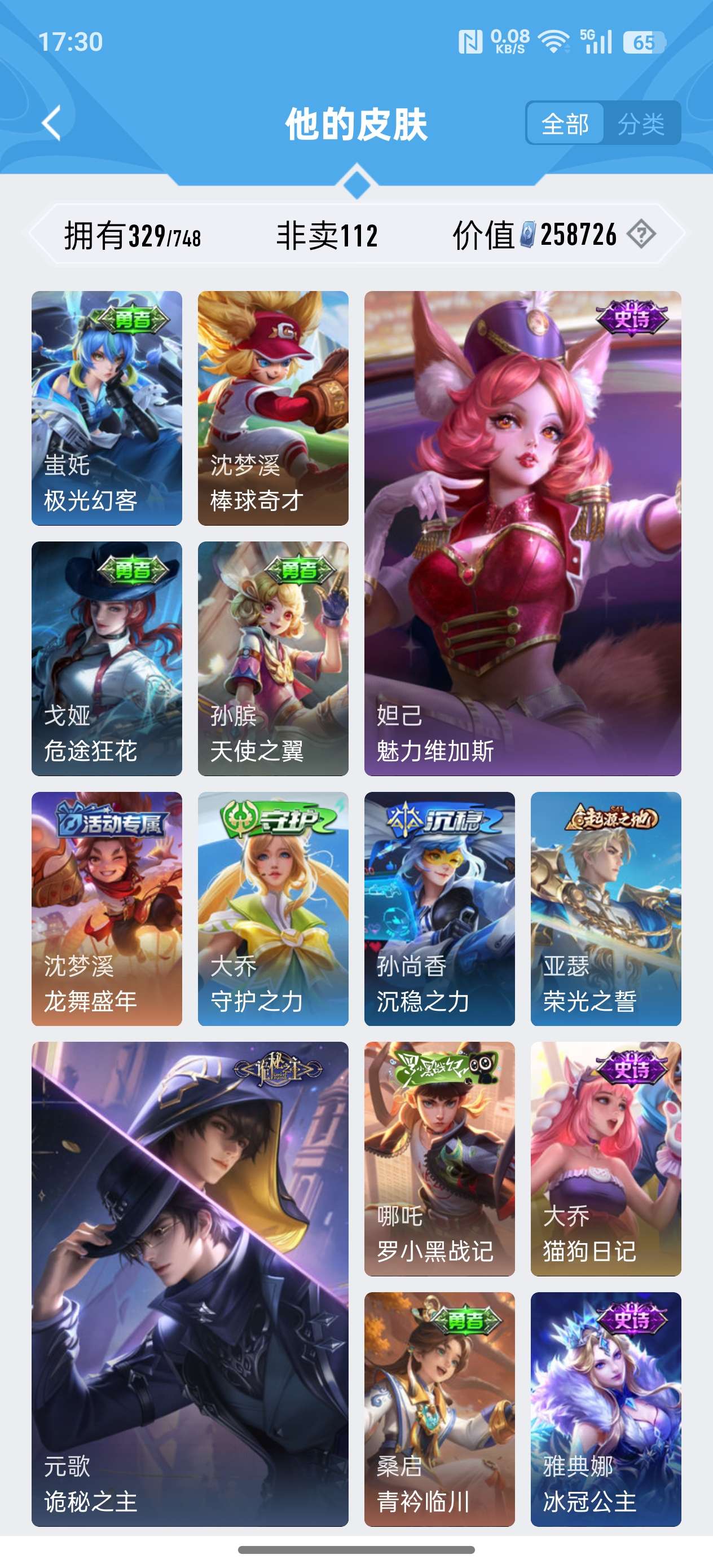 苹果v/无双王者/329皮肤/126英雄/1典藏/0珍品无双/2无双/2珍品传说/36传说/92史