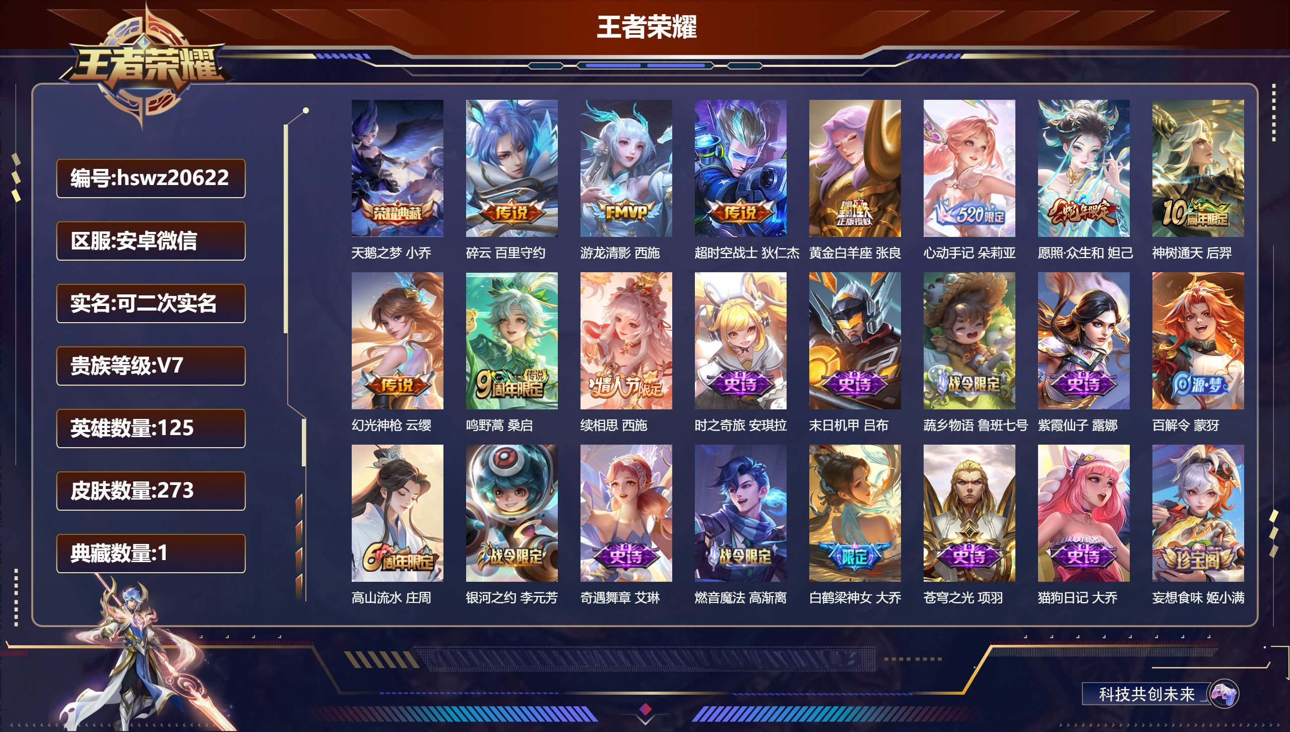 安卓v/永恒钻石/273皮肤/125英雄/1典藏/0珍品无双/0无双/0珍品传说/10传说/84史