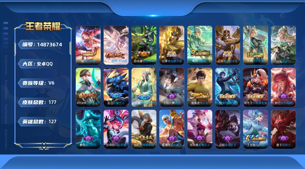 14873674】[14873674]【精品号手慢无】2025年12月27日后可换绑。发育路56段,对抗路34段,5个高战力金标,万战后羿万战黄忠,瑶典藏拾光映像,6传说,限定愿照·岁时盈,引擎之心,山海·玄木吟,花多,高质量射手号!。。