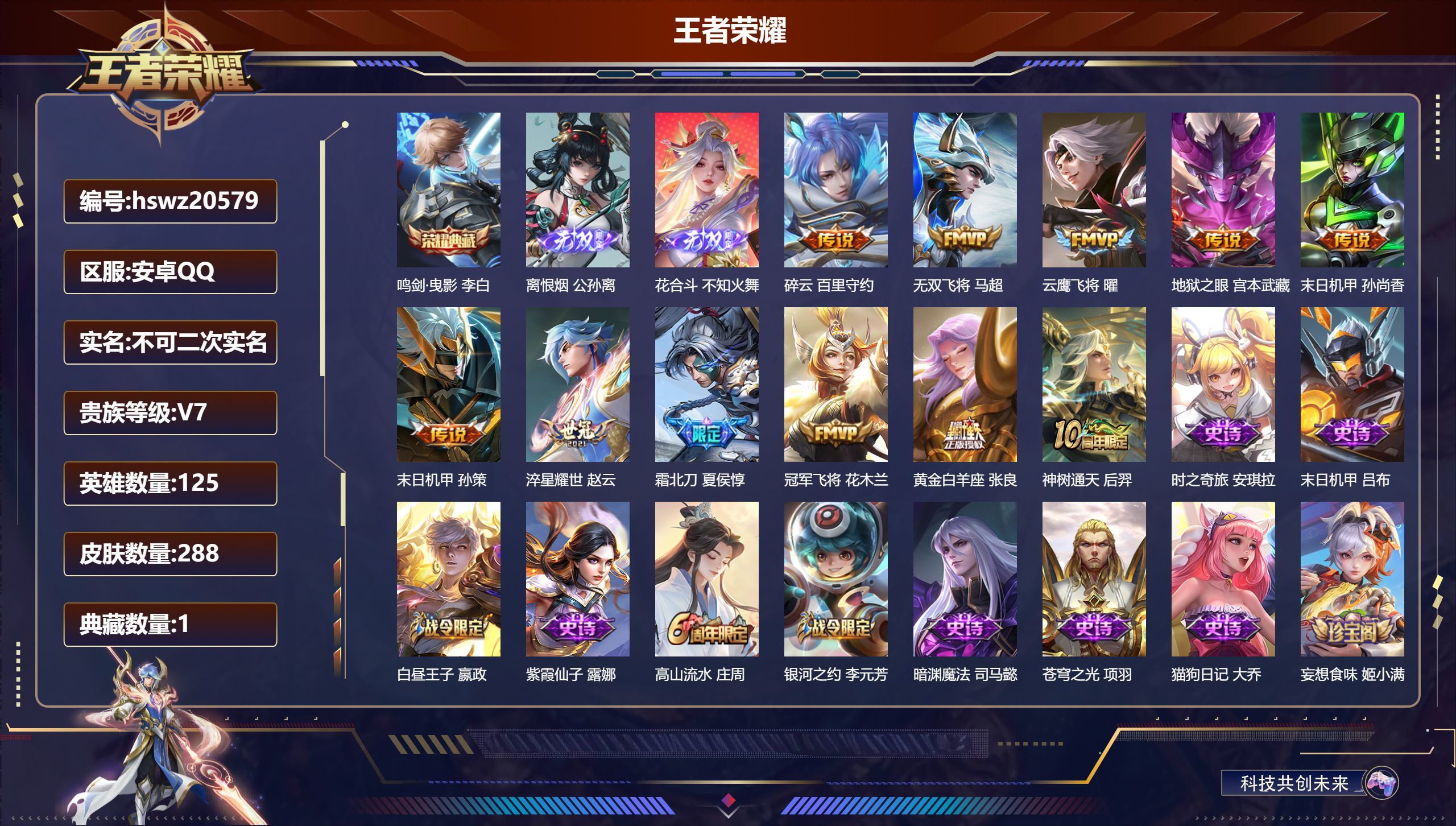 安卓QQ/绝世王者/288皮肤/125英雄/1典藏/0珍品无双/2无双/0珍品传说/11传说/83史