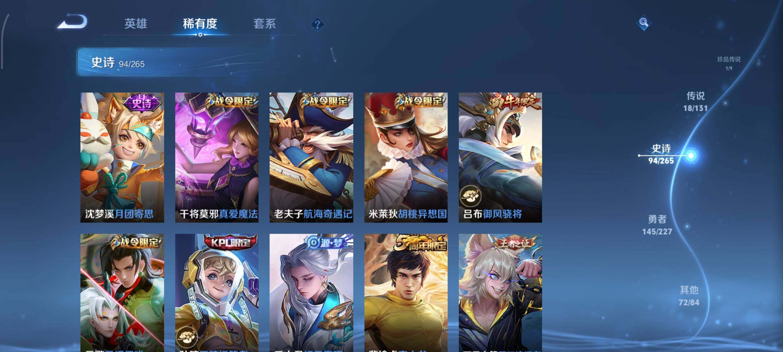 /安卓Q-V8-最强王者段位-126英雄-332皮肤-2典藏皮肤-1珍品传说-18传说-94史诗