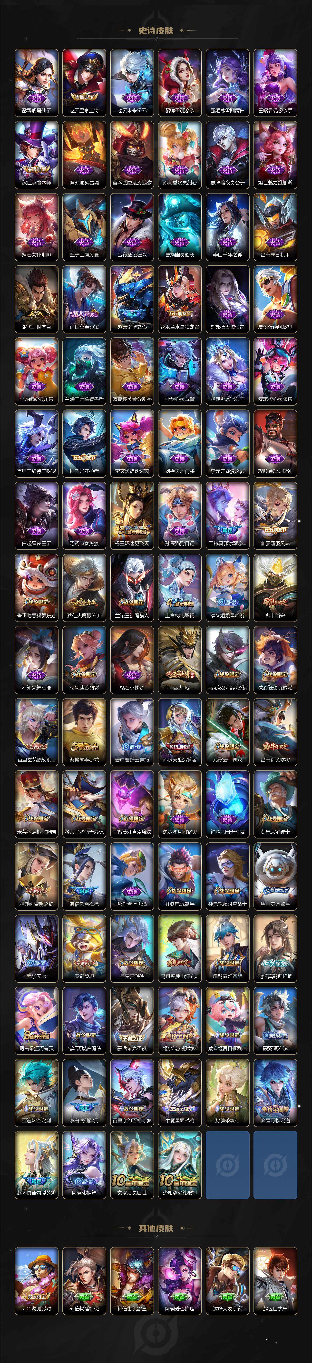 【传说皮肤】:司空震愿照山河定,澜愿照九州拓,云缨幻光神枪,嬴政玄雷天君,桑启鸣野蒿,云缨鹤归松栖,马超无双飞将,赵云淬星耀世,诸葛