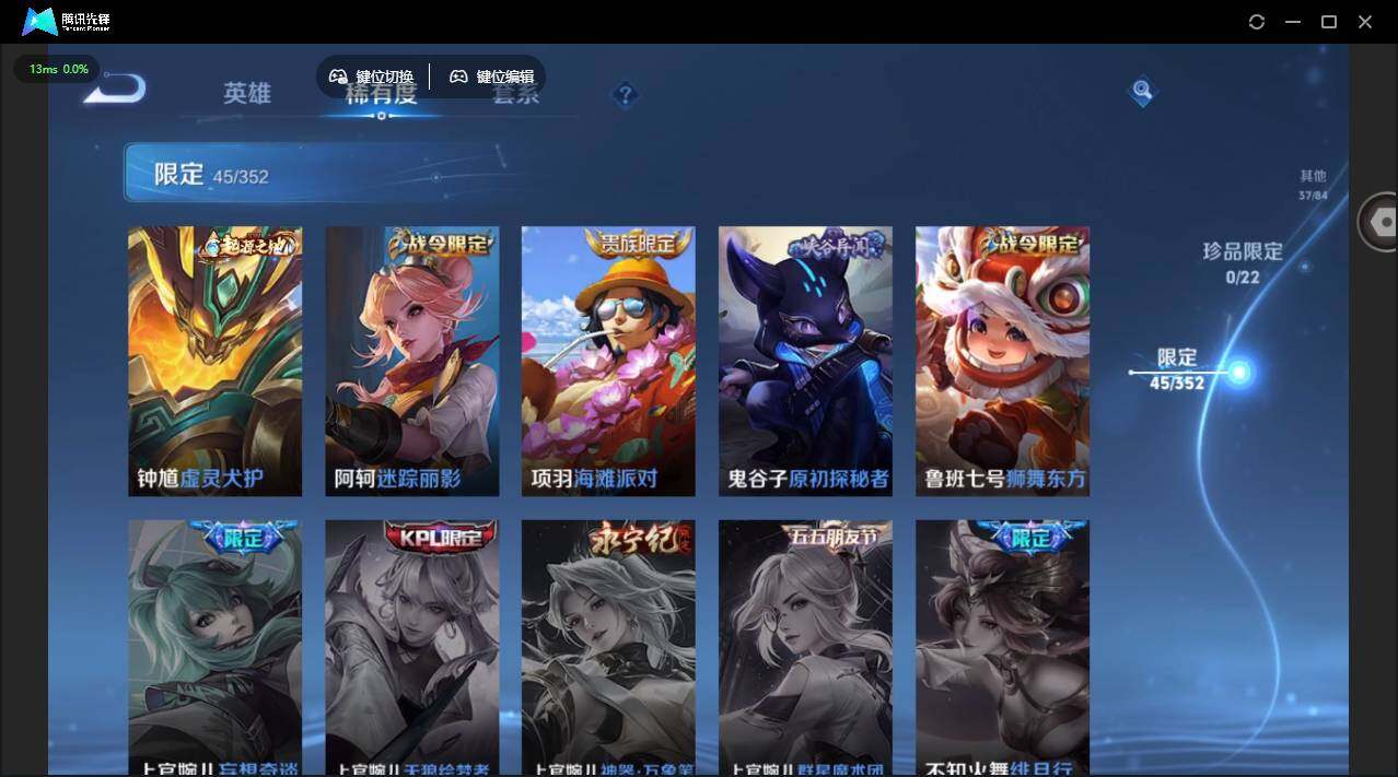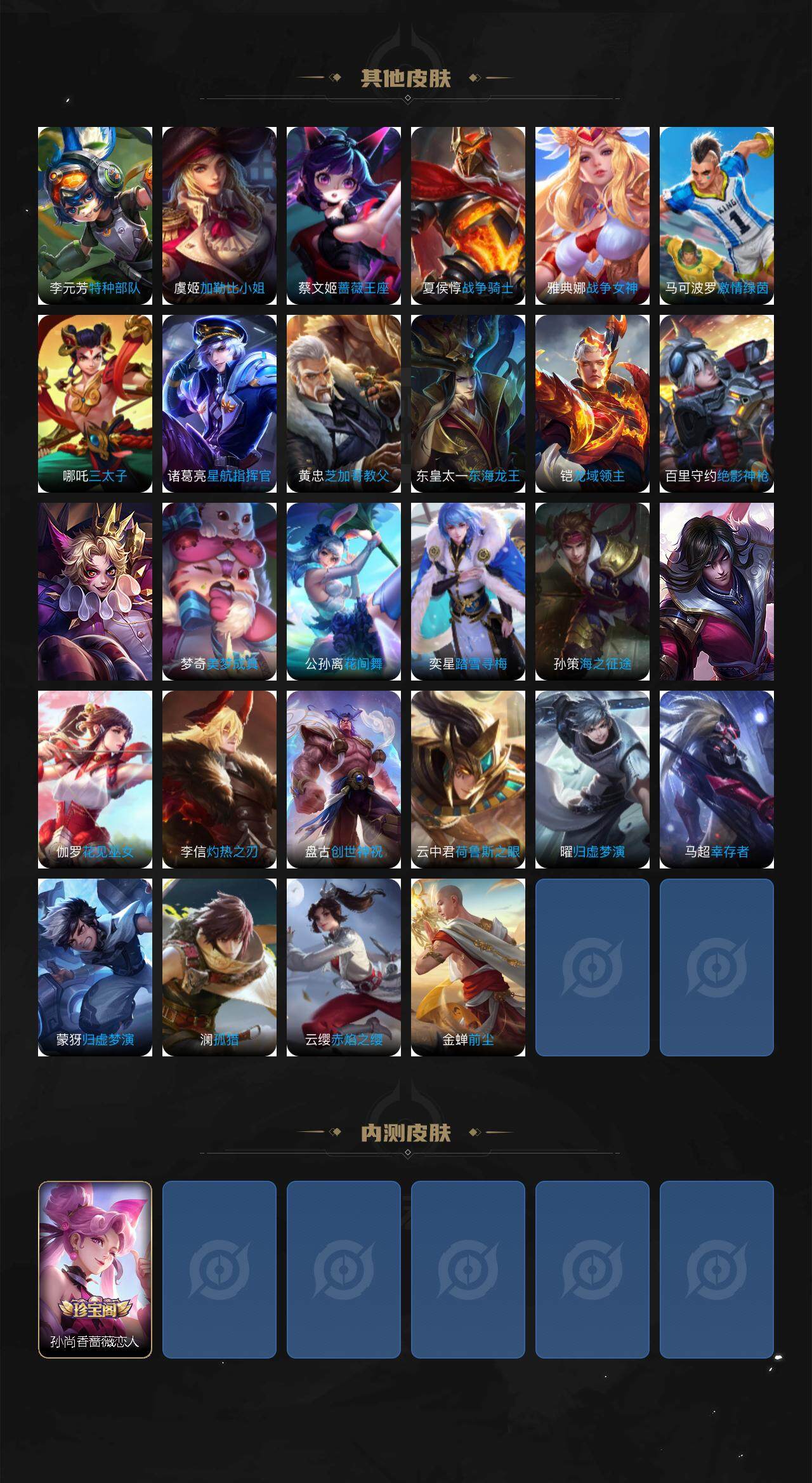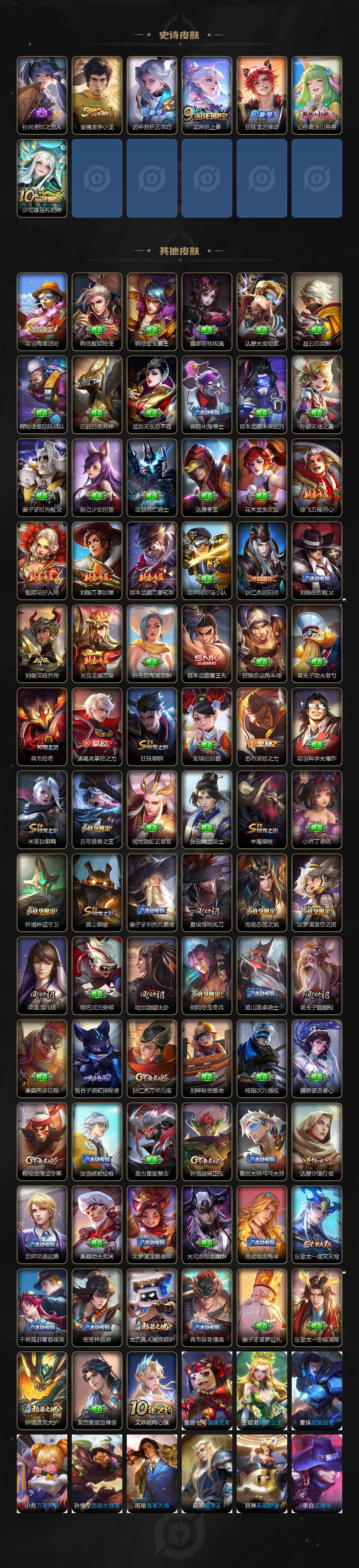 【限定皮肤】:狄仁杰阴阳师,赵云皇家上将,妲己时之彼端,孙尚香蔷薇恋人,鲁班七号狮舞东方,阿轲迷踪丽影,吕布猎兽之王,周瑜赤莲之焰,夏侯惇朔风刀,典韦穷奇,狄仁杰万华元夜,达摩沙漠行僧,项羽海滩派对,老夫子醍醐杖,程咬金演