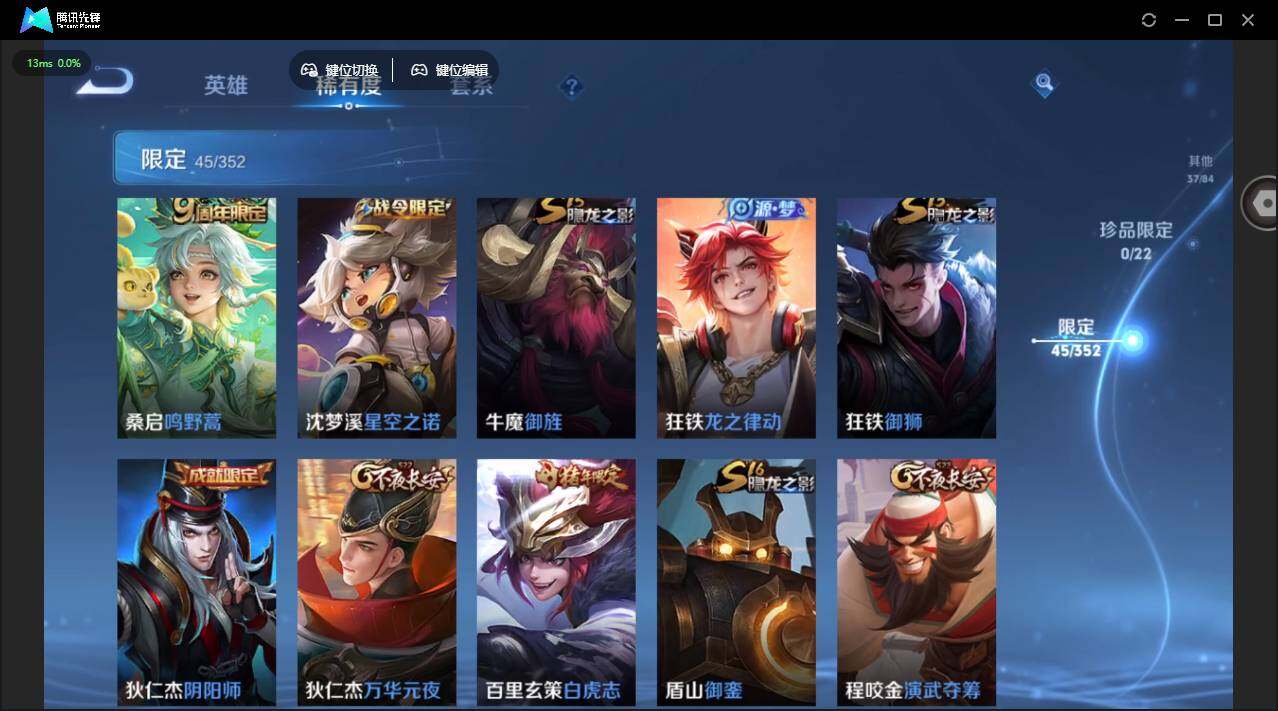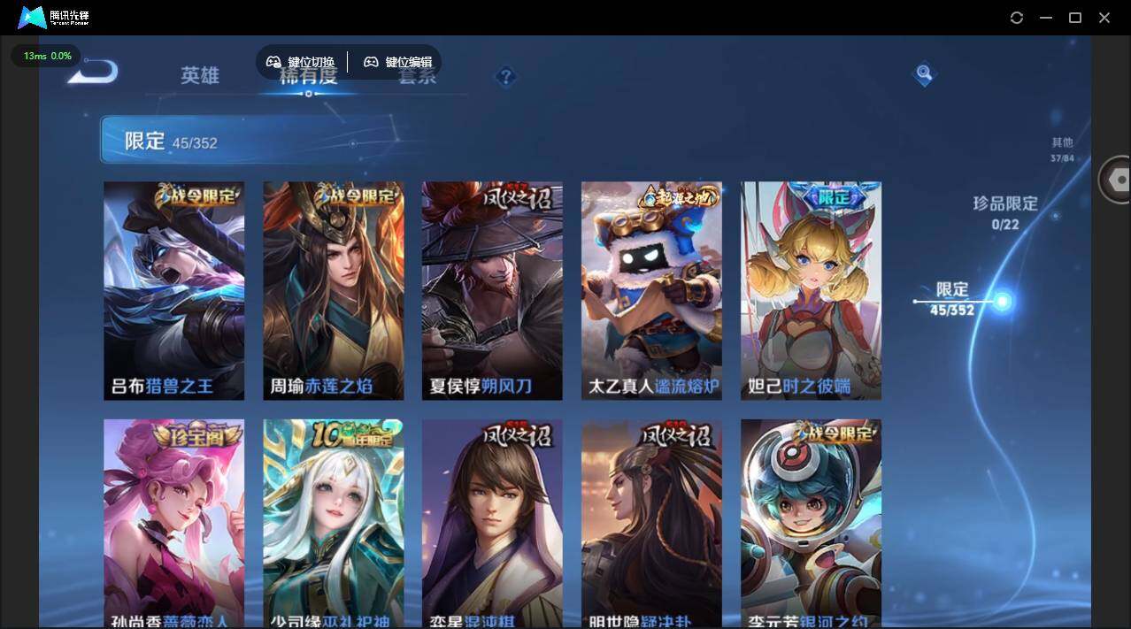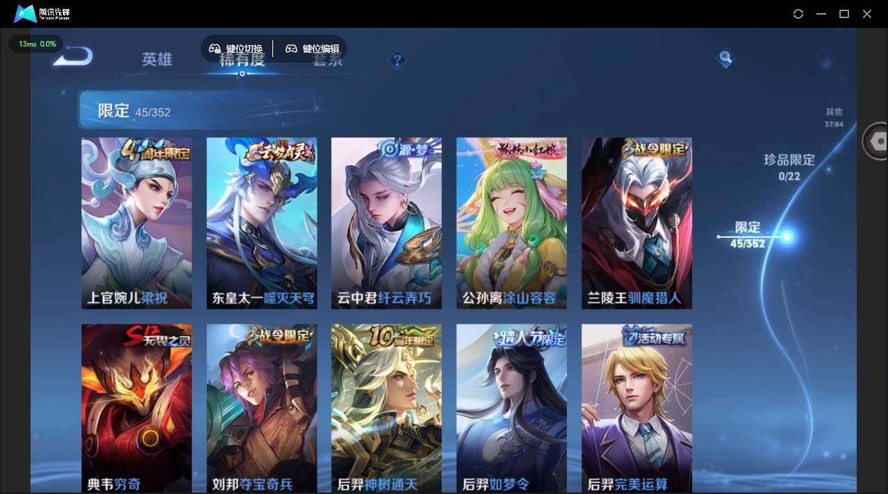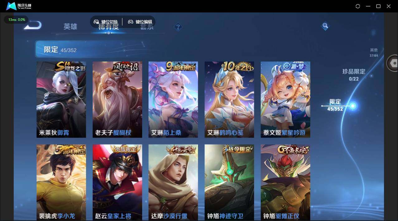【限定皮肤】:狄仁杰阴阳师,赵云皇家上将,妲己时之彼端,孙尚香蔷薇恋人,鲁班七号狮舞东方,阿轲迷踪丽影,吕布猎兽之王,周瑜赤莲之焰,夏侯惇朔风刀,典韦穷奇,狄仁杰万华元夜,达摩沙漠行僧,项羽海滩派对,老夫子醍醐杖,程咬金演