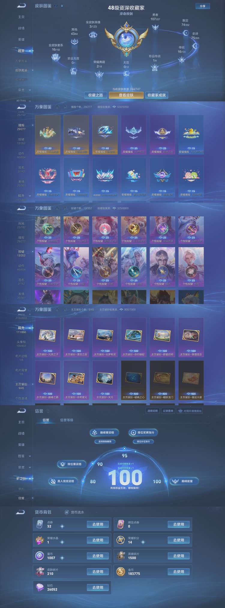 V8 典藏4(未兑1个) 珍品传说1星元皮肤4 传说16 星元套装9史诗75 皮肤数量244