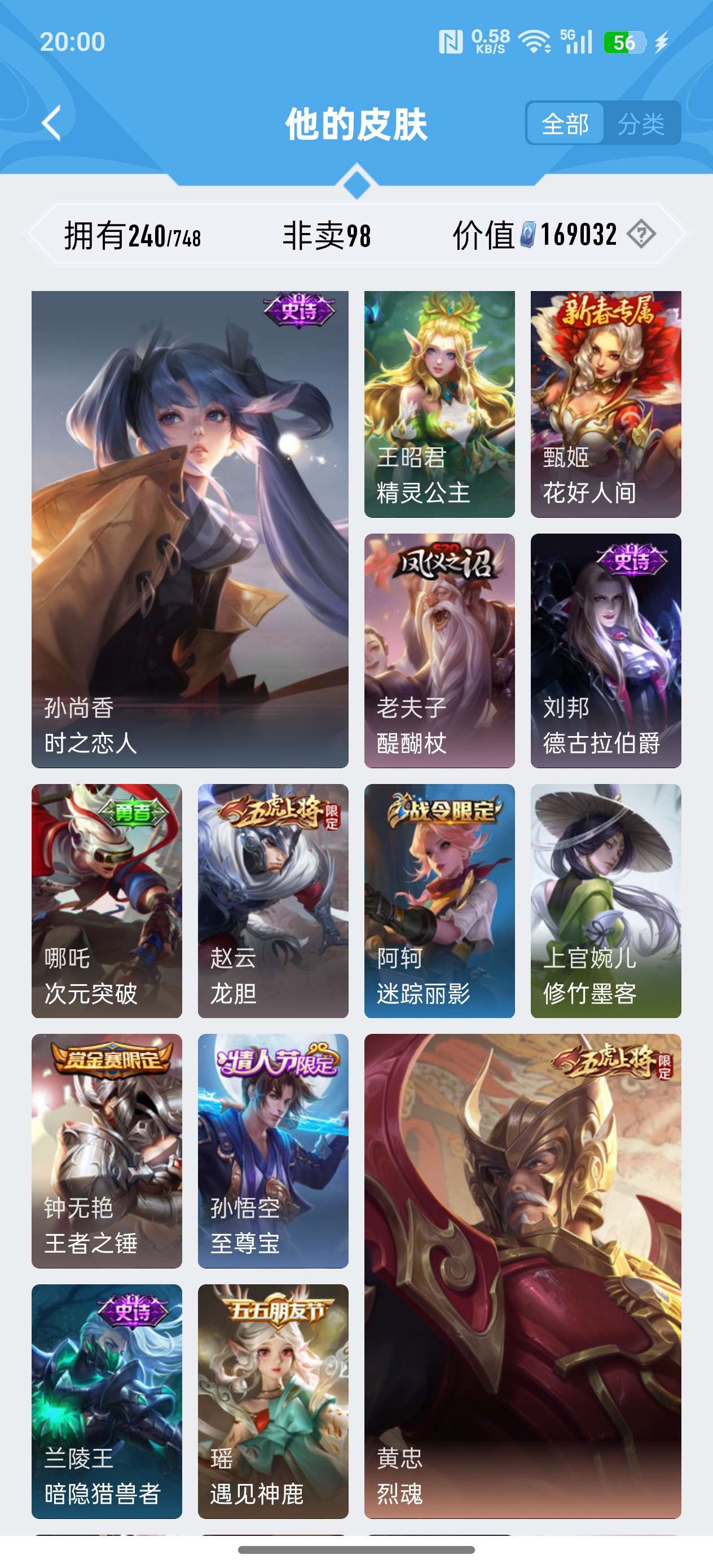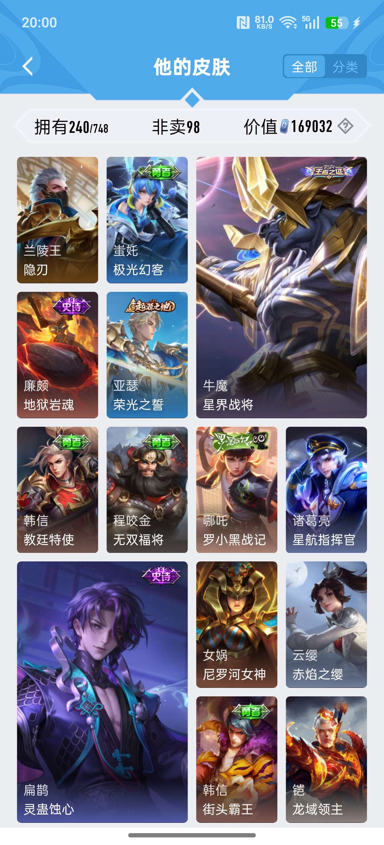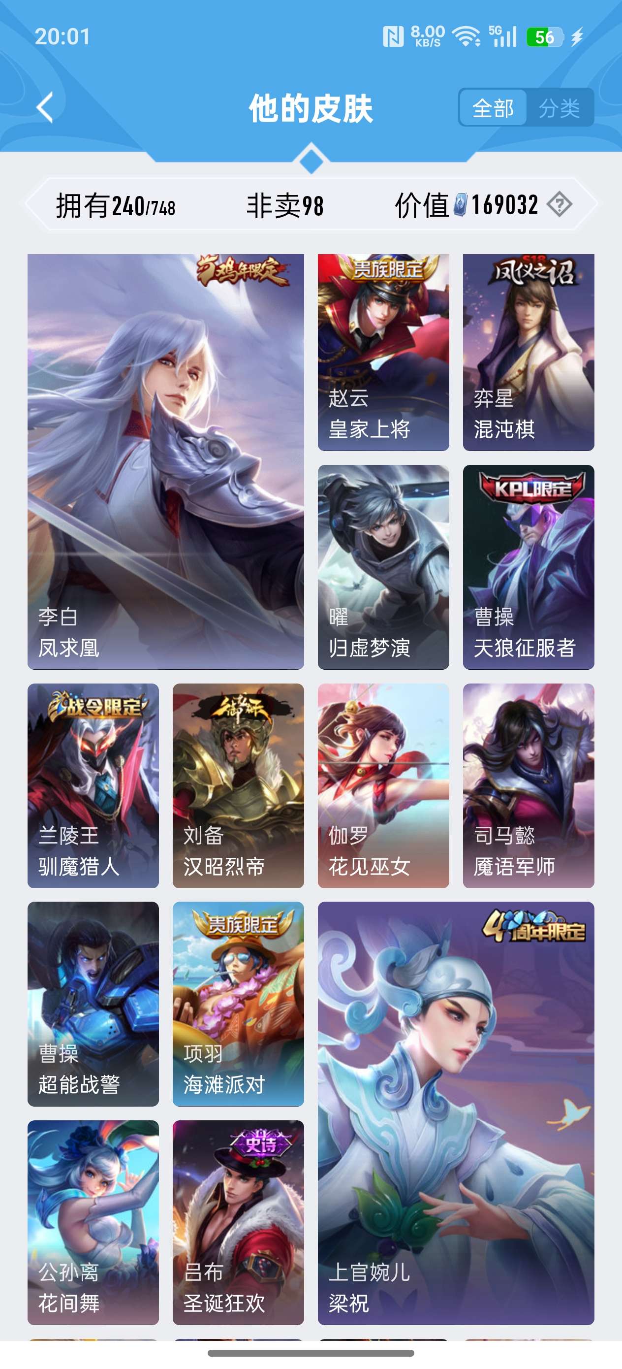 苹果QQ/荣耀王者/240皮肤/125英雄/1典藏/0珍品无双/2无双/1珍品传说/11传说/72史