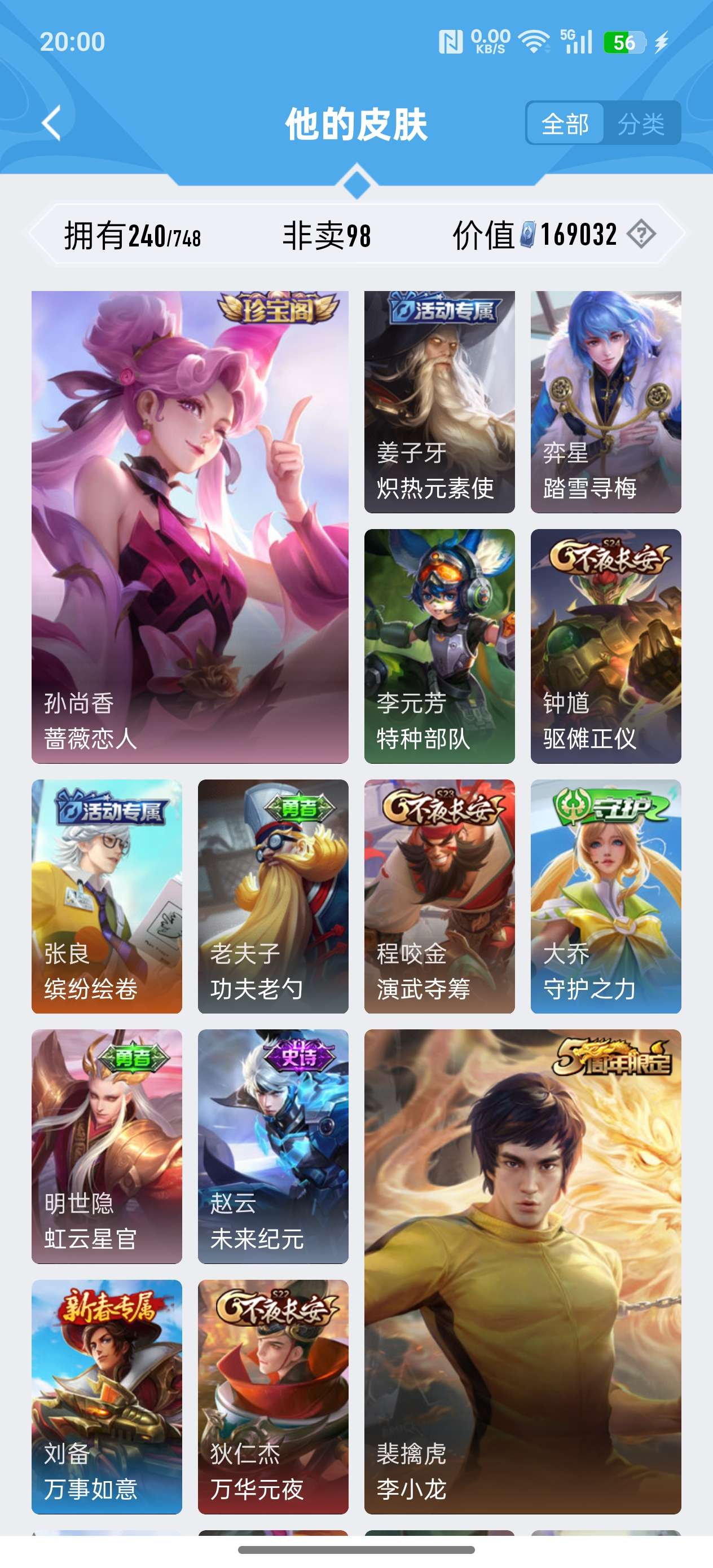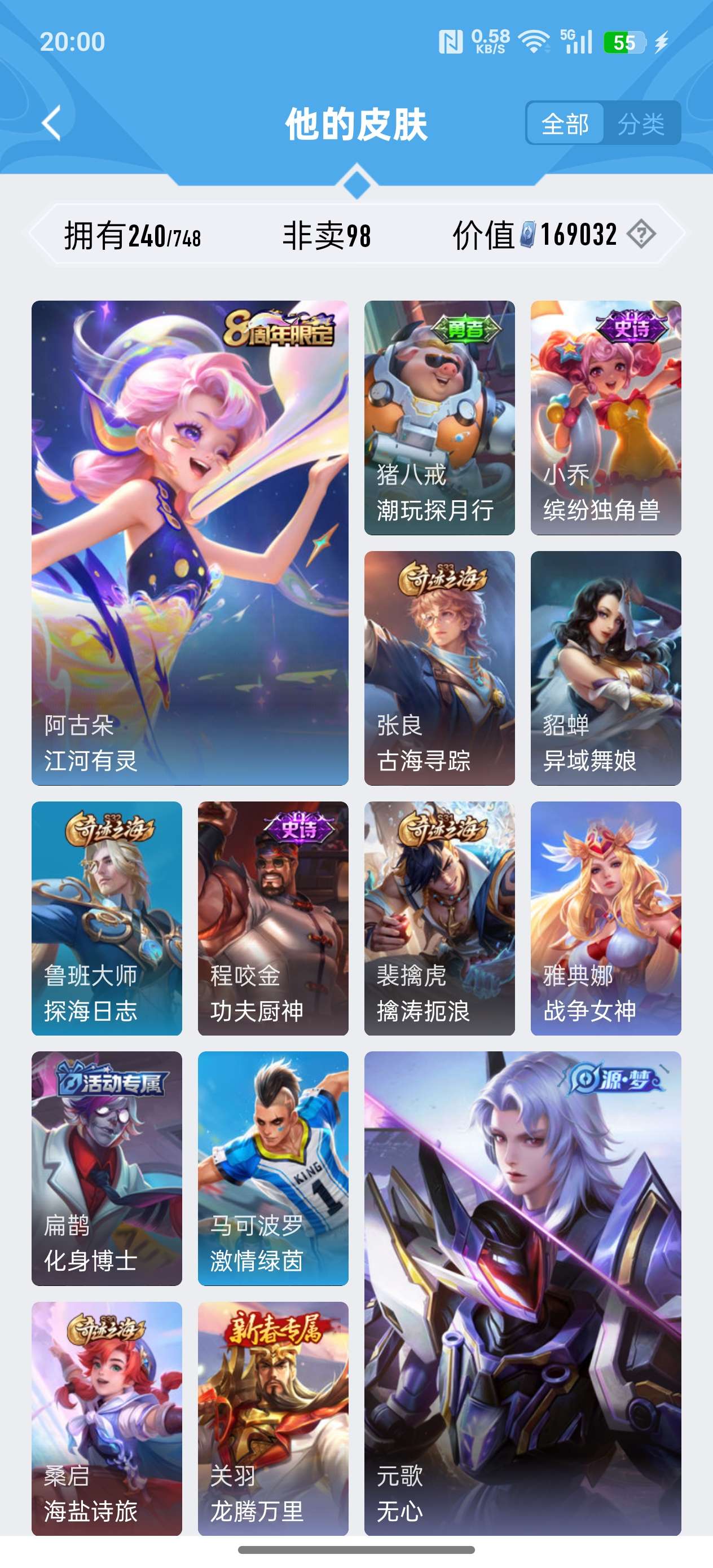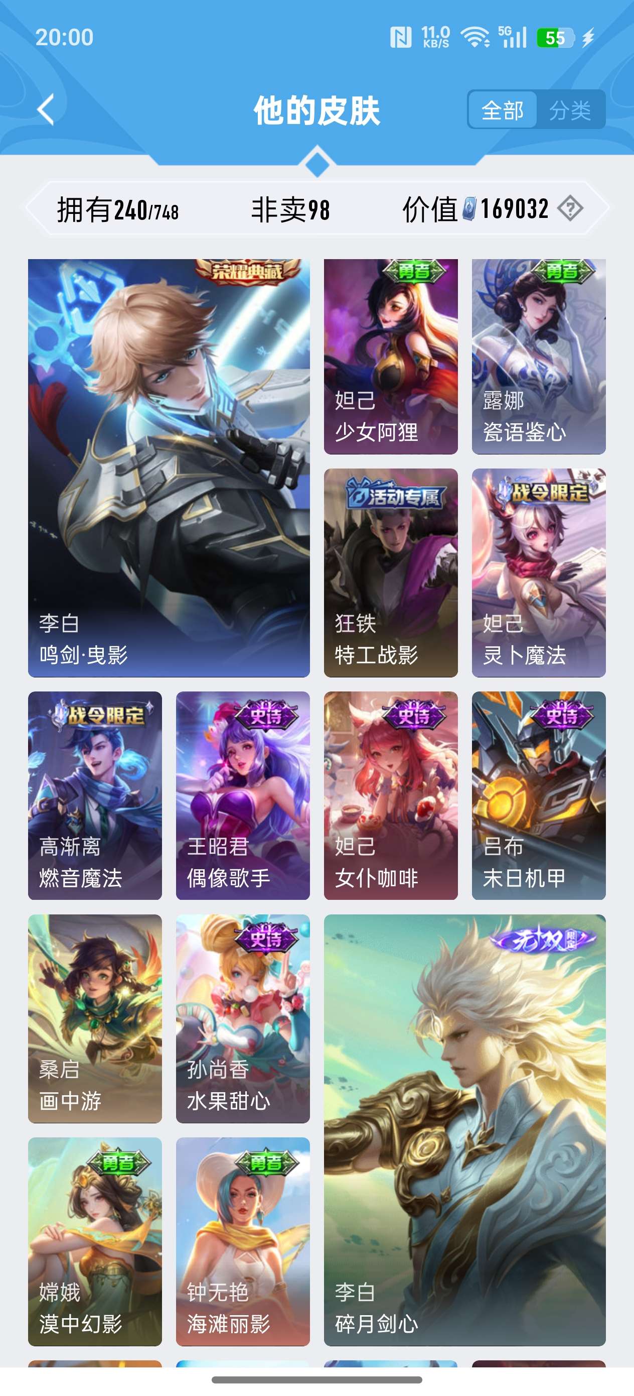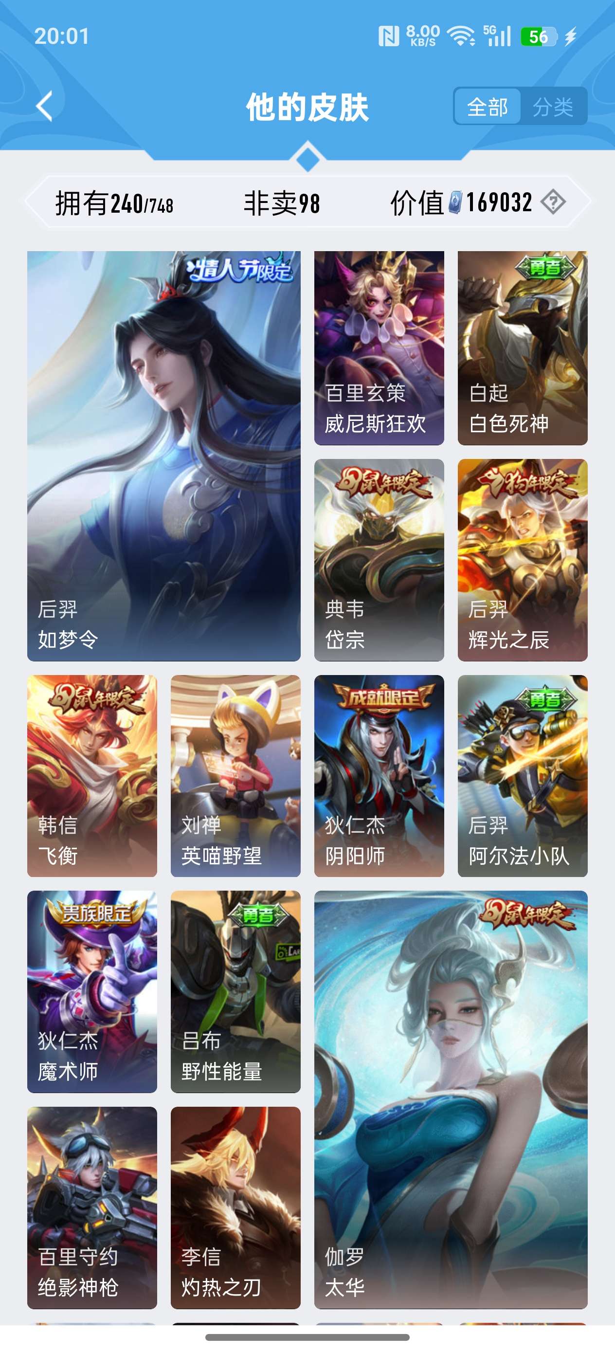 苹果QQ/荣耀王者/240皮肤/125英雄/1典藏/0珍品无双/2无双/1珍品传说/11传说/72史