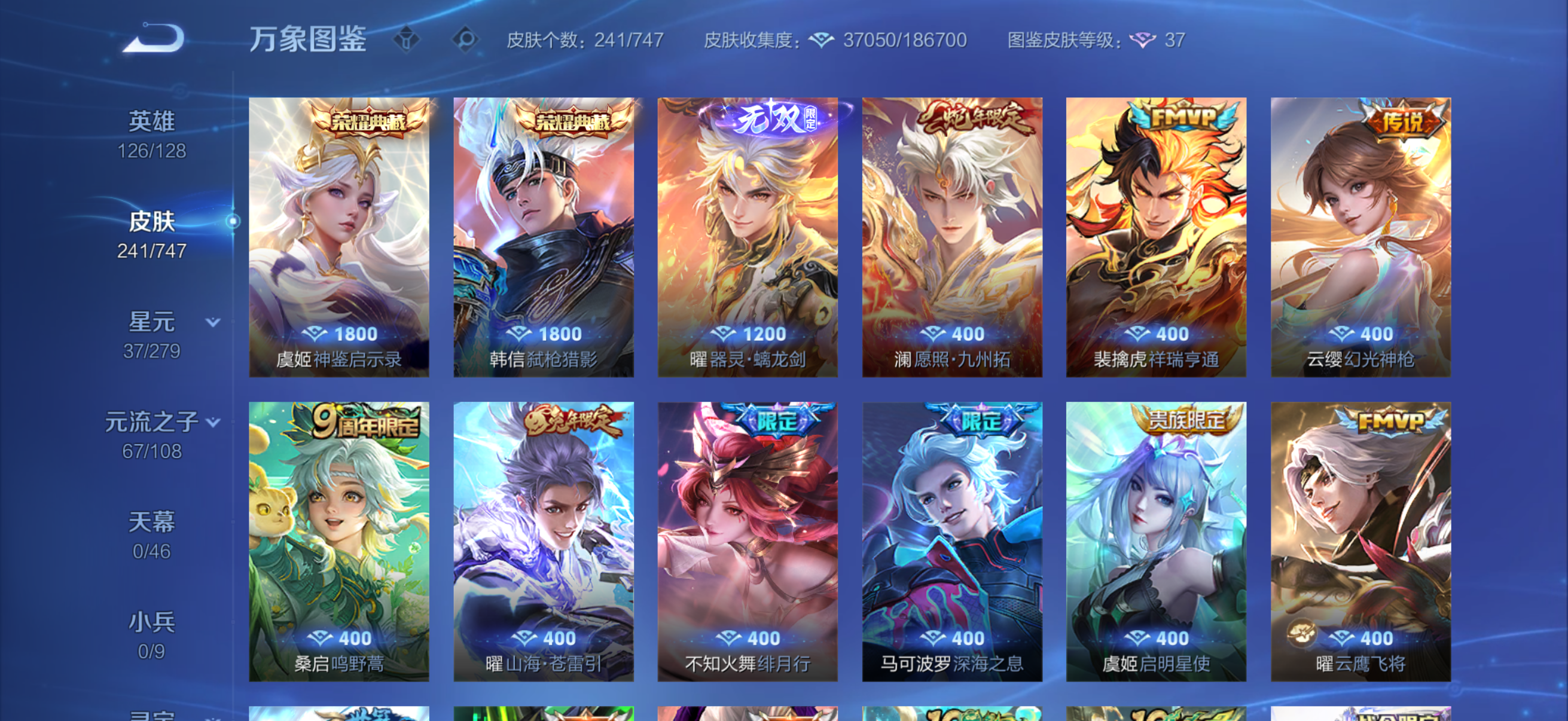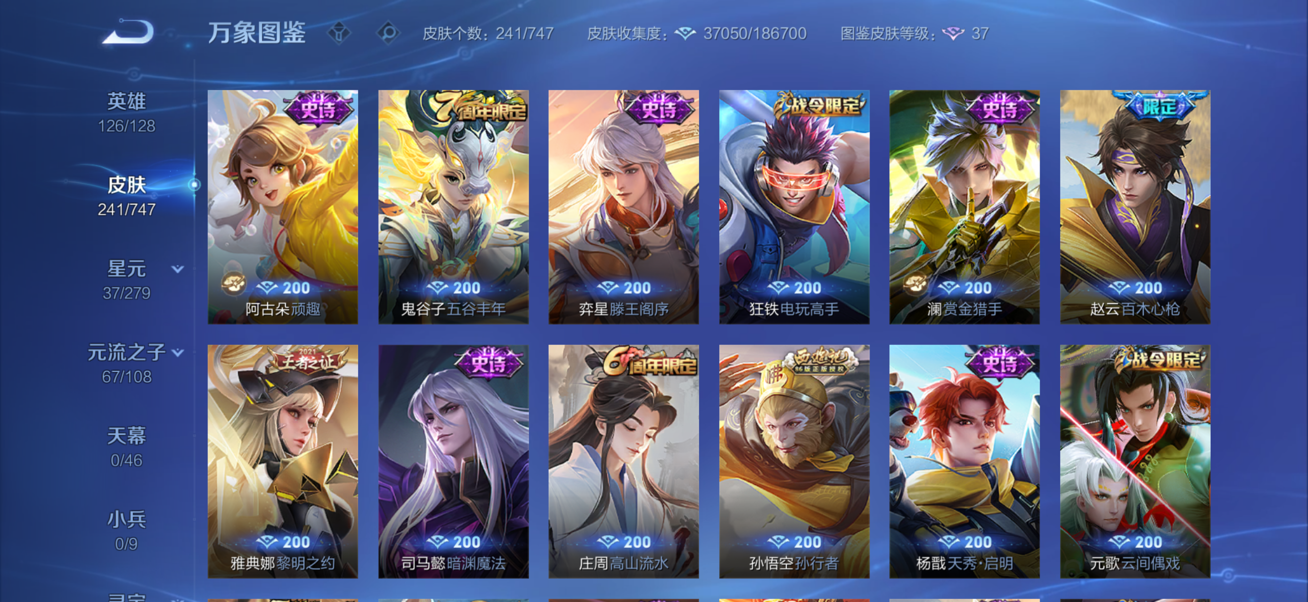 苹果QQ 皮肤241 英雄126 典藏2 无双1 传说12 其他皮肤85 传奇王者-v8 6个省标 有百星印记 最高英雄战力1万2