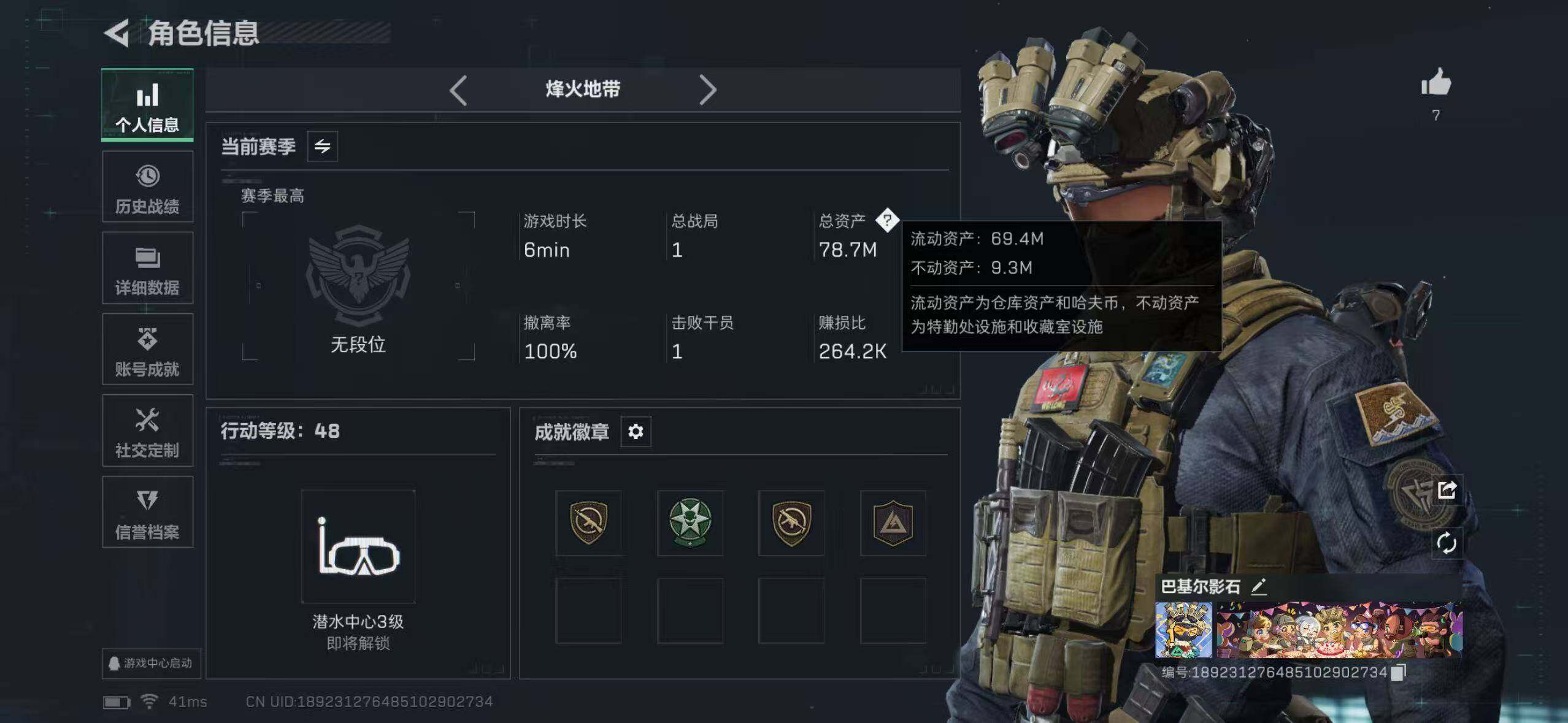【SJ688】78m总资产-69287k哈伏币-48烽火等级-青铜-4战场等级-无军衔