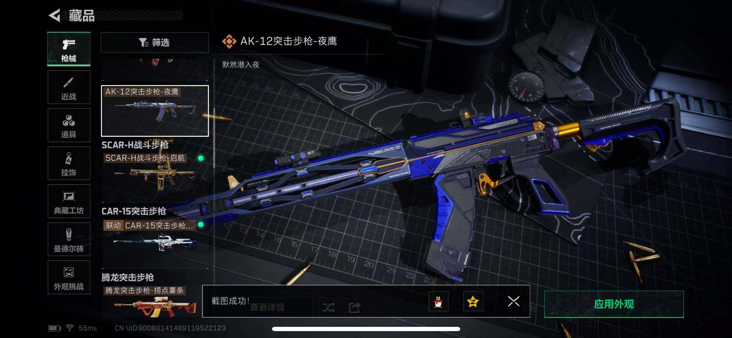 【传说外观】:M4A1突击步枪-阿米娅,ASh-12战斗步枪-鹅鸭杀,SG552突击步枪-运动员,AK-12突击步枪-夜鹰,AK-12突击步枪-特斯拉线圈,SCA