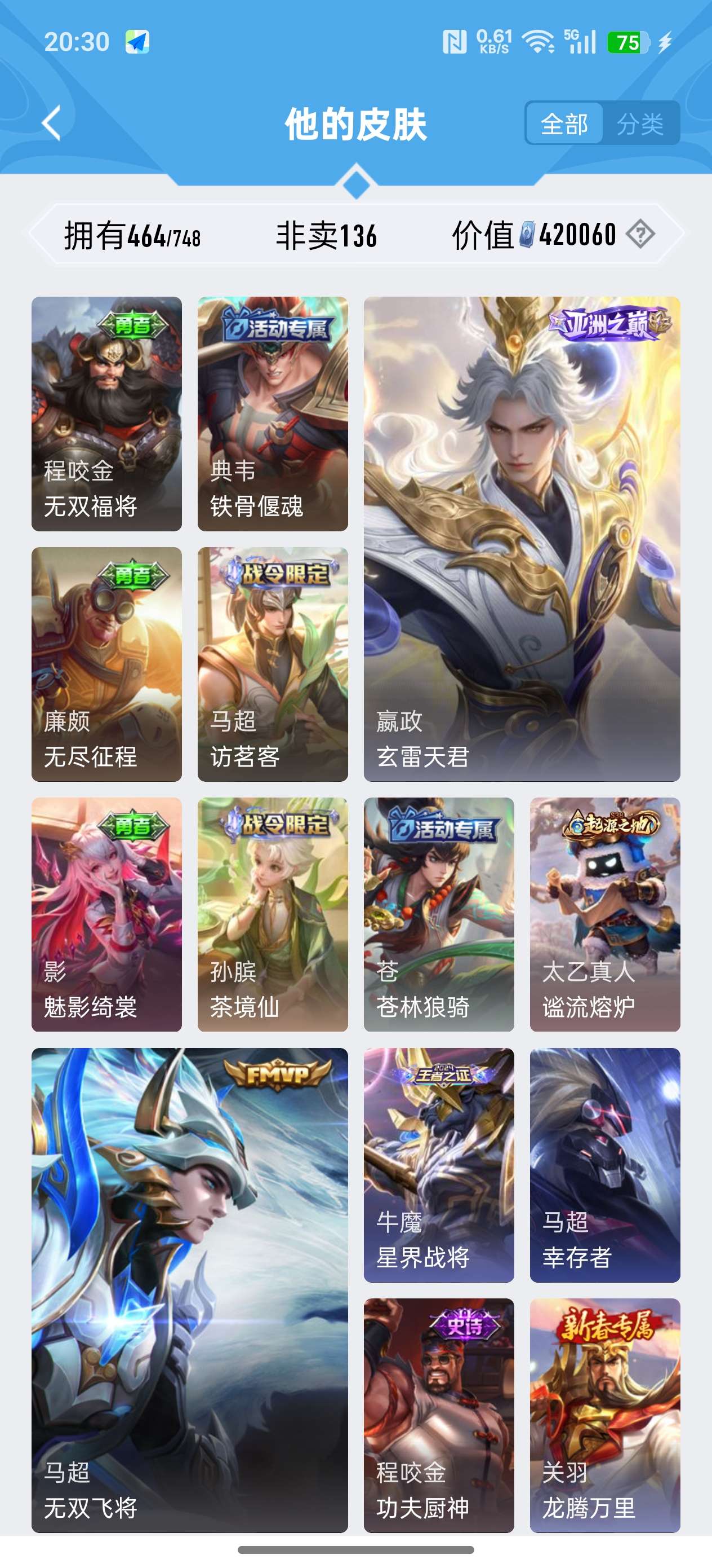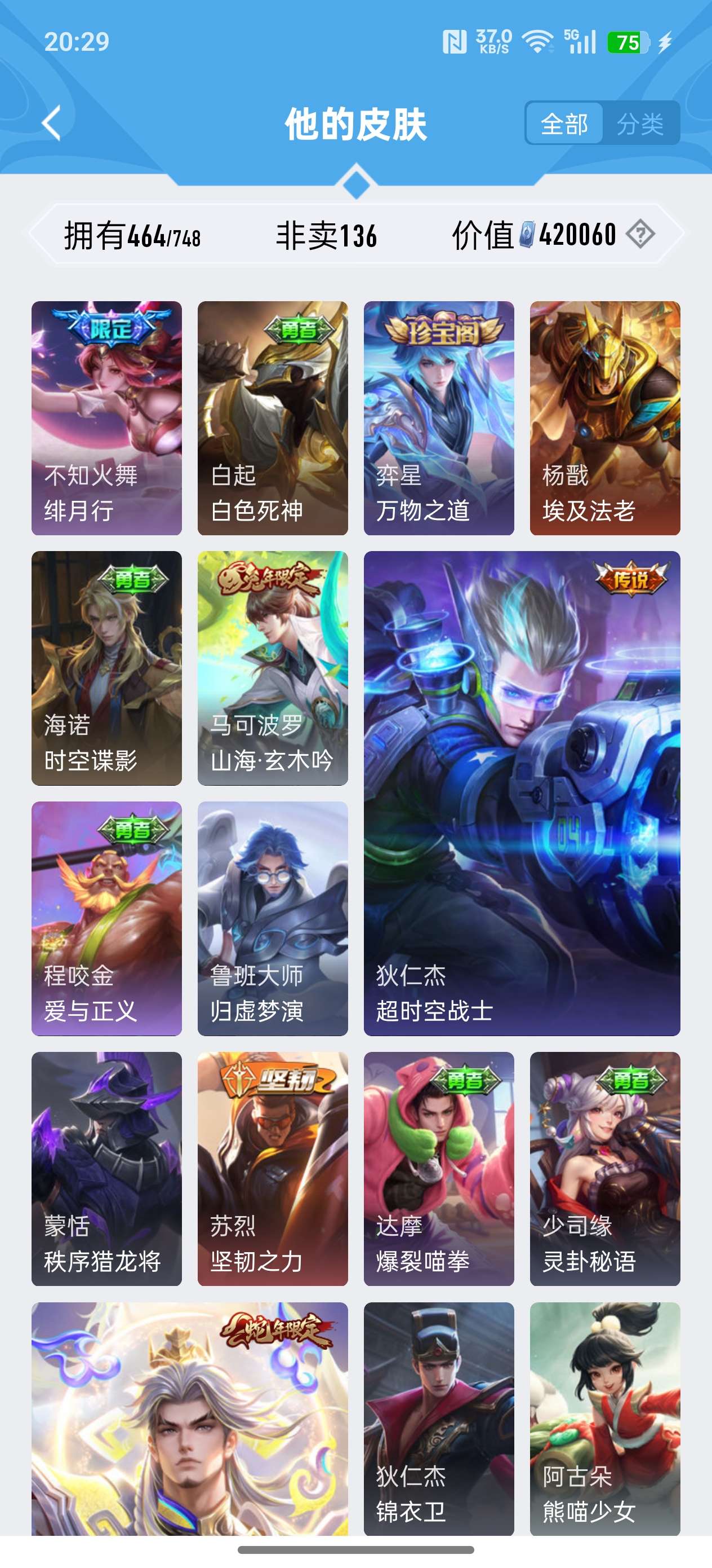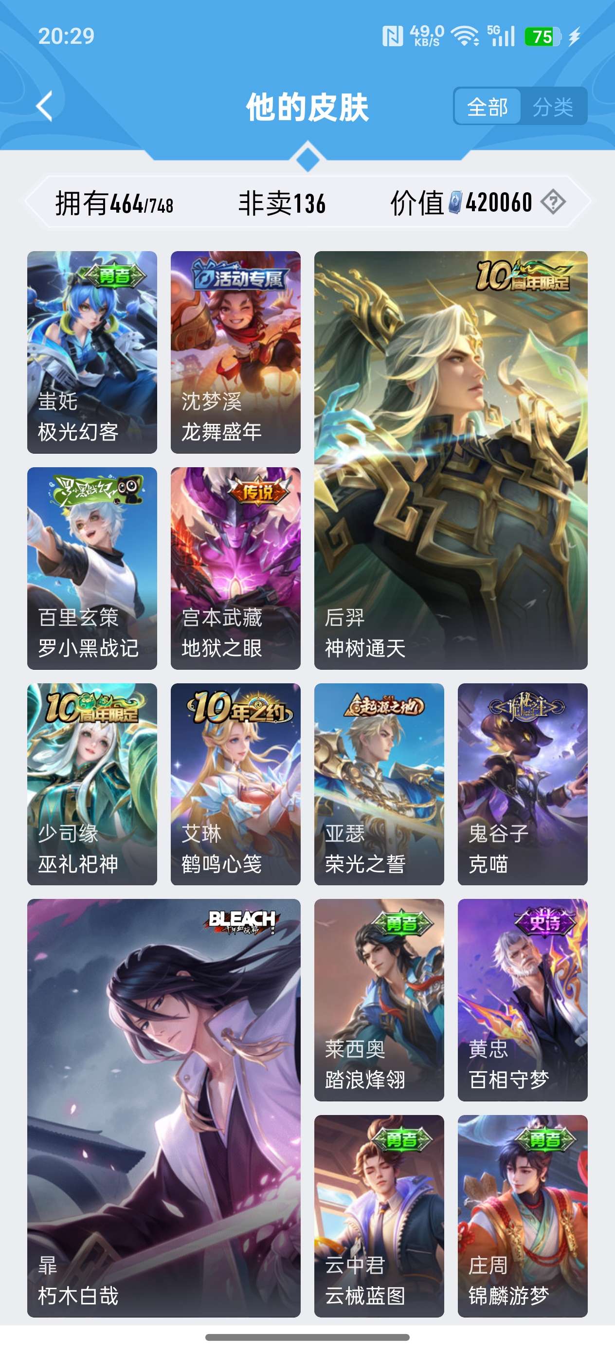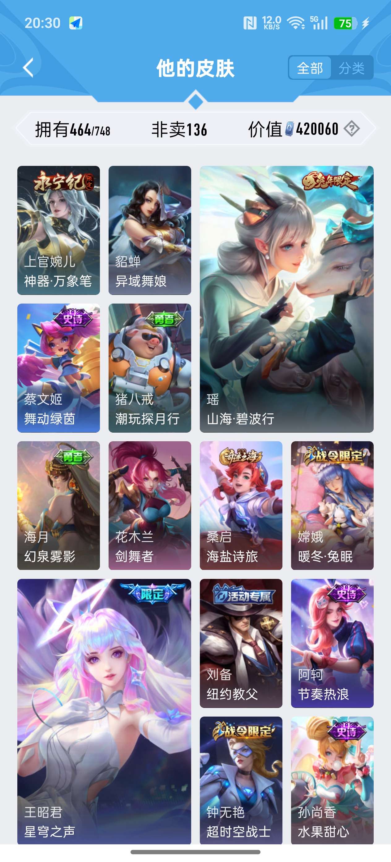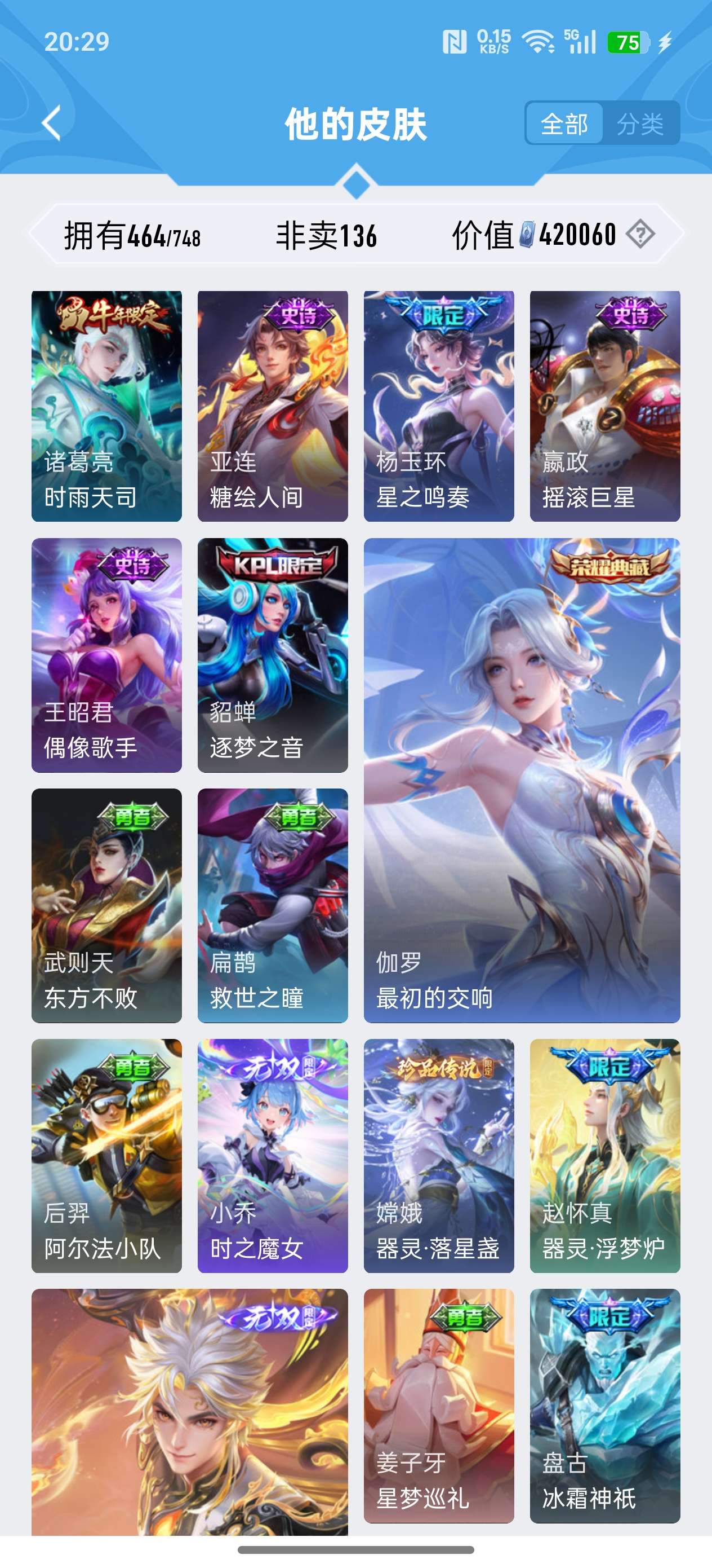 安卓QQ/荣耀王者/464皮肤/127英雄/3典藏/1珍品无双/4无双/7珍品传说/73传说/141