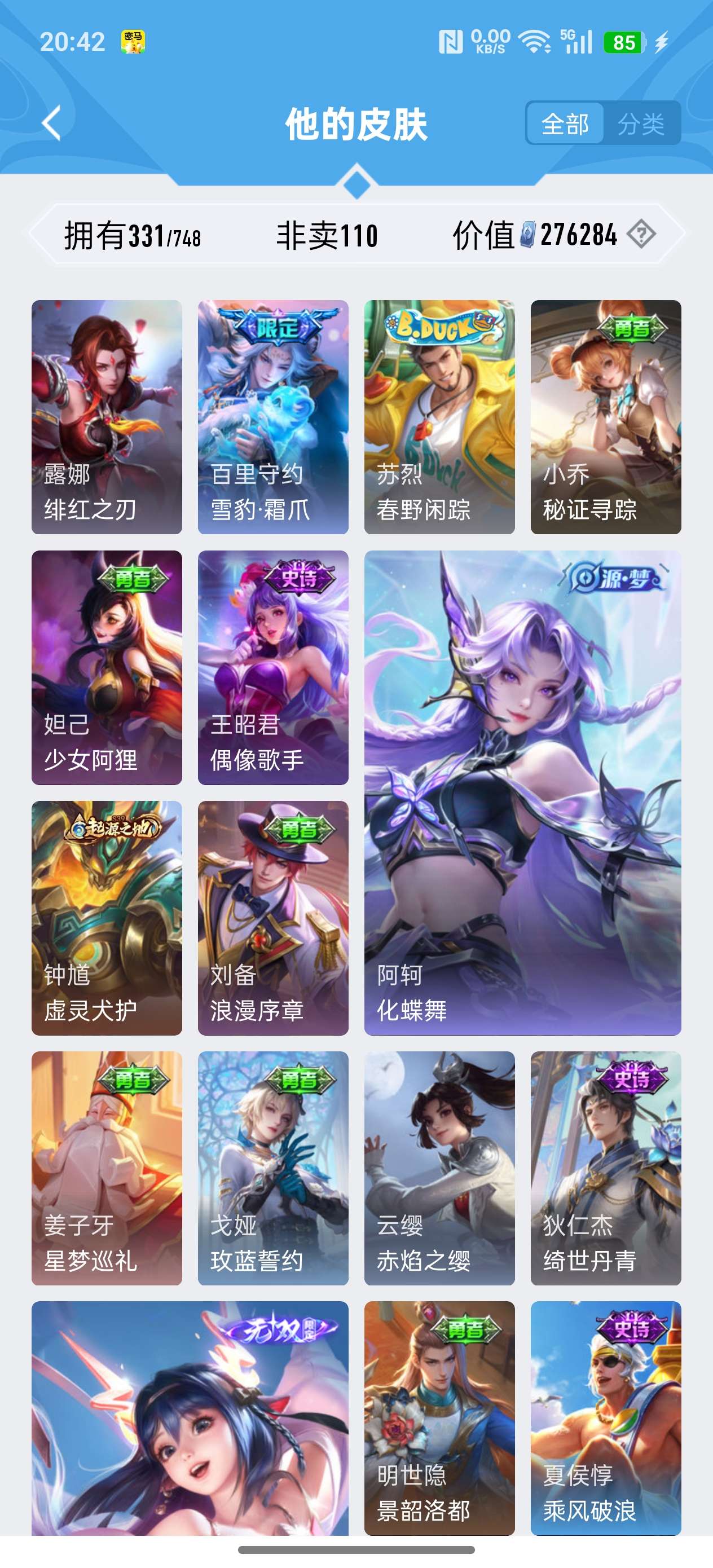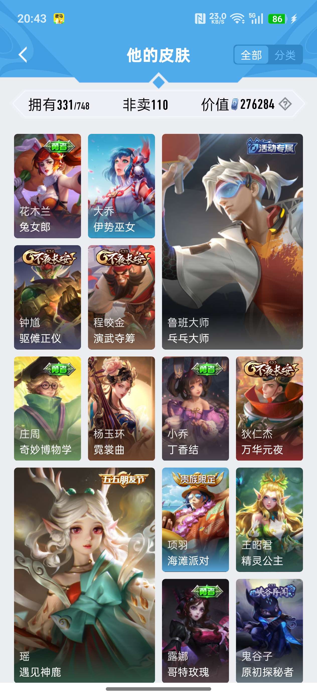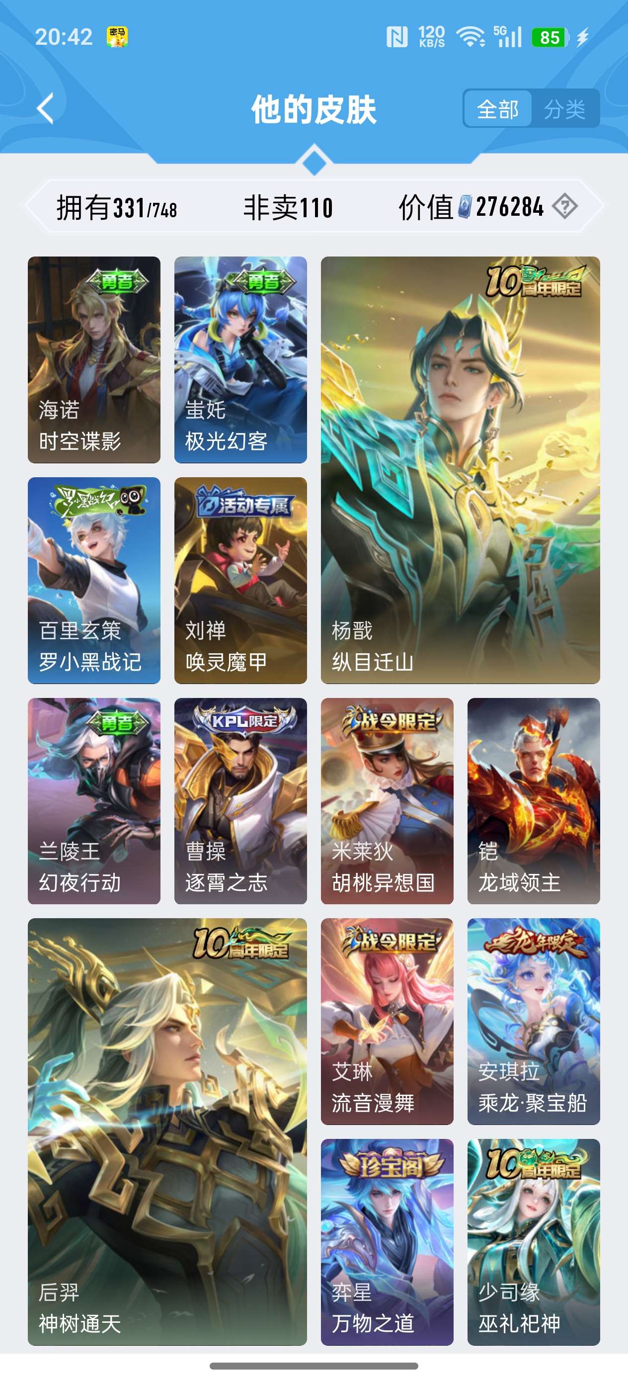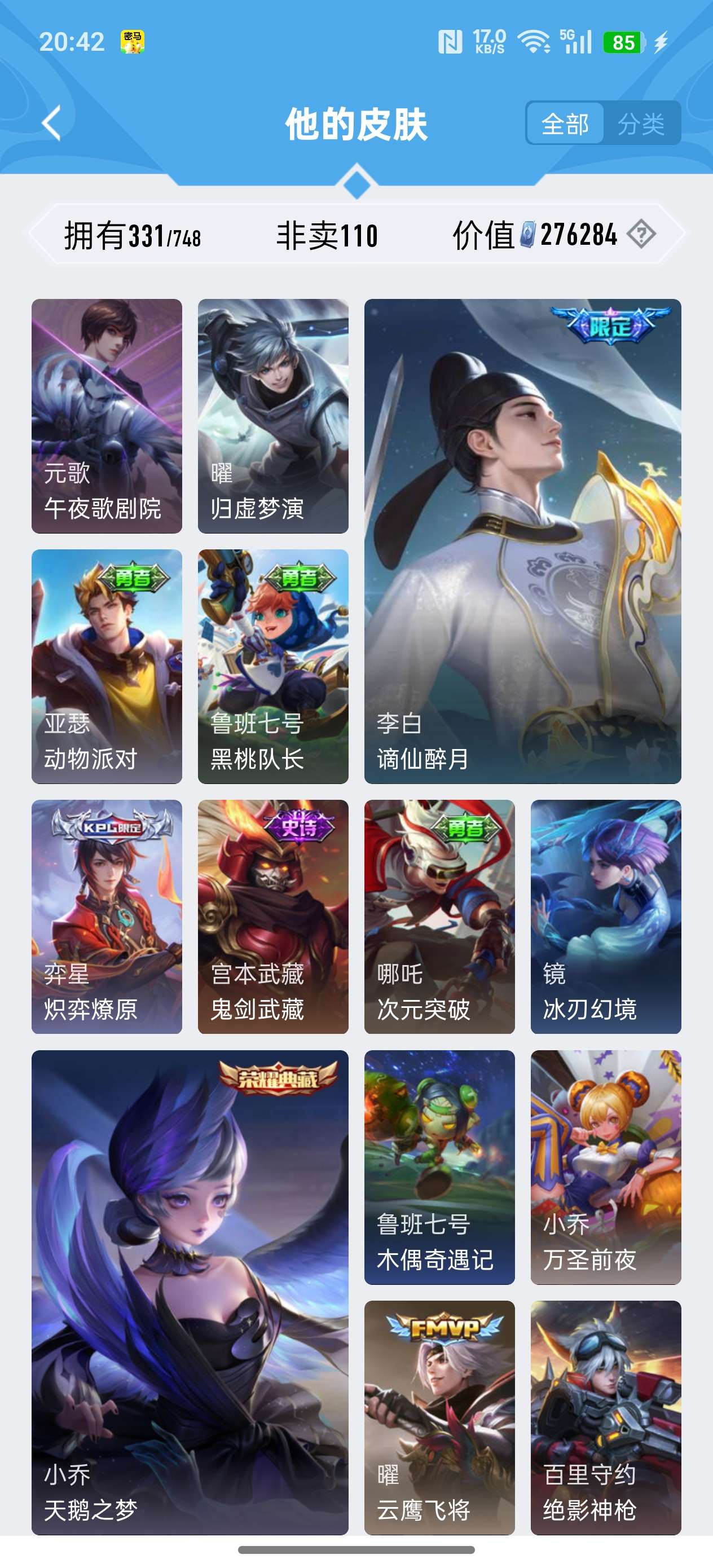 安卓QQ/荣耀王者/331皮肤/127英雄/2典藏/1珍品无双/2无双/4珍品传说/31传说/102