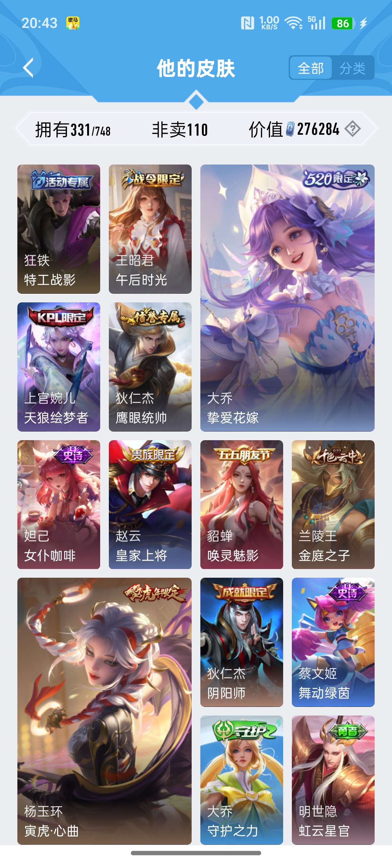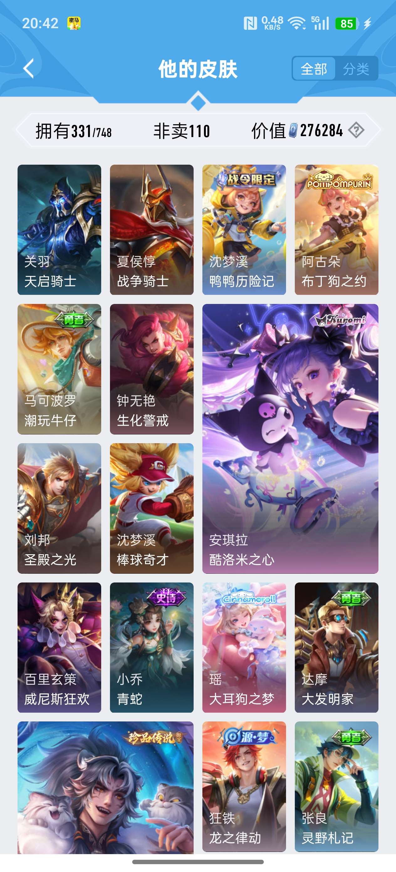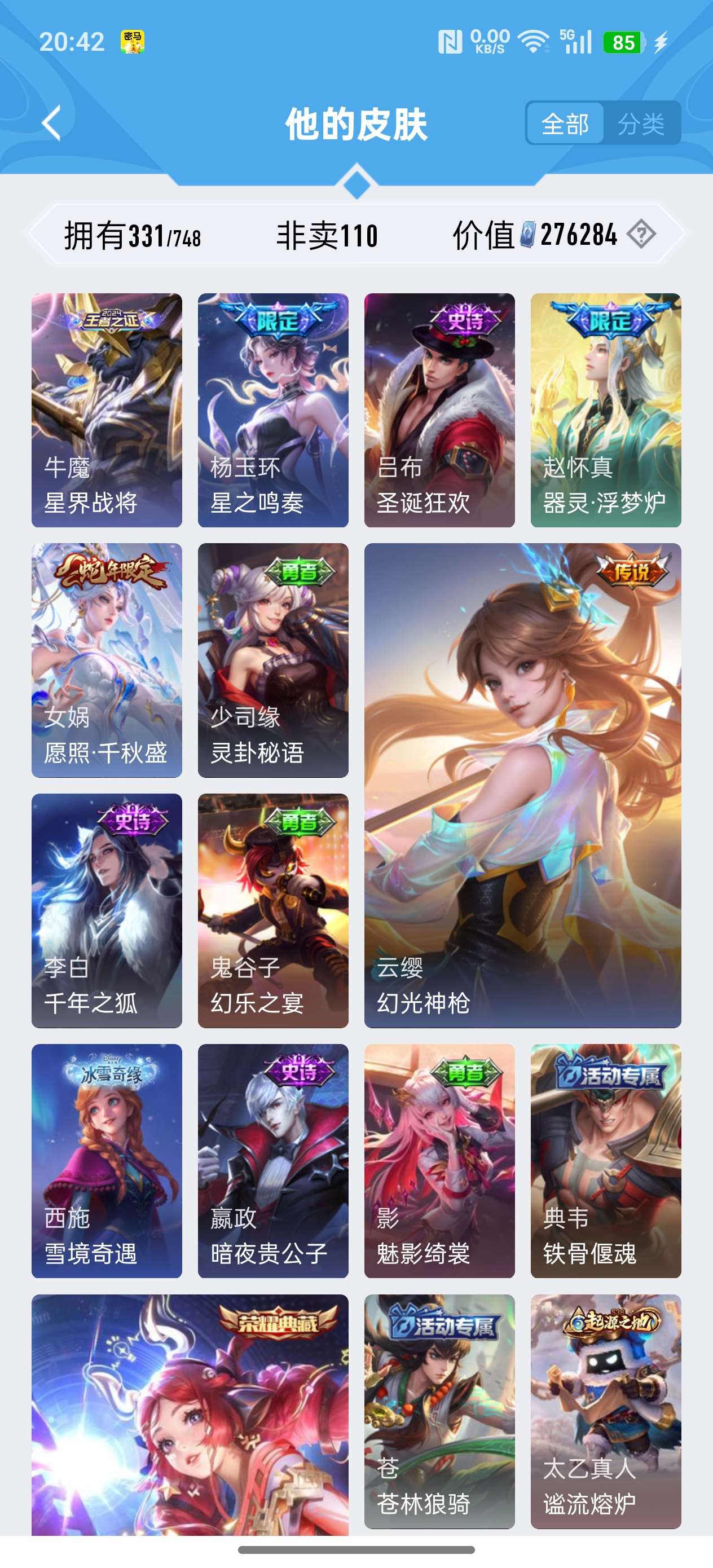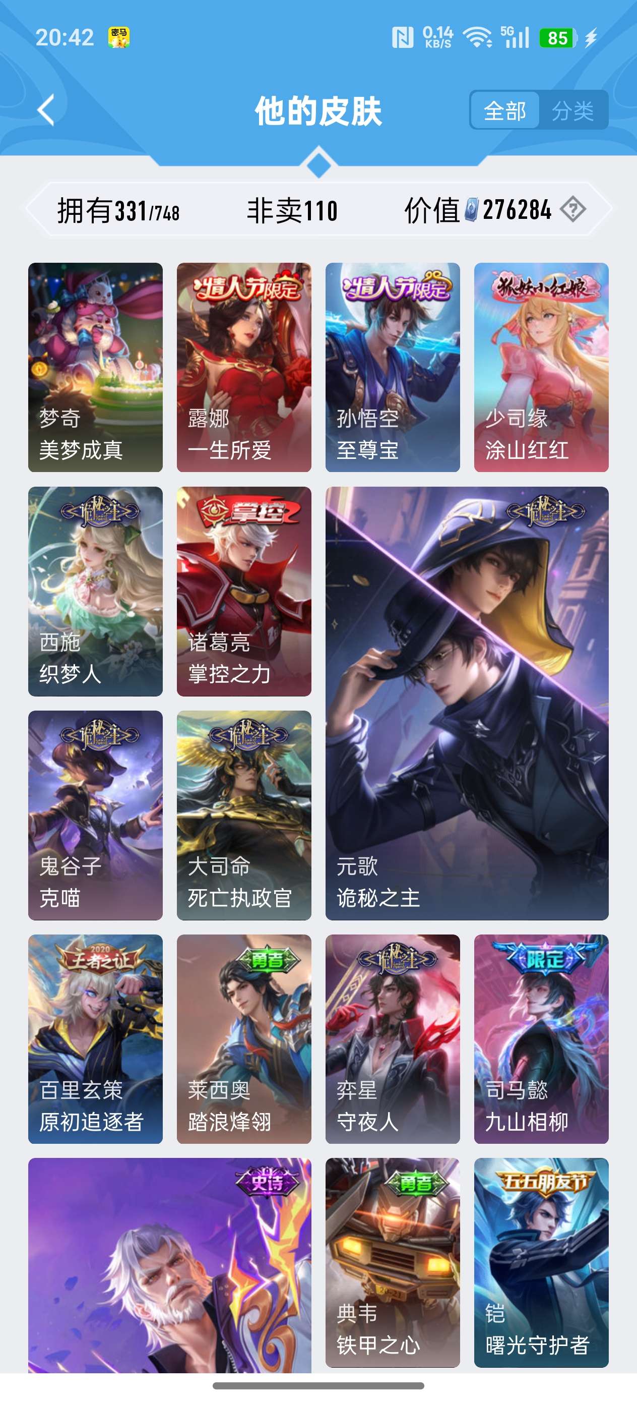 安卓QQ/荣耀王者/331皮肤/127英雄/2典藏/1珍品无双/2无双/4珍品传说/31传说/102