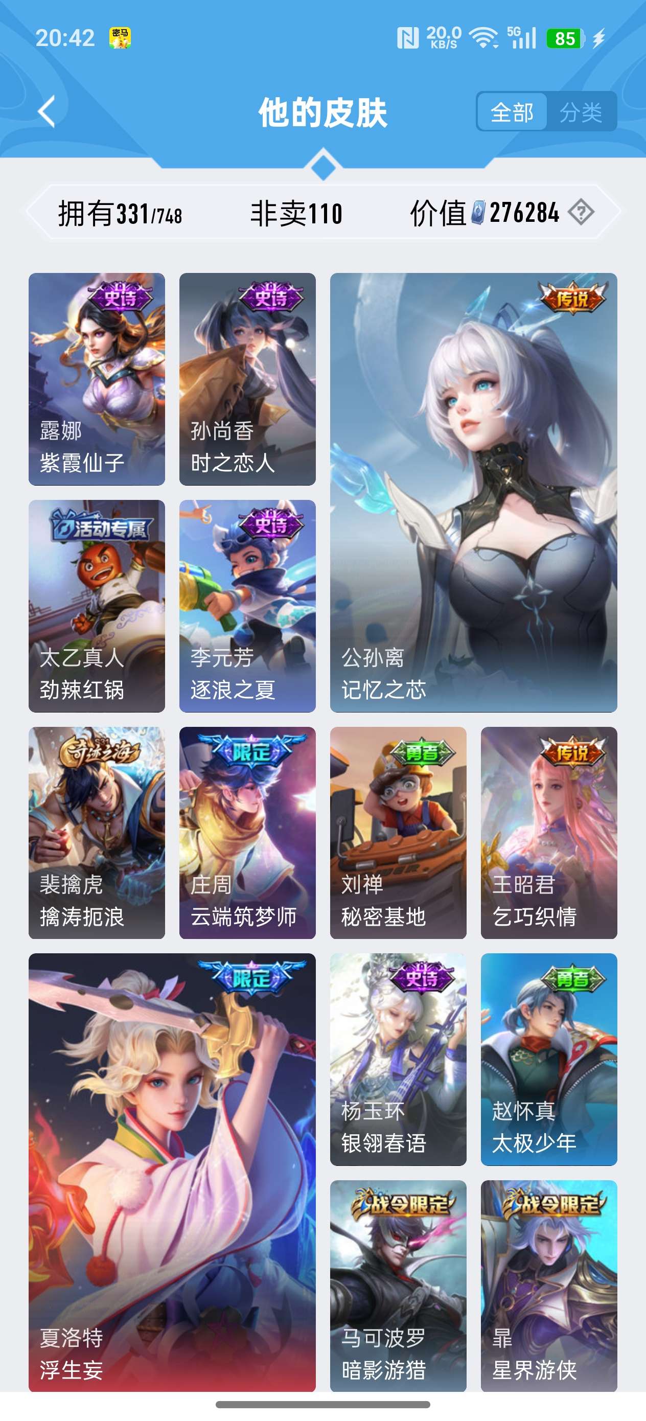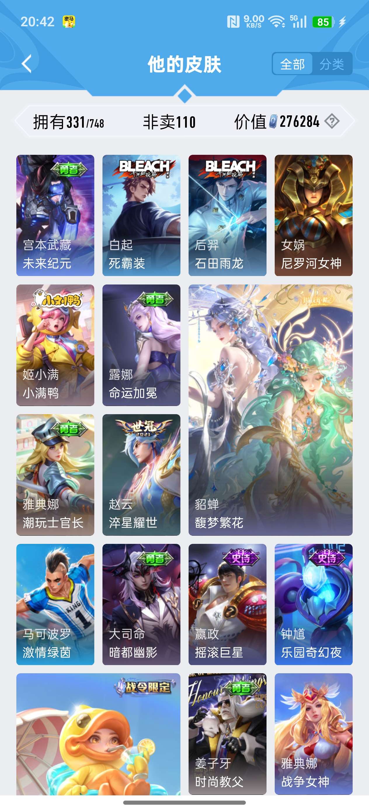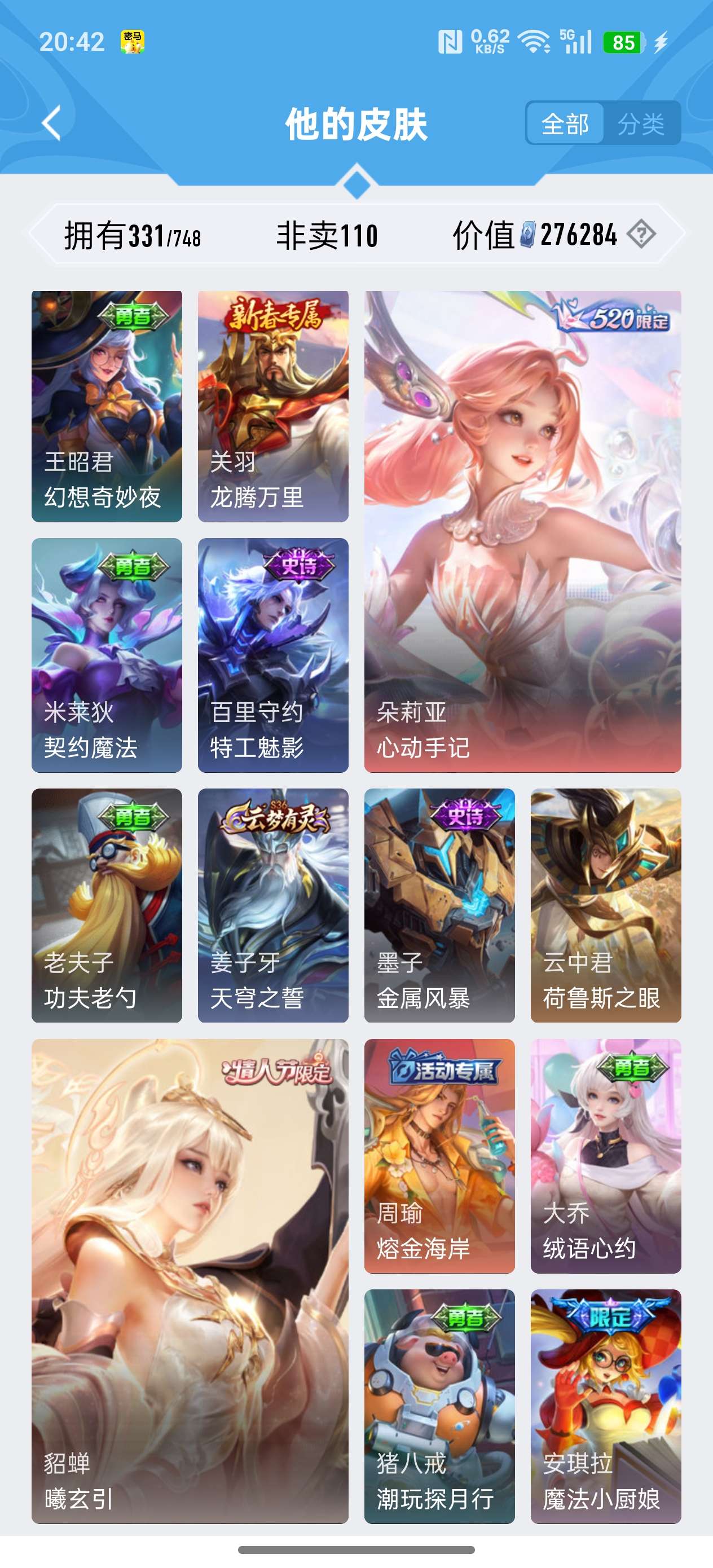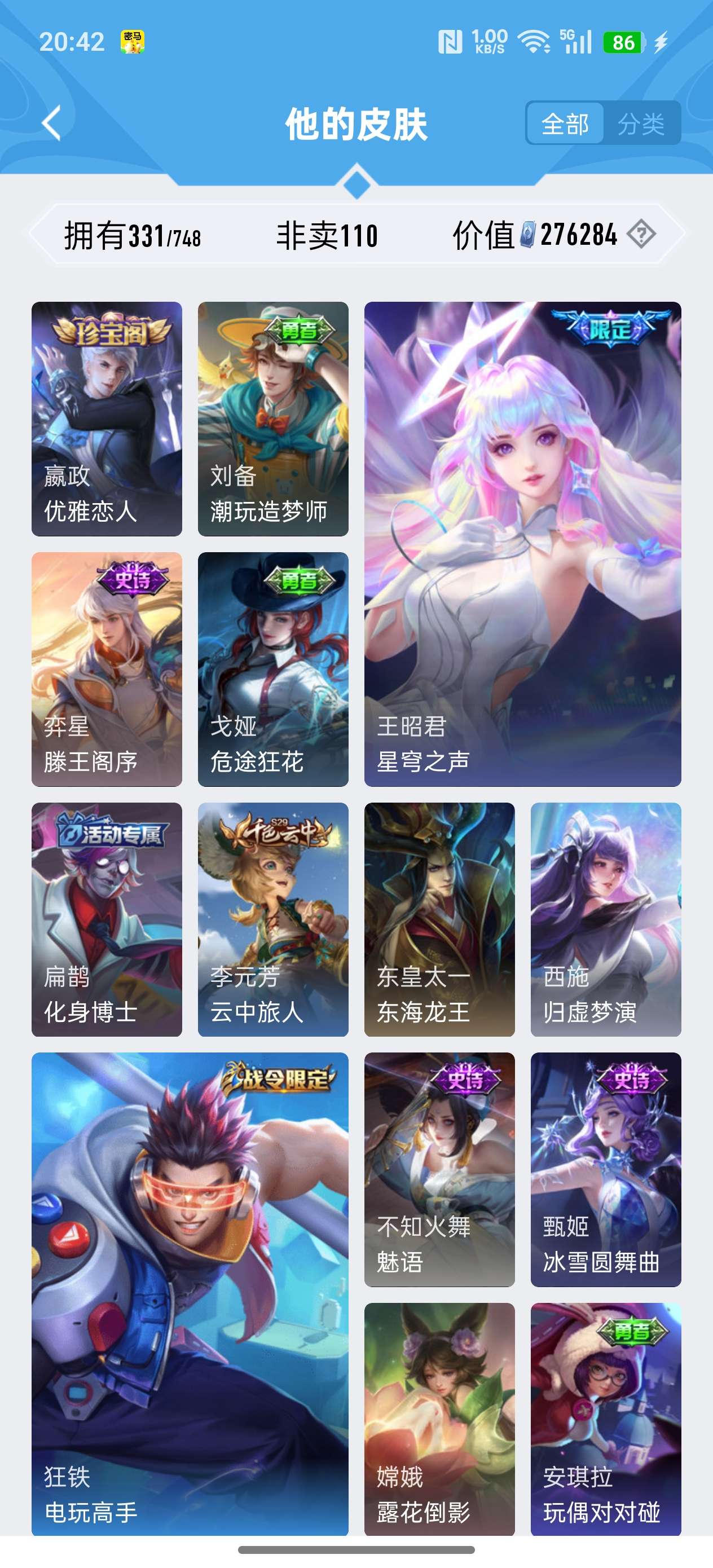 安卓QQ/荣耀王者/331皮肤/127英雄/2典藏/1珍品无双/2无双/4珍品传说/31传说/102