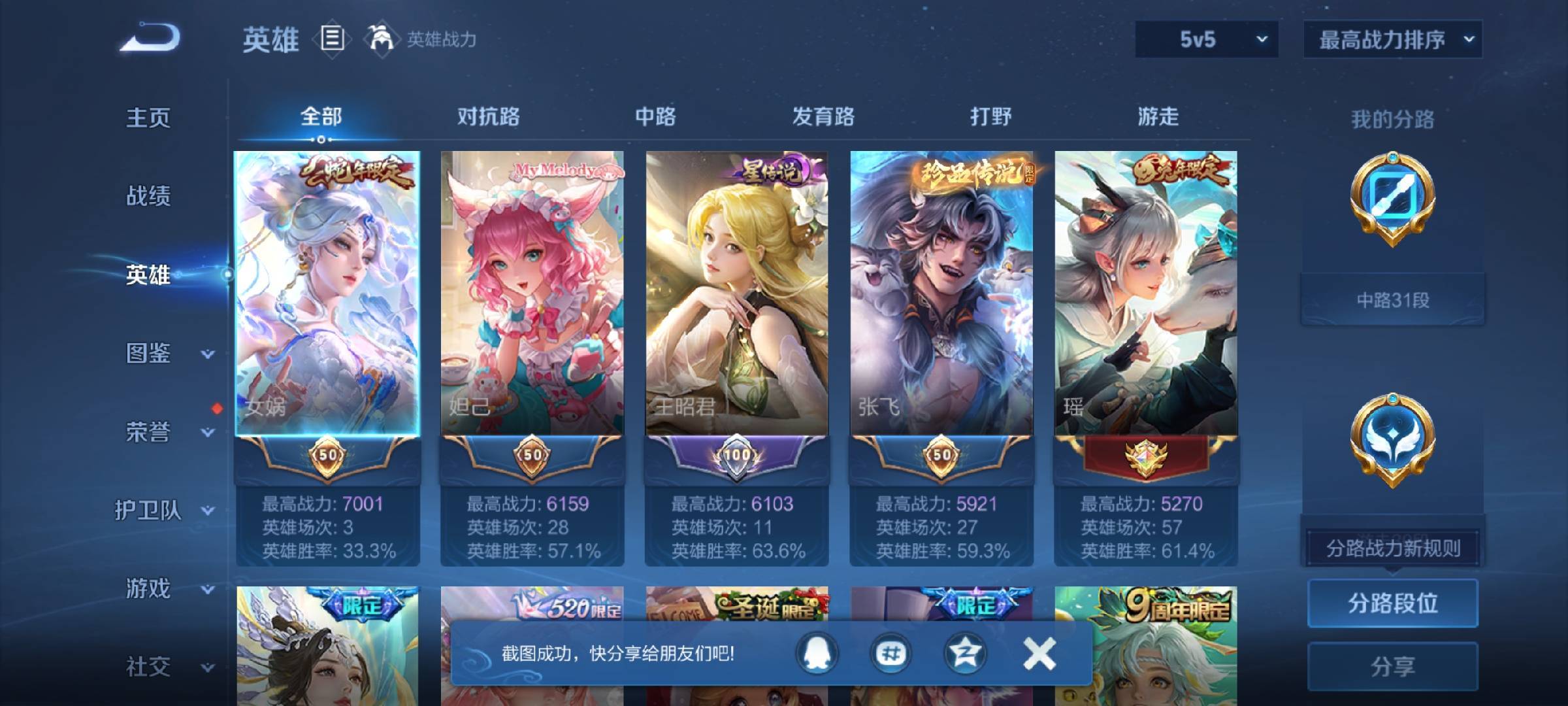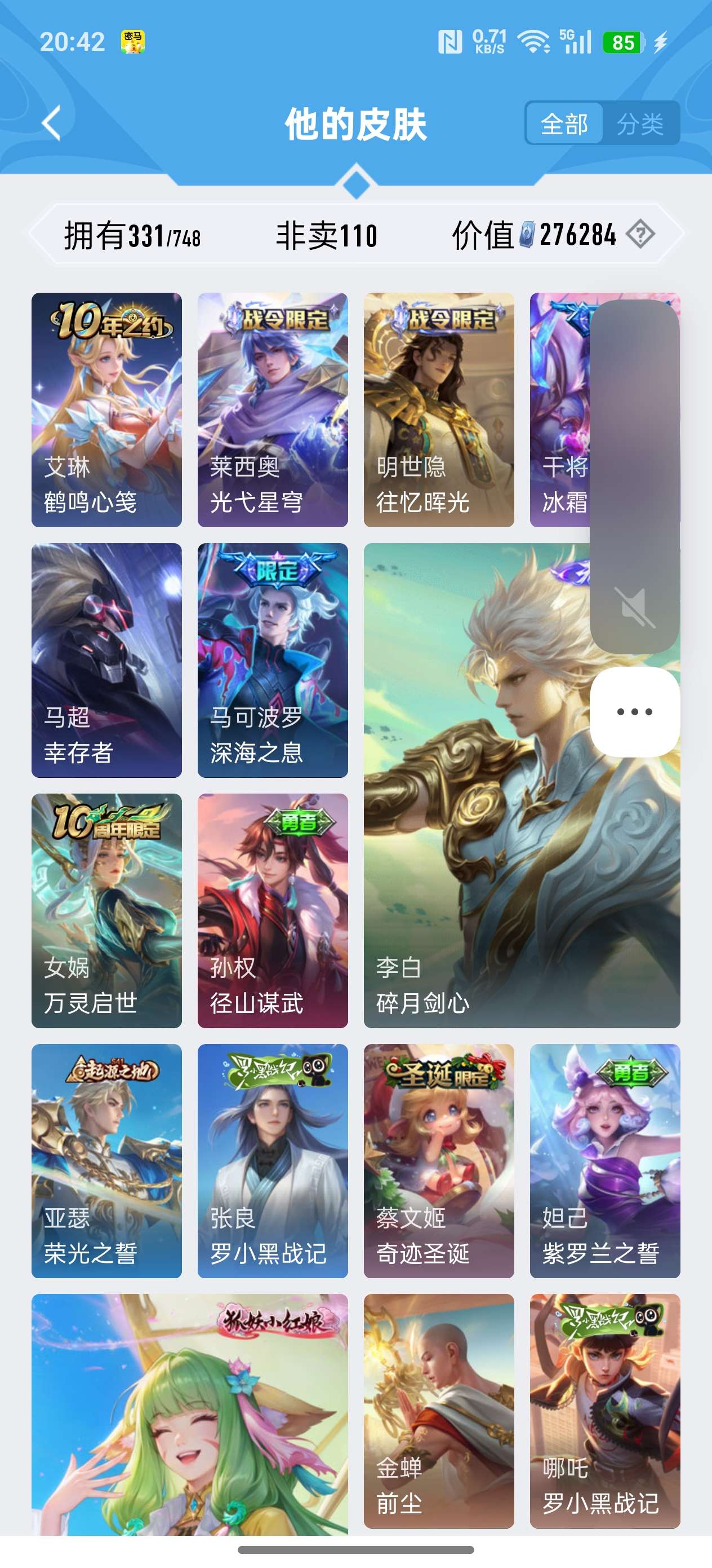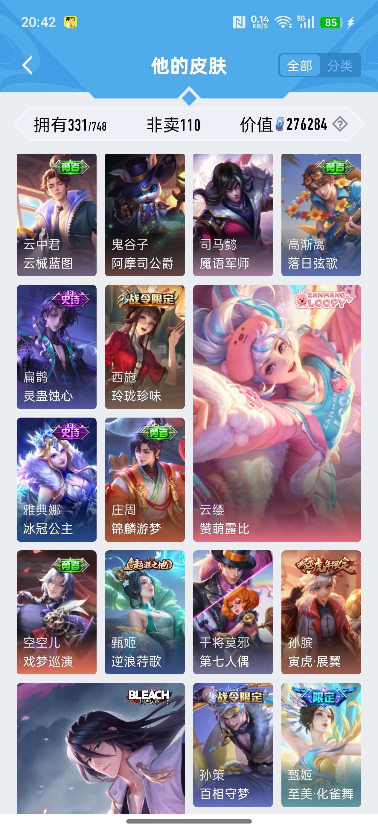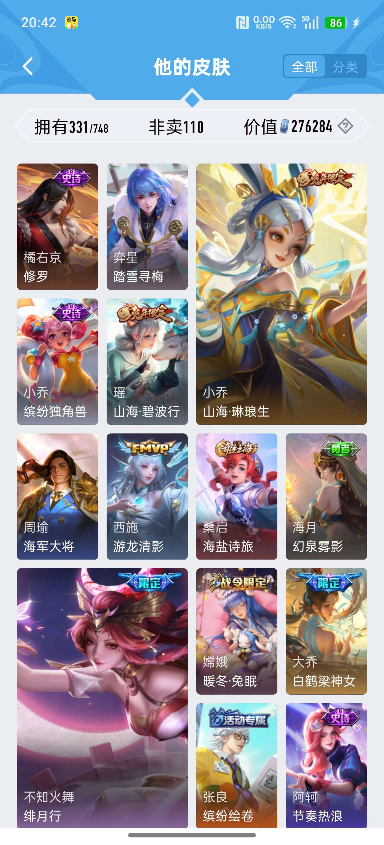 安卓QQ/荣耀王者/331皮肤/127英雄/2典藏/1珍品无双/2无双/4珍品传说/31传说/102