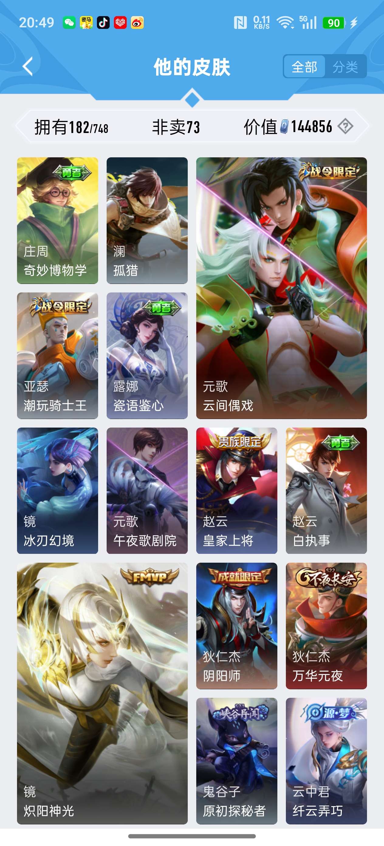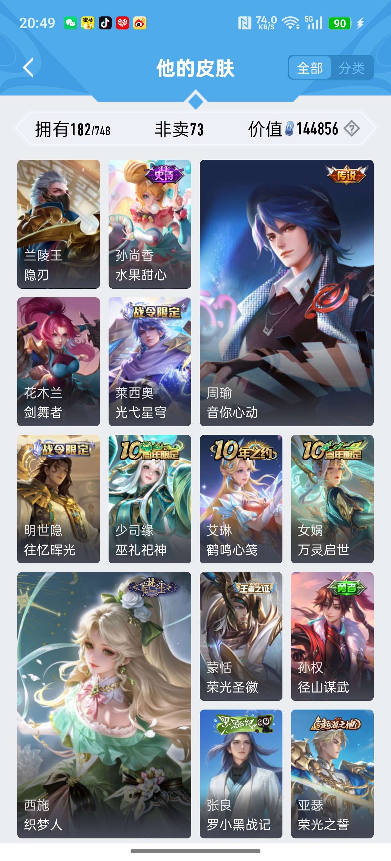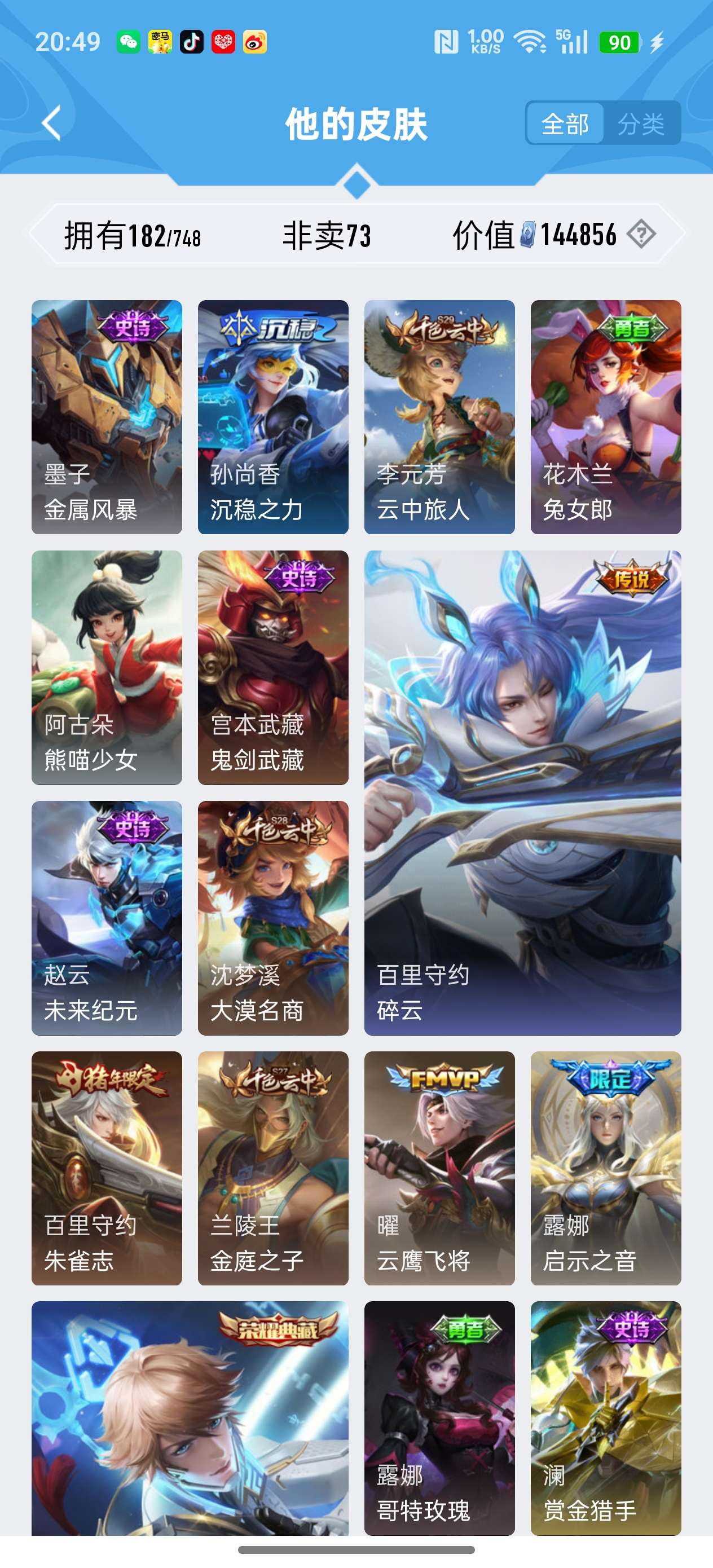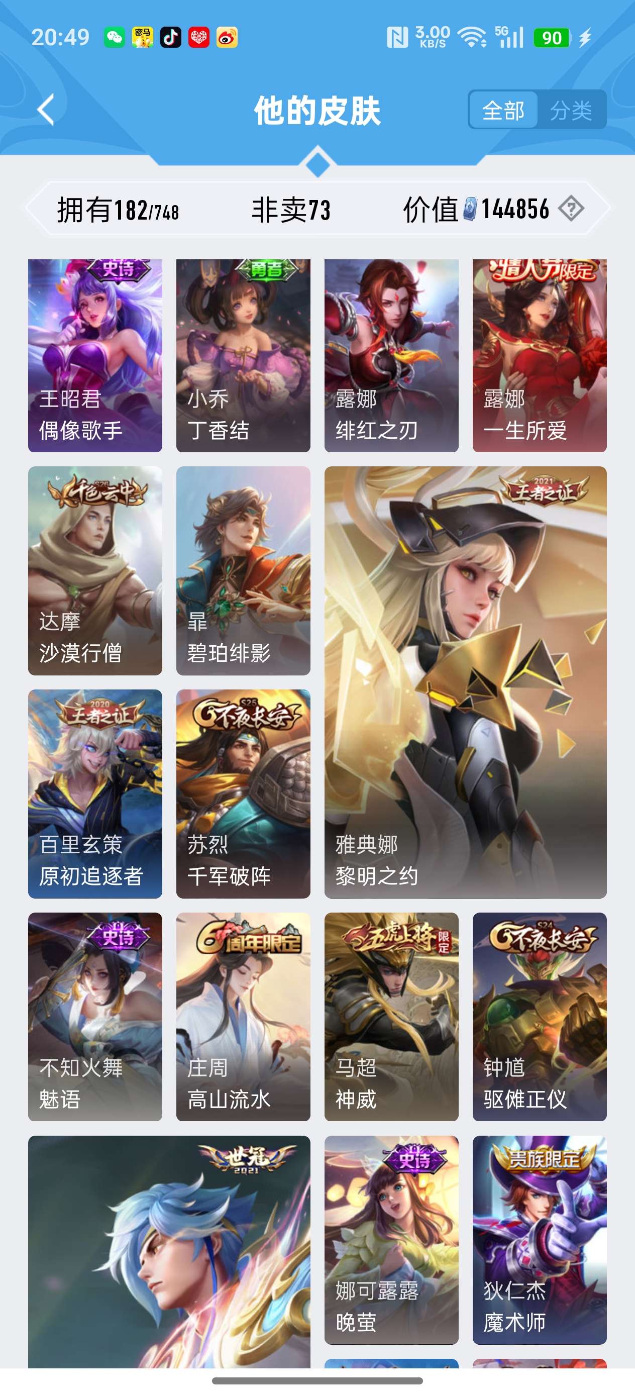 安卓QQ/荣耀王者/182皮肤/117英雄/1典藏/1珍品无双/1无双/5珍品传说/16传说/59史