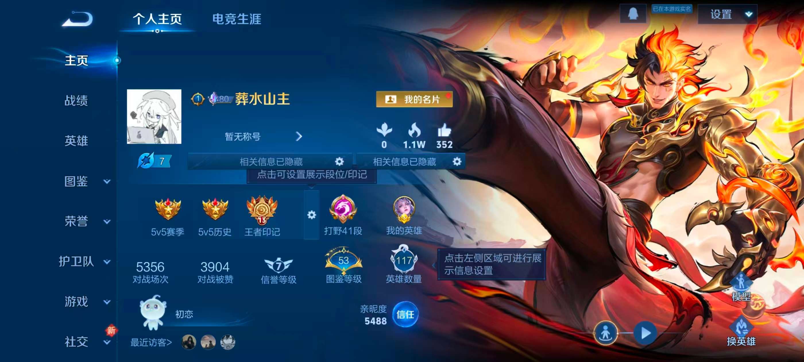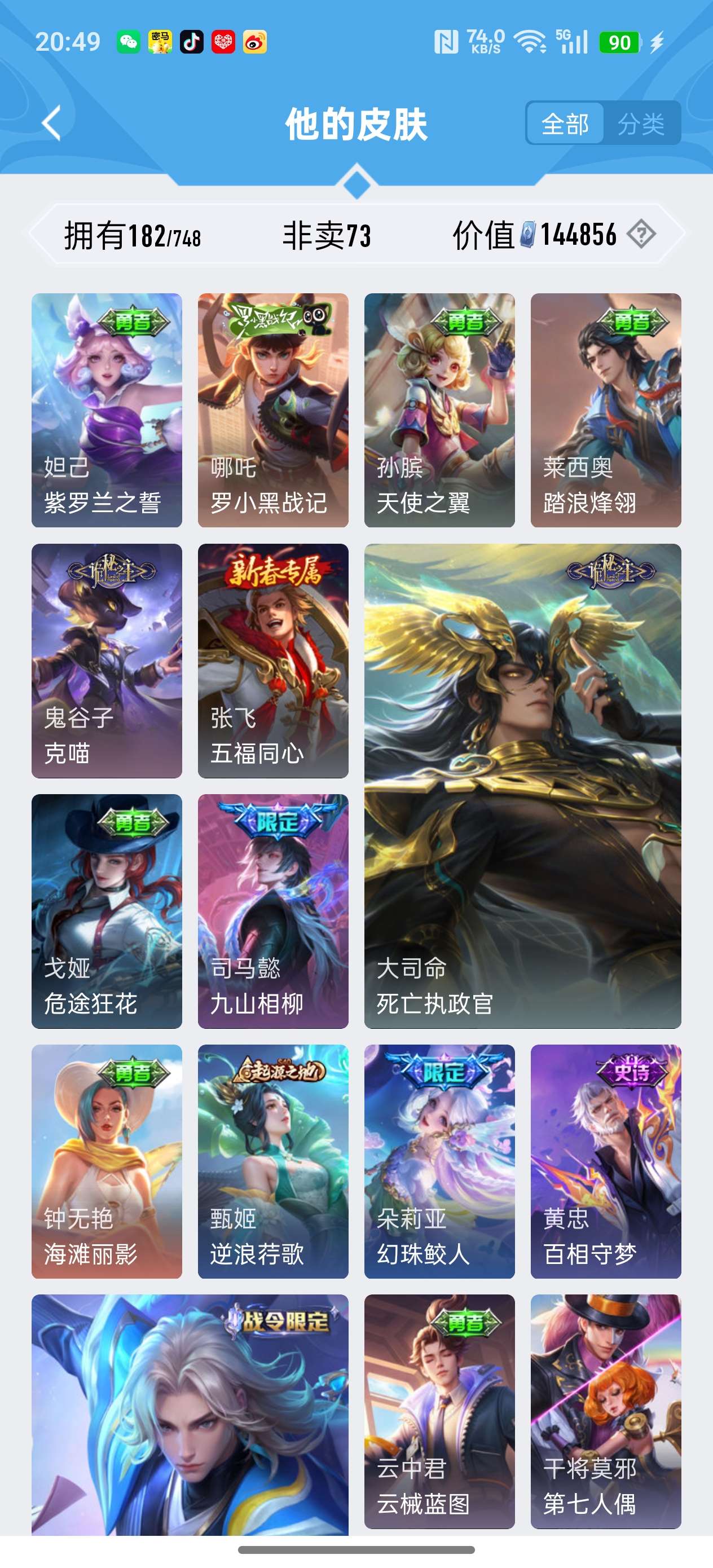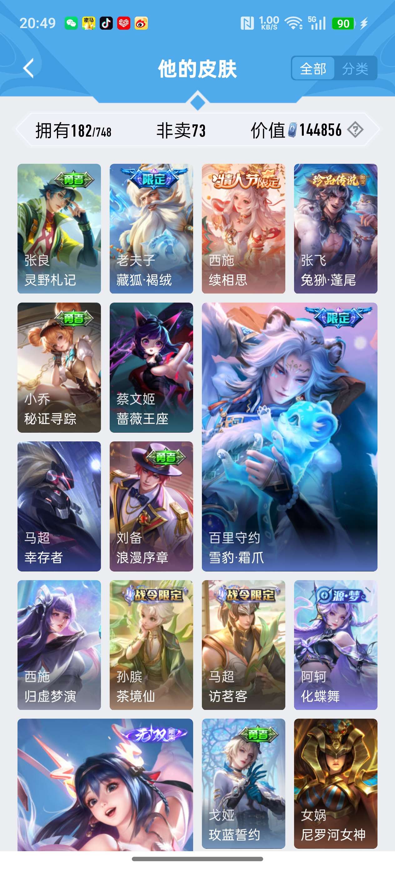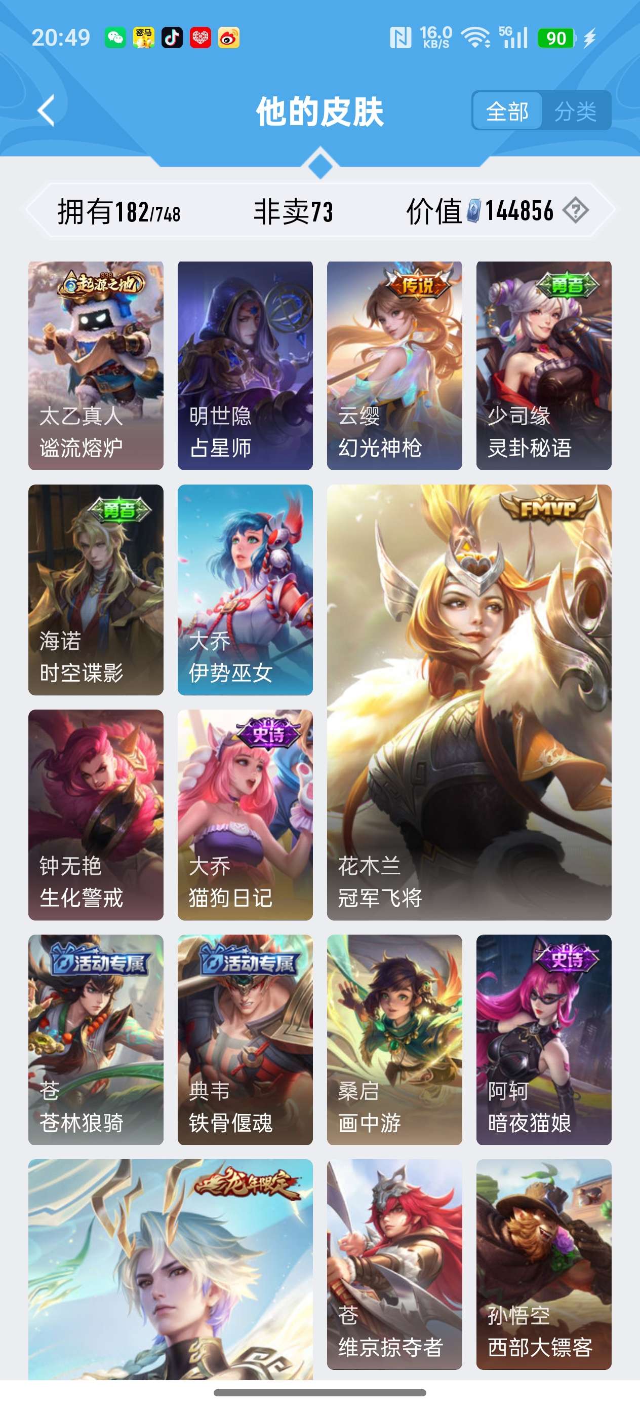 安卓QQ/荣耀王者/182皮肤/117英雄/1典藏/1珍品无双/1无双/5珍品传说/16传说/59史