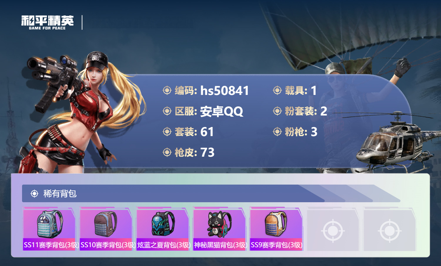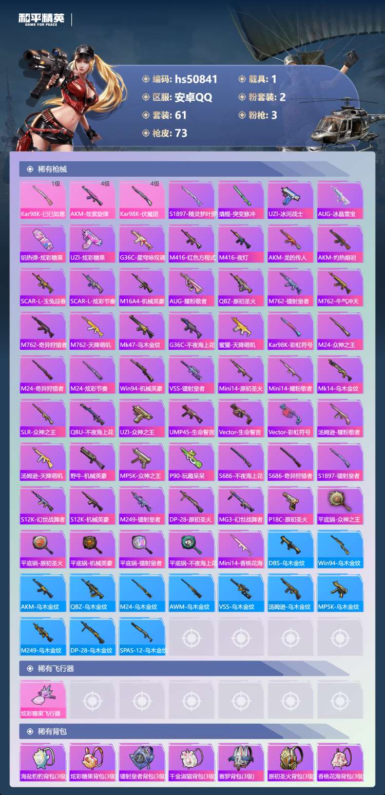 hs50841 安卓手Q-0王牌印记-2粉装-3特效枪-1载具-26102热力值-61套装-73枪皮