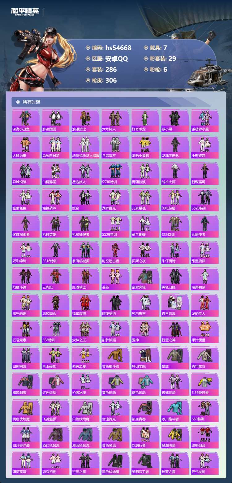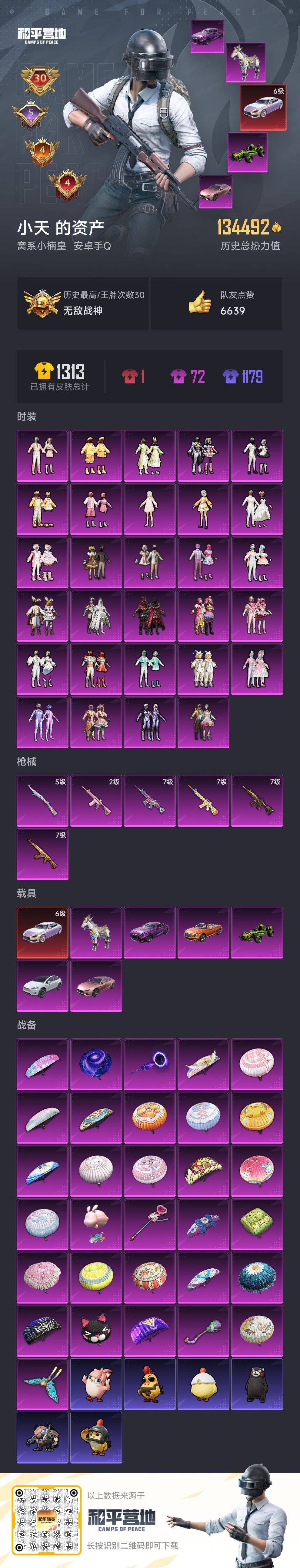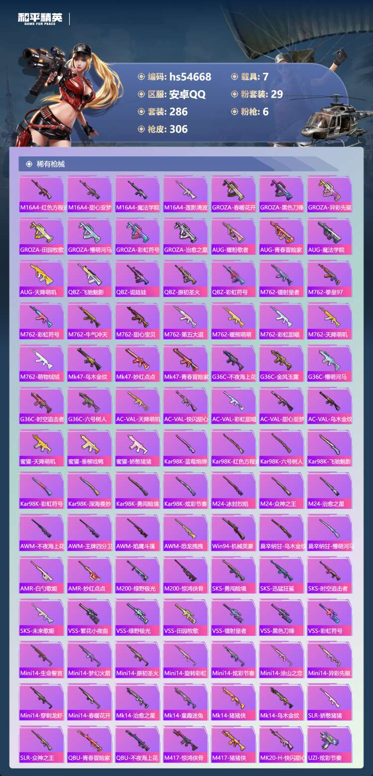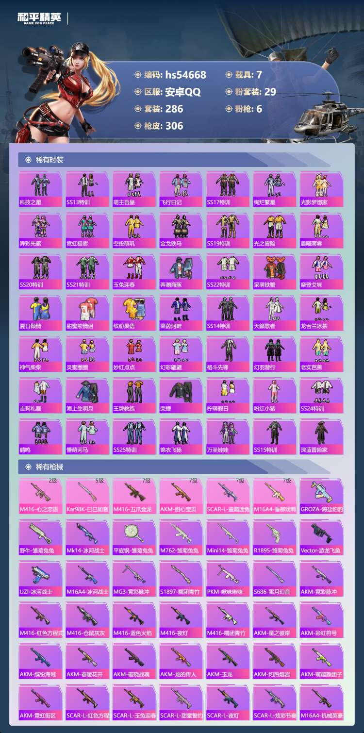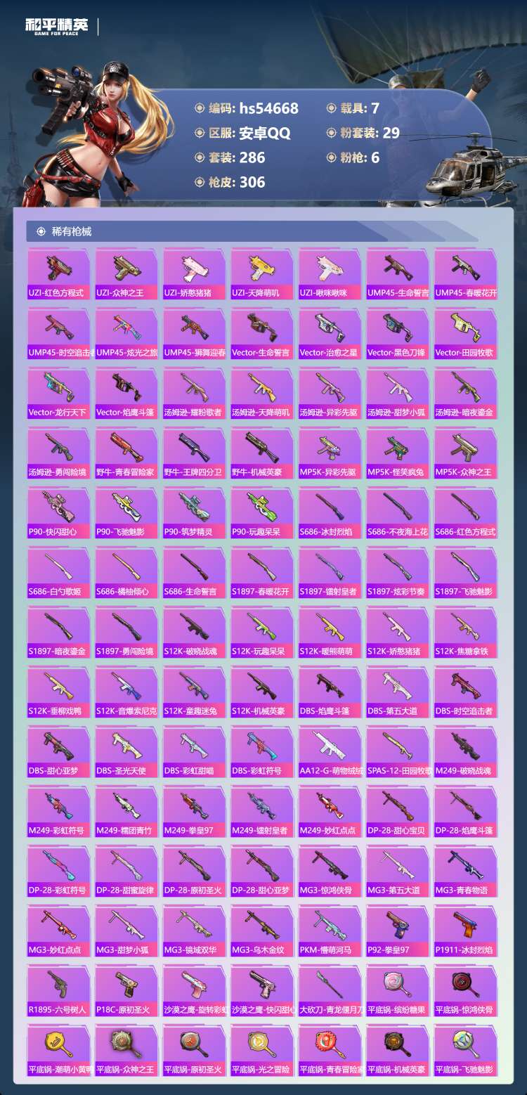 hs54668 安卓手Q-30王牌印记-有战神框-29粉装-6特效枪-7载具-134492热力值-2