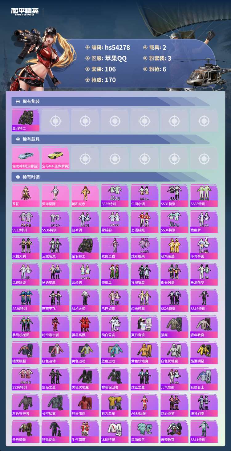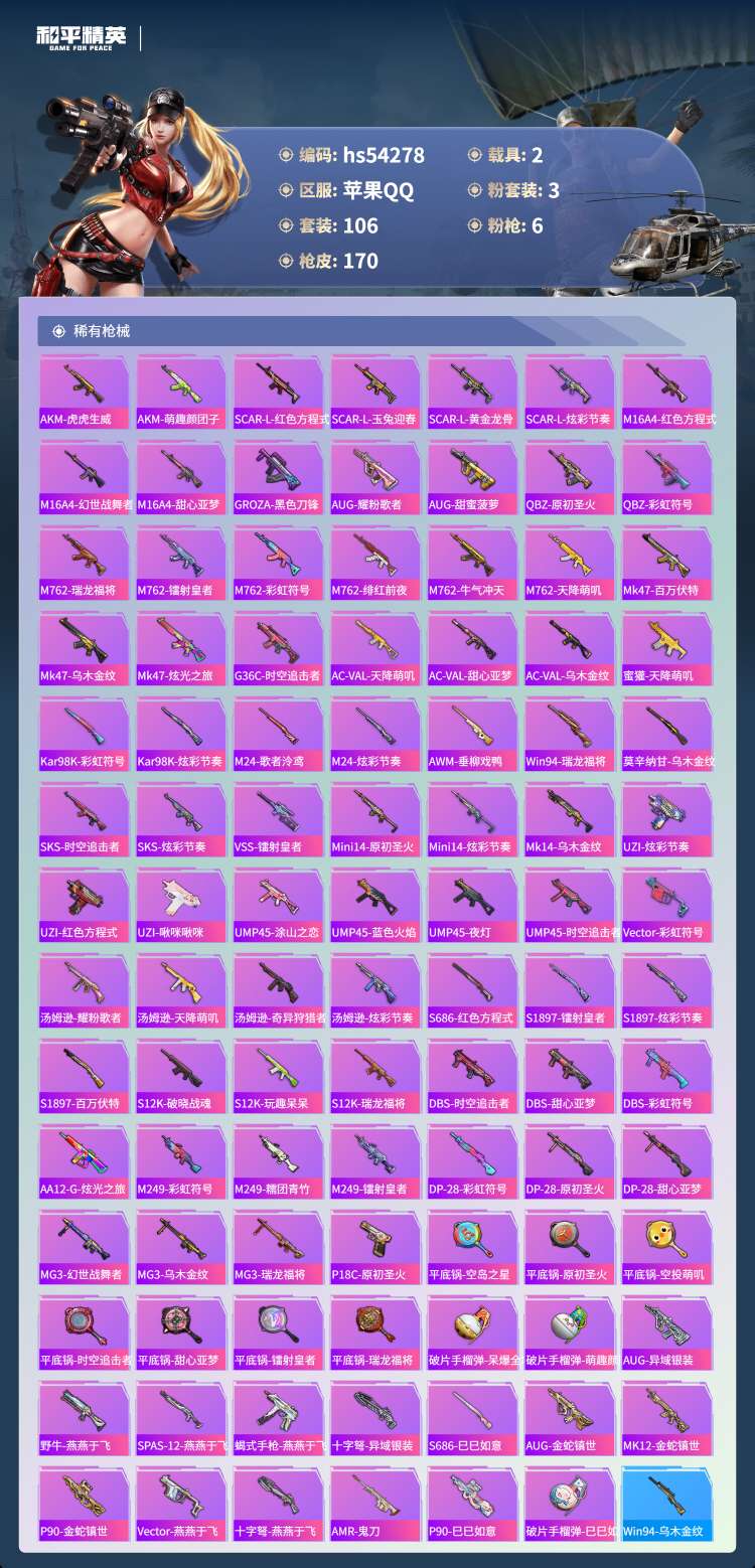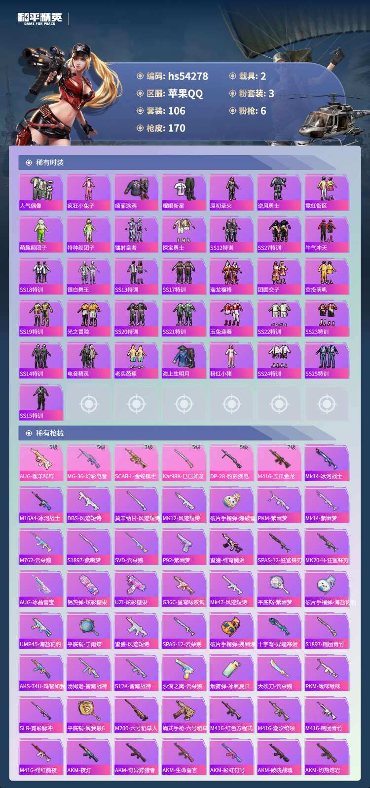 hs54278 苹果手Q-15王牌印记-3粉装-6特效枪-2载具-51148热力值-106套装-17