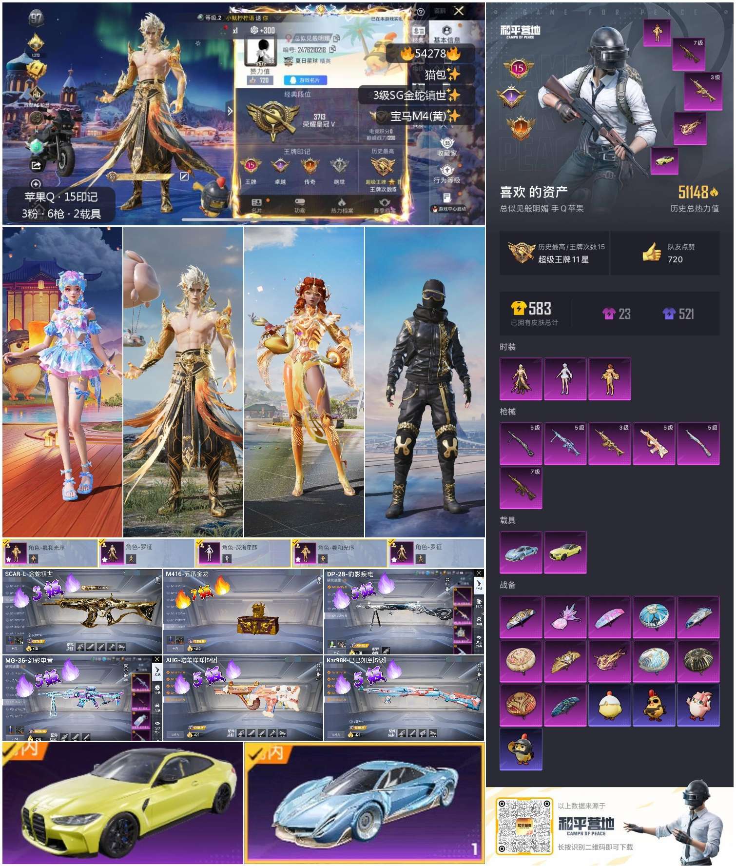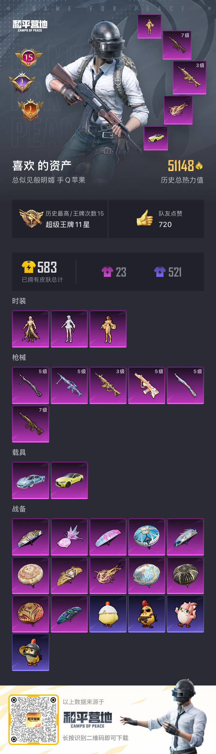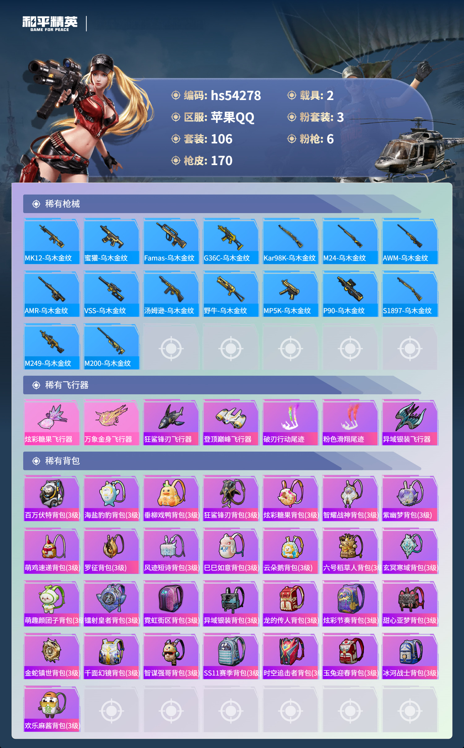 hs54278 苹果手Q-15王牌印记-3粉装-6特效枪-2载具-51148热力值-106套装-17