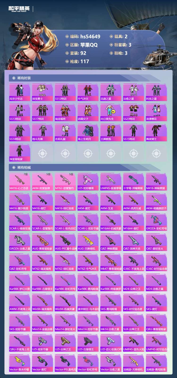 hs54649 安卓手Q-8王牌印记-3粉装-3特效枪-2载具-41824热力值-92套装-117枪