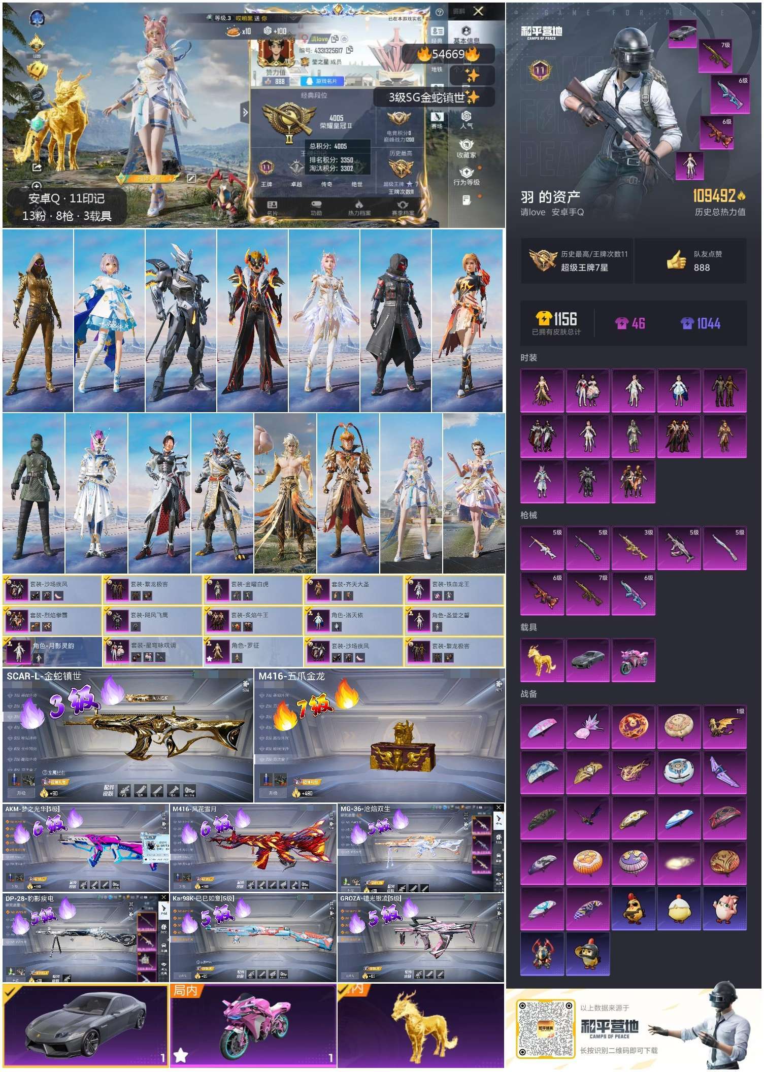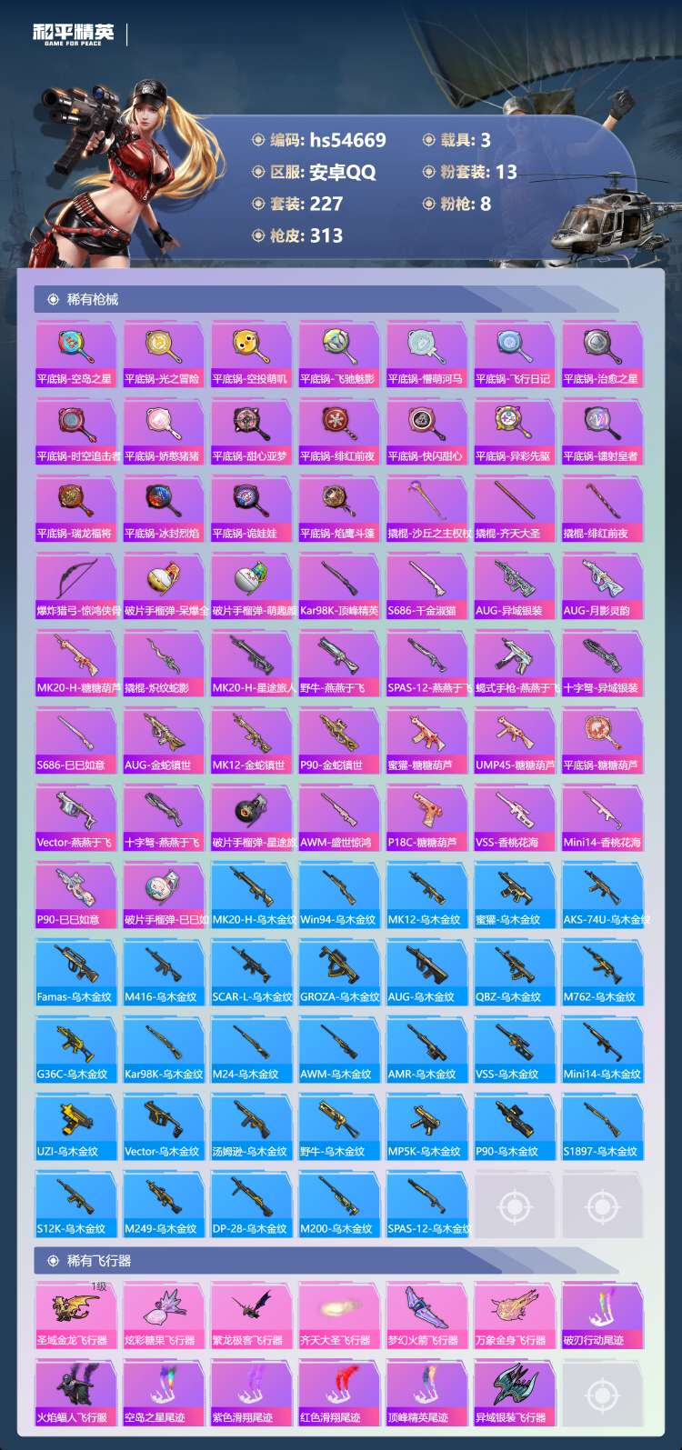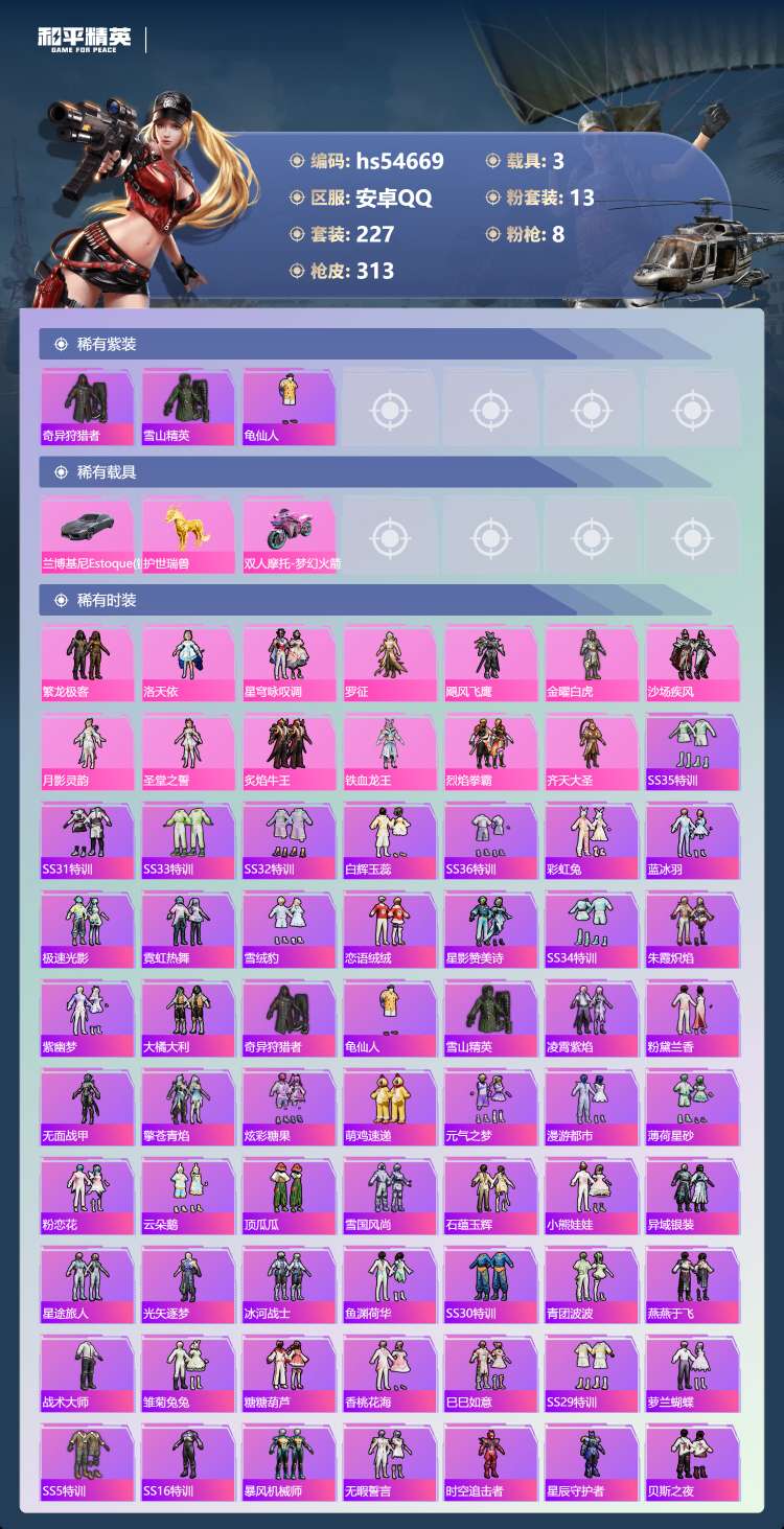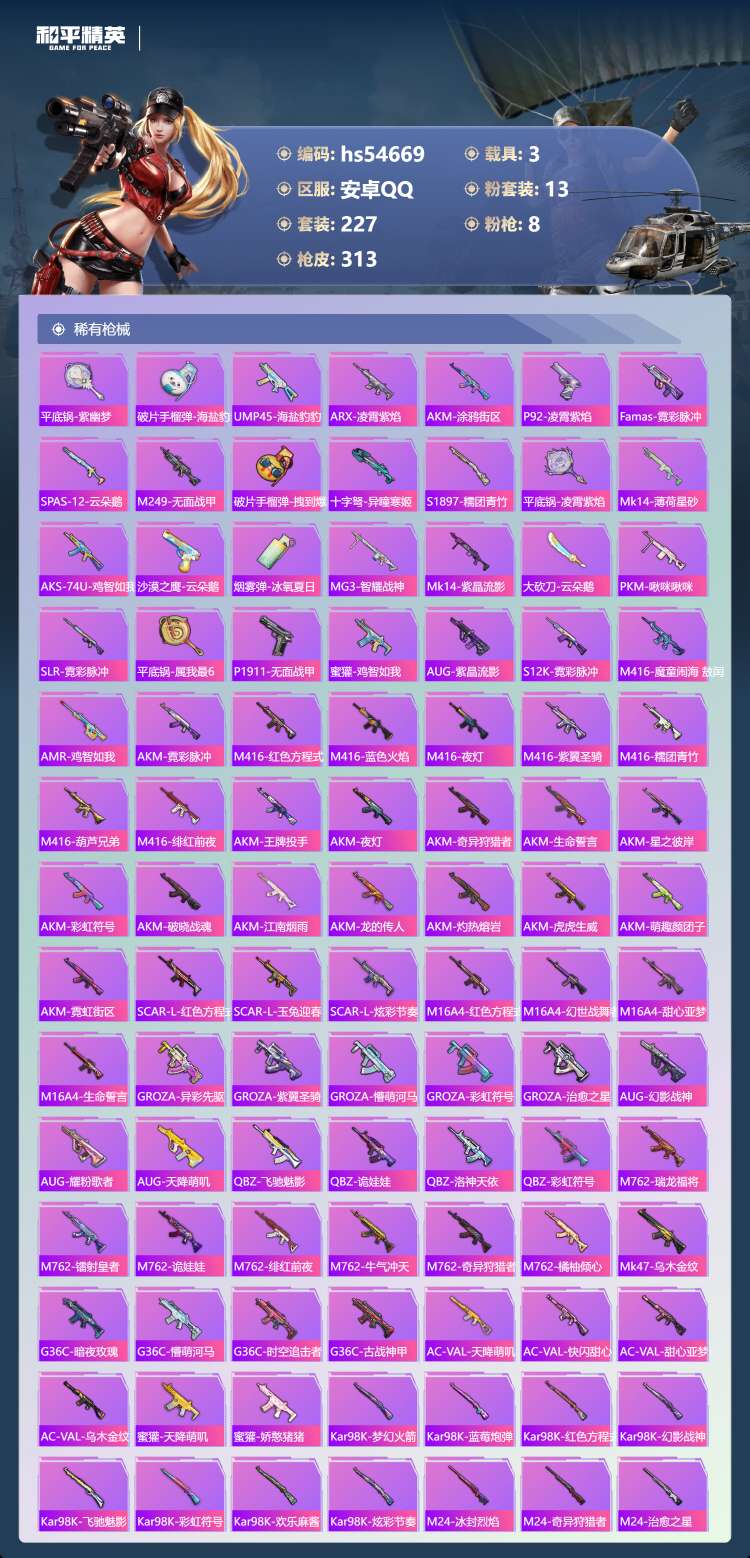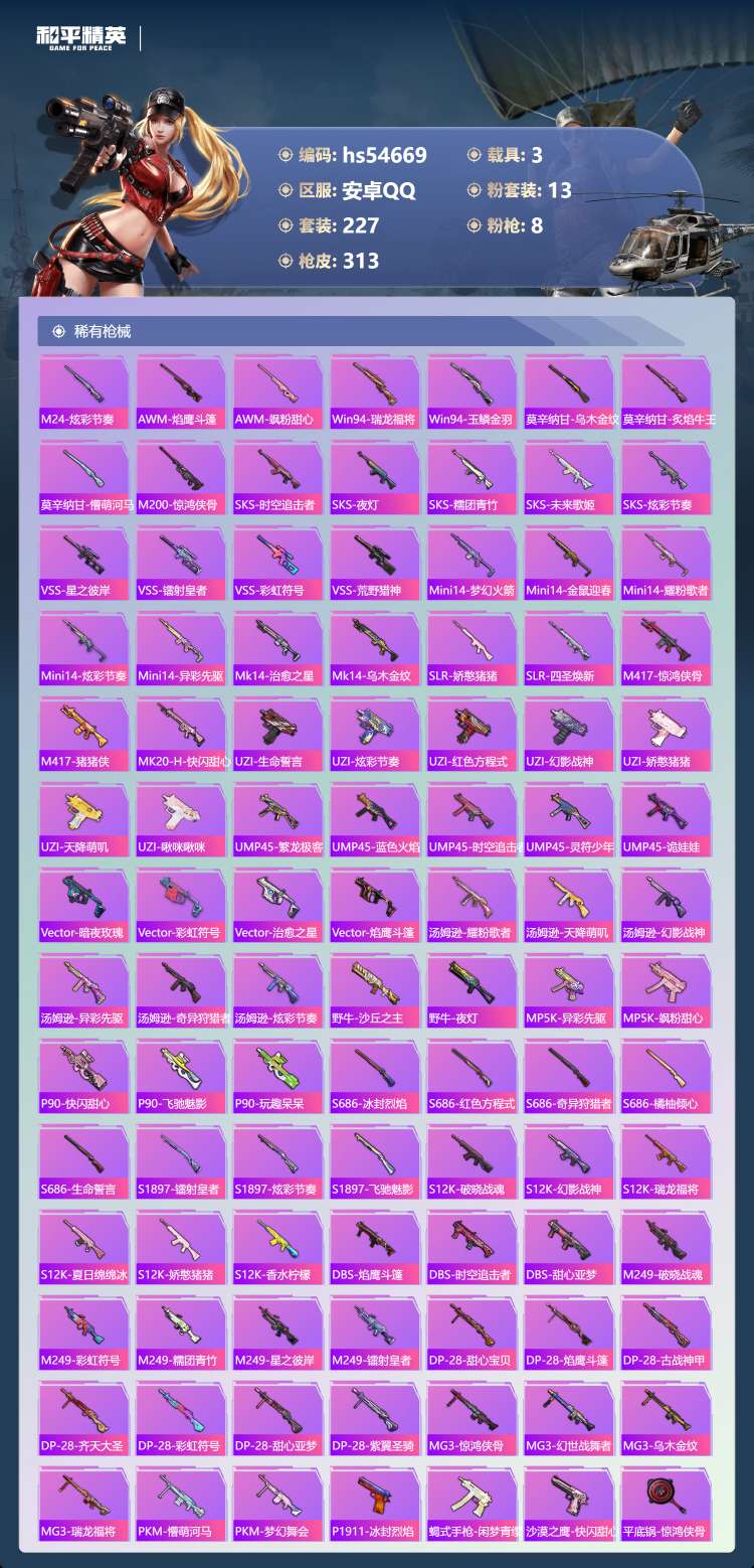 hs54669 安卓手Q-11王牌印记-13粉装-8特效枪-3载具-109492热力值-227套装-