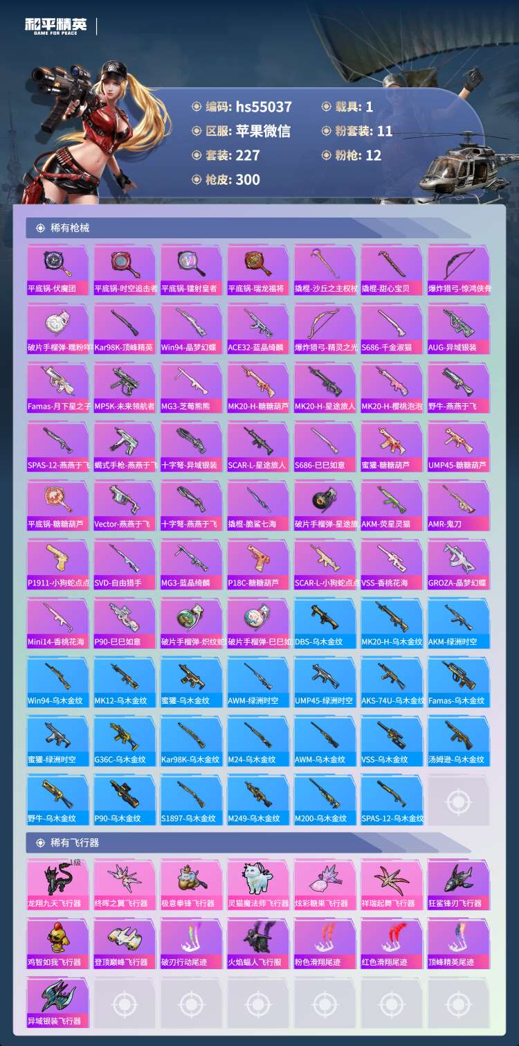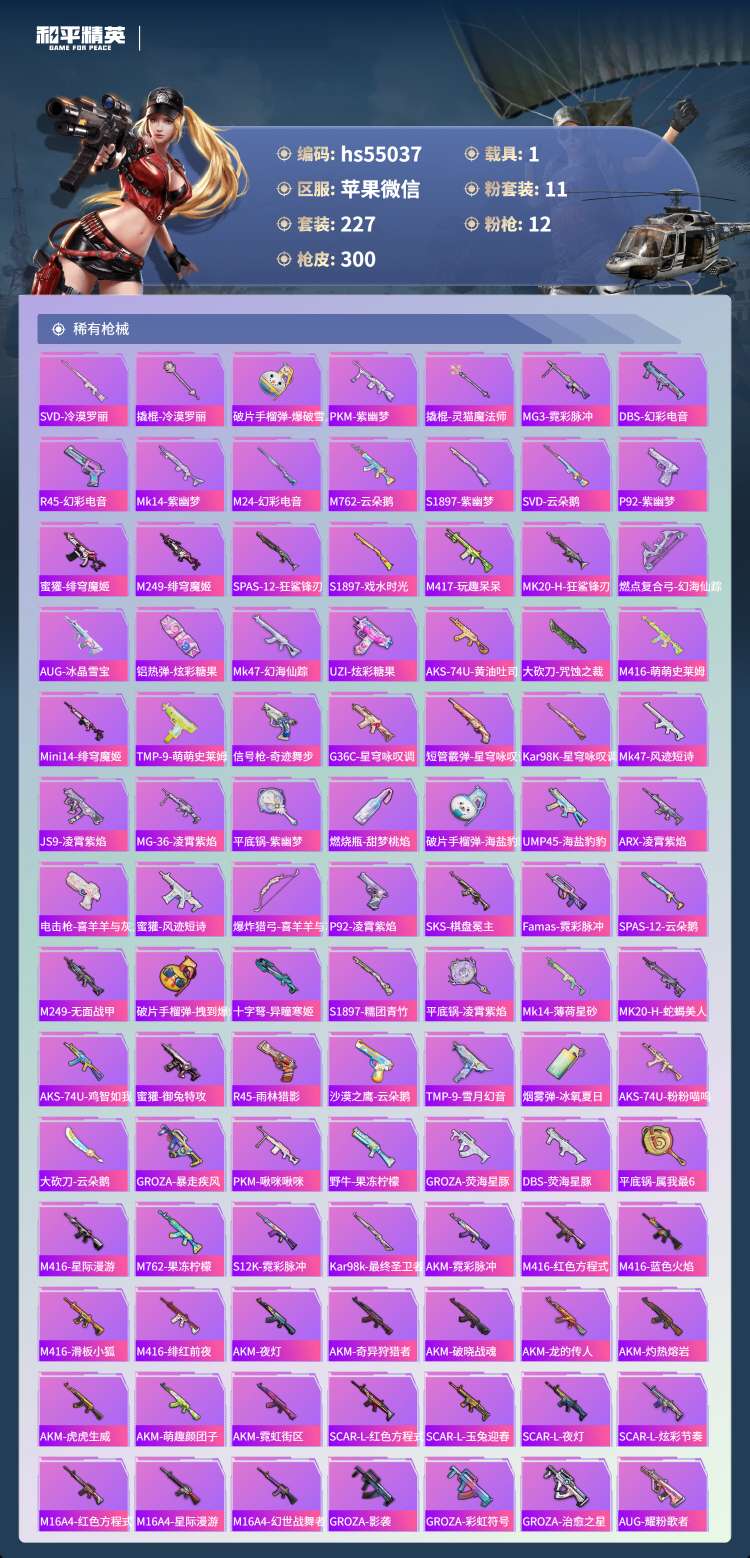 hs55037 苹果微-16王牌印记-11粉装-12特效枪-1载具-92772热力值-227套装-