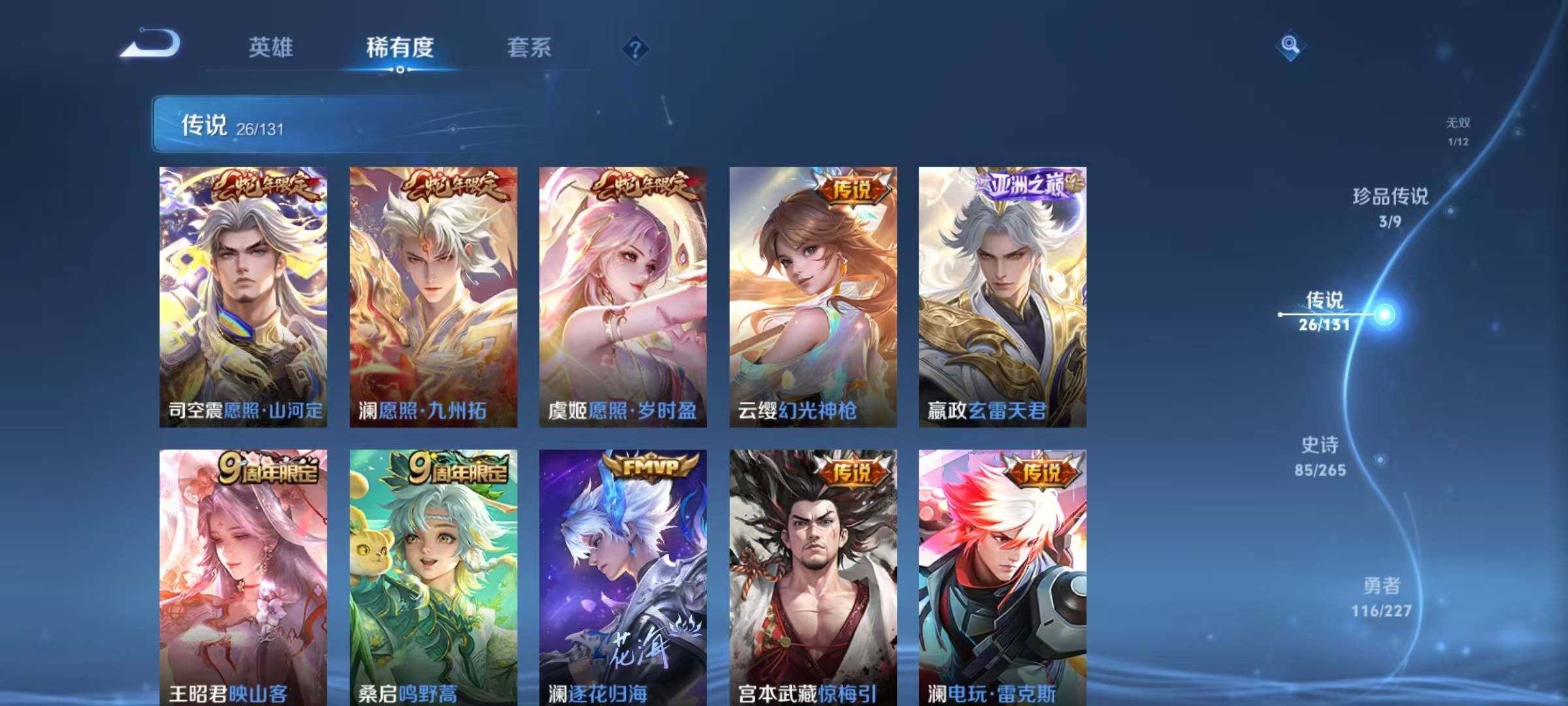 【传说皮肤】:司空震愿照山河定,澜愿照九州拓,虞姬愿照岁时盈,云缨幻光神枪,嬴政玄雷天君,