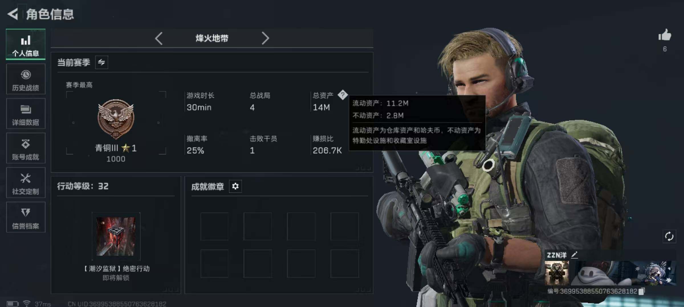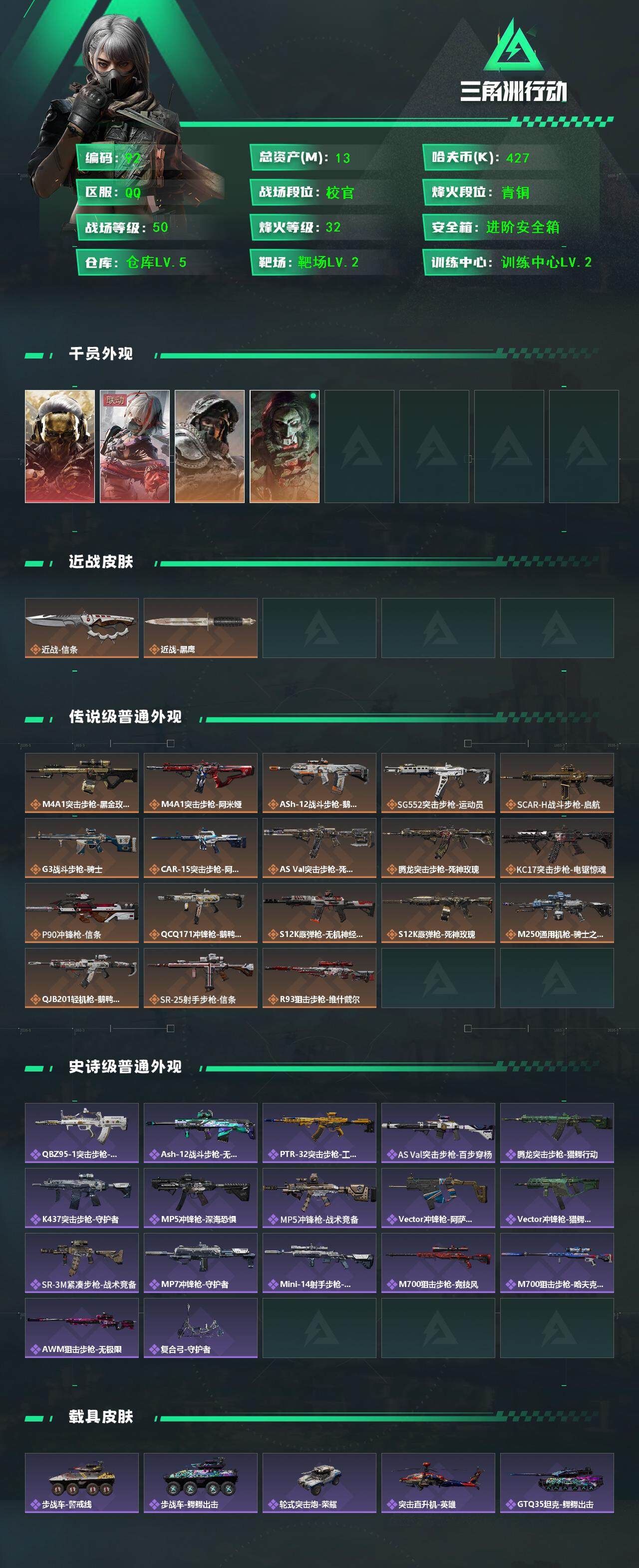 13m总资产-427k哈伏币-32烽火等级-青铜-50战场等级-校官,7100