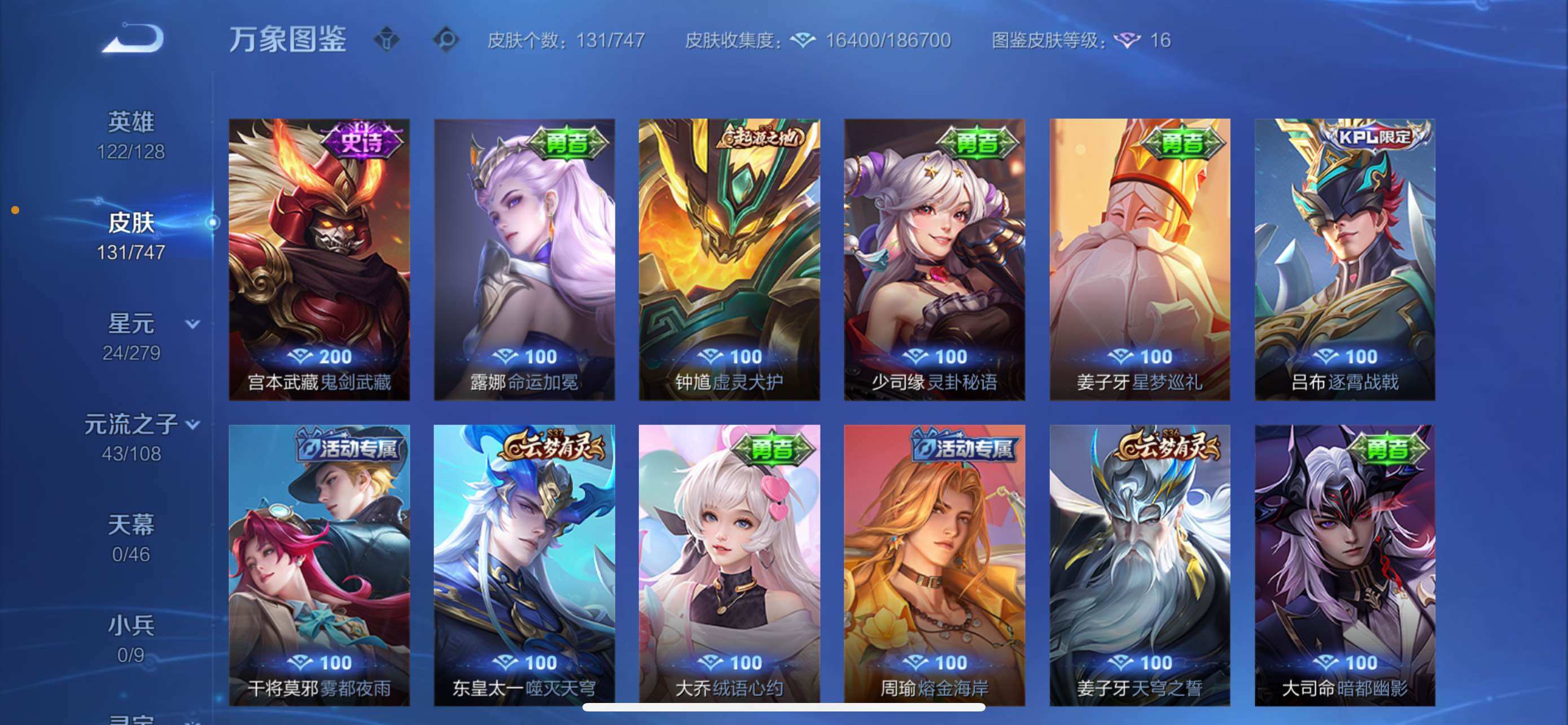 【限定皮肤】:大乔绒语心约,姜子牙天穹之誓,狄仁杰阴阳师,赵云皇家上将,孙尚香蔷薇恋