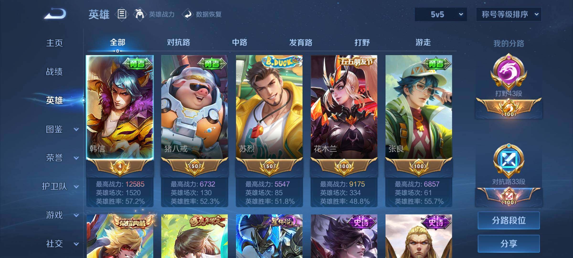 【精品小号·金标1.2w韩信·金标花木兰·打野43段·弑枪猎影·全息碎影·山海