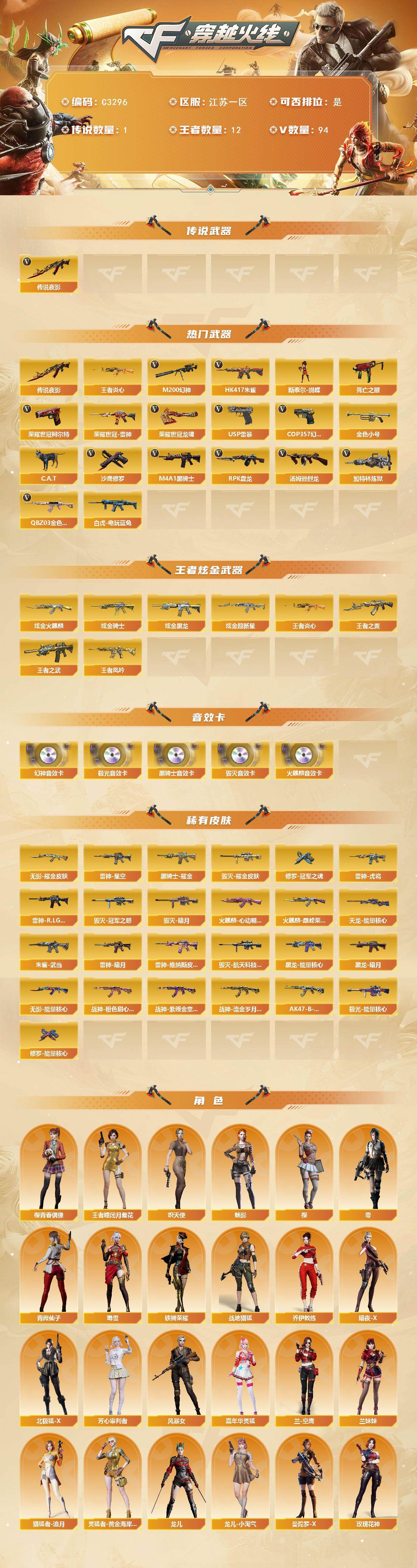 【热门武器】:传说夜影,QBZ03-金色蔷薇,HK417-朱雀,M200-幻神,死亡之眼,荣耀世冠-雷神,白虎-电玩蓝兔,荣耀世冠-柯尔特*2,王者炎心,金色小号,C.A.T,M4A1-黑骑士,汤姆逊-烈龙*5,RPK-盘龙*6,加特林-炼狱,斯泰尔-蝴蝶,USP-雷暴,COP 357-幻灵,沙鹰-修罗*2,荣耀世冠-龙啸