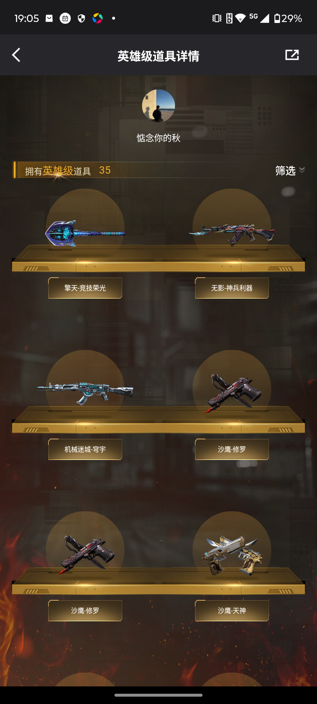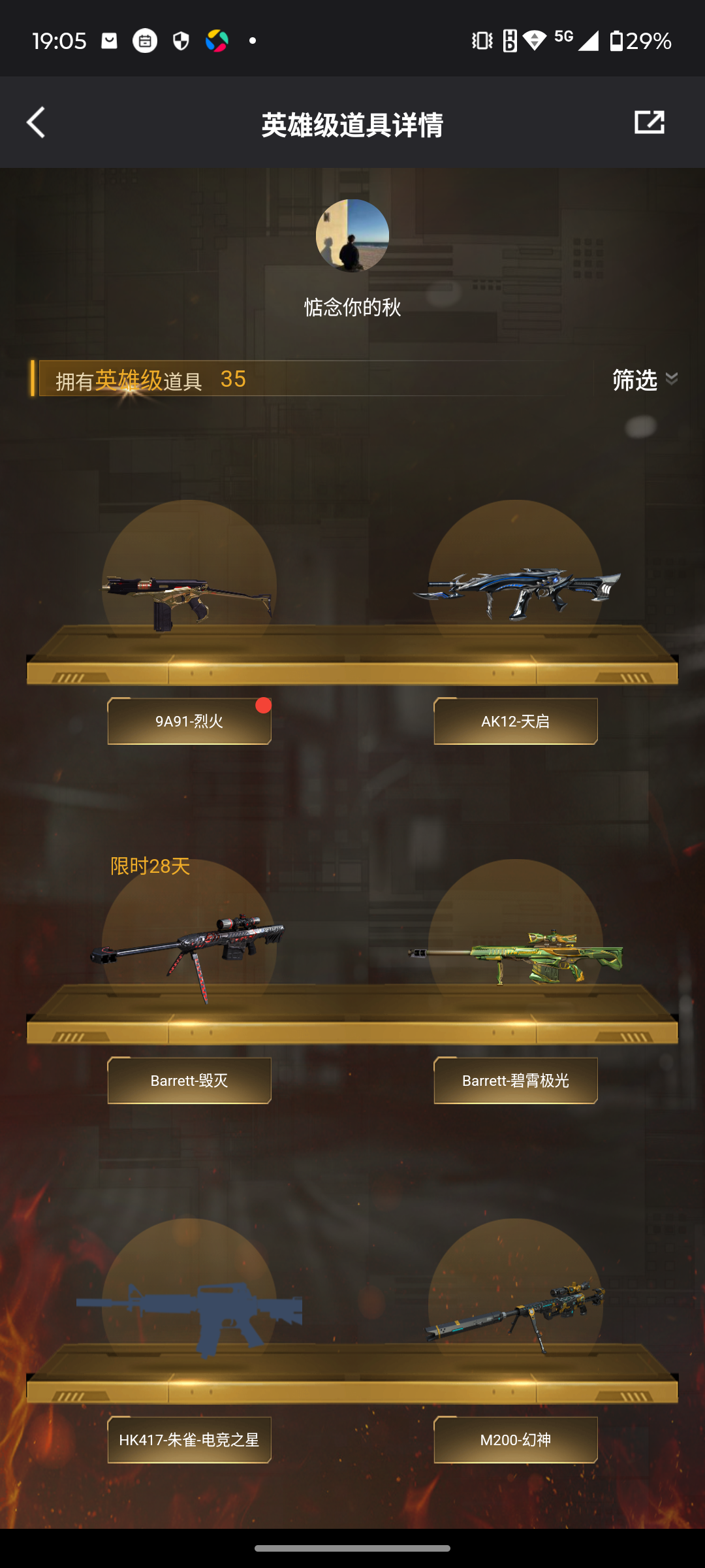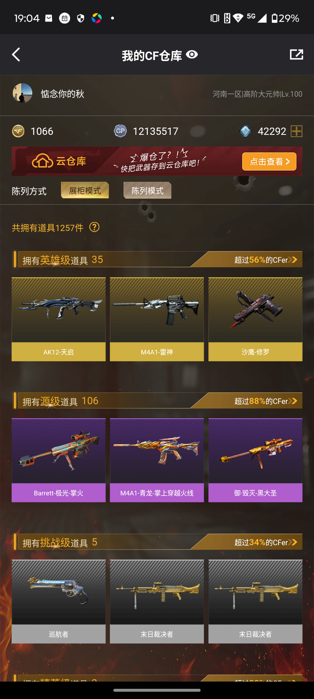 MCF805【等级】100【区服】河南一区【段位】荣耀之巅【英雄角色】2【英雄武器】35【英雄级角色】 电竞教官-云悠悠 幻面灵狐 葵-阿尔法武装【英雄级武器】Barrett-毁灭 HK417-朱雀-电竞之星 屠龙-电竞之星 M4A1-苍鸣雷神 Barrett-碧霄极光 沙鹰-修罗 9A91-烈火 龙啸-烈火龙威 炼狱-百战金芒 AK12-天启 机械迷城-穹宇 麒麟刺-百战金芒 M4A1-再燃火线 M4A1-雷神 沙鹰-修罗 沙鹰-天神 QBZ03-金色蔷薇 黑武士-锦绣游龙 烟雾弹-幻灵 高