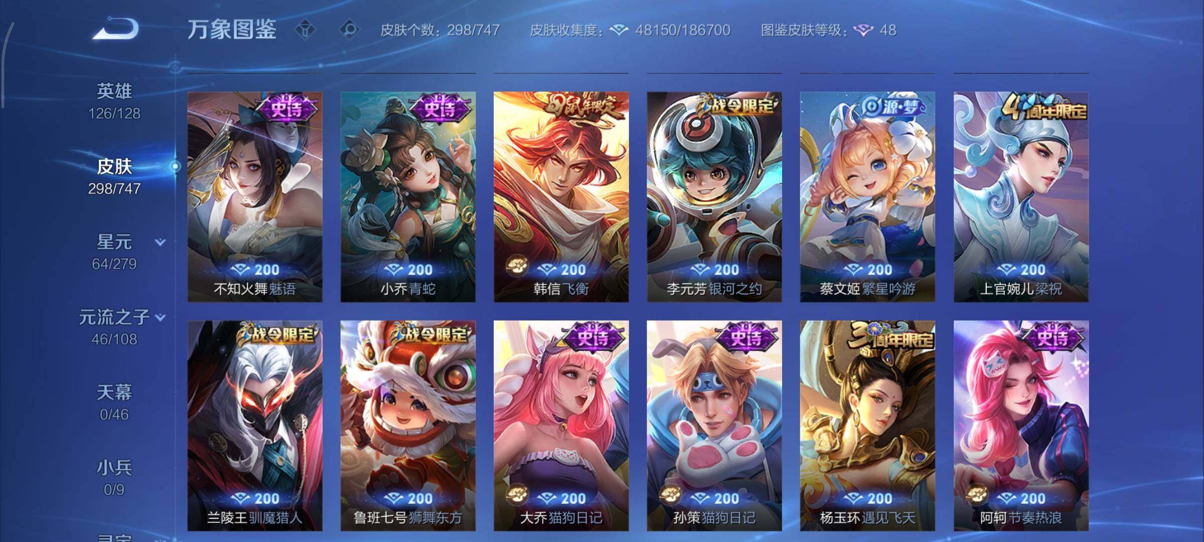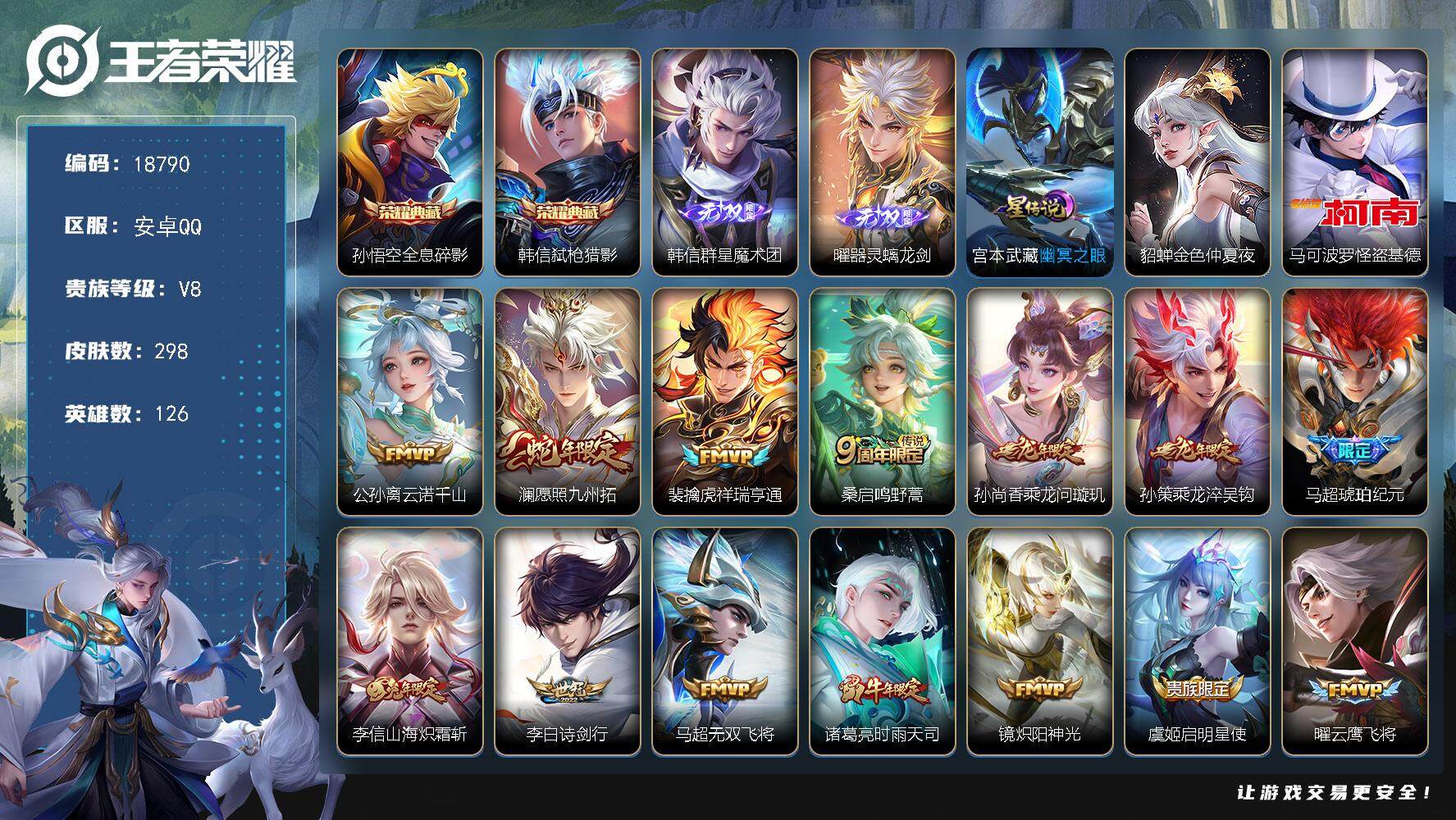 可换绑【V8精品号 韩信全皮 梅西 双典藏 曜韩信无双 怪盗基德 龙年孙策 马超琥珀纪元 神威 多传说限定打野号】 8按键,2星传说,22王者印记,五级铭文200,可二次KK7075,安卓Q-V8-298皮肤-2典藏皮肤-2无双-1珍品传说-20传说-95史诗【英雄全皮】:韩信全皮,鬼谷子全皮,李信全皮,蒙恬全皮【荣耀典藏】:孙悟空全息碎影,韩信弑枪猎影【无双皮肤】
