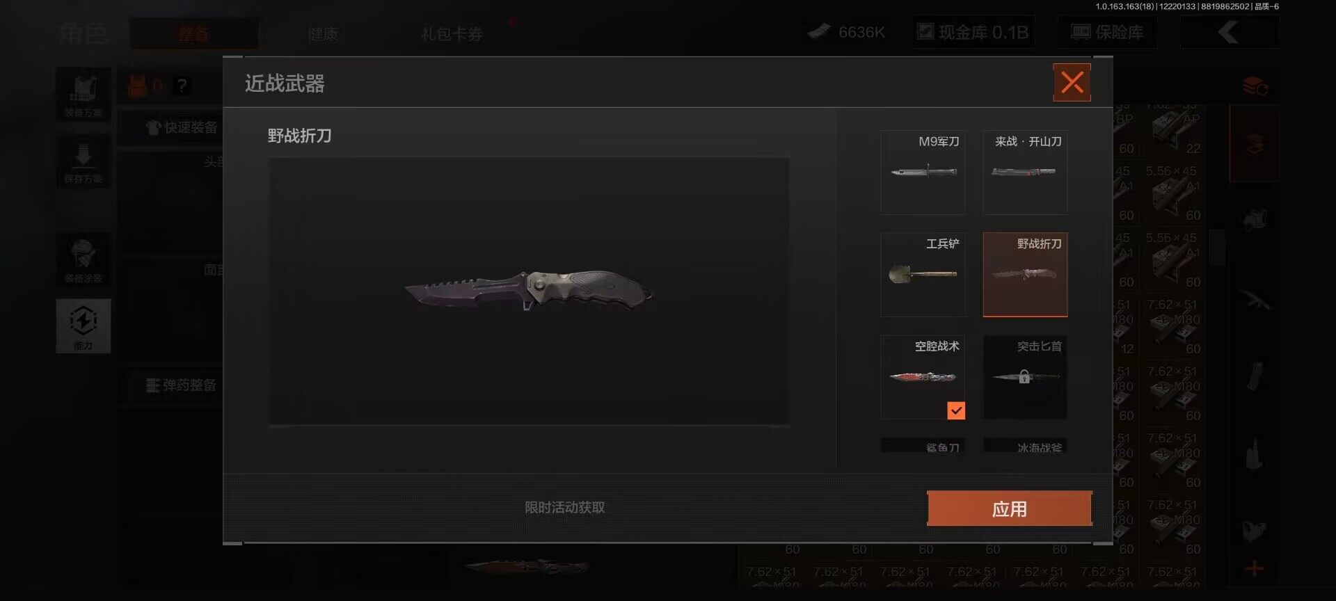 段位:暗区传说/仓库价值(百万):182/空腔战术/野战折刀/脉冲马克西姆/告丧夜曲AUG/旧王圣谕VSS