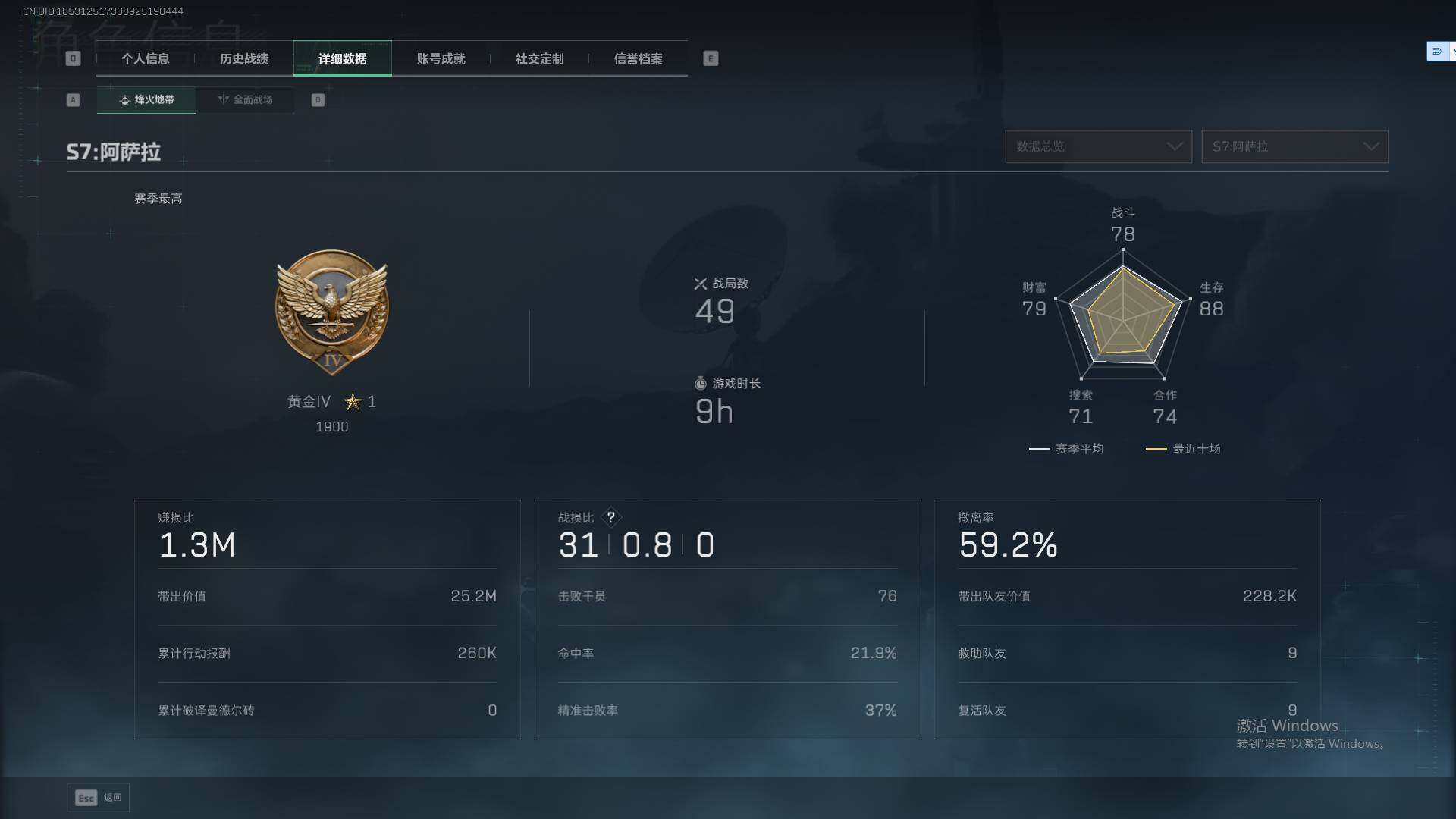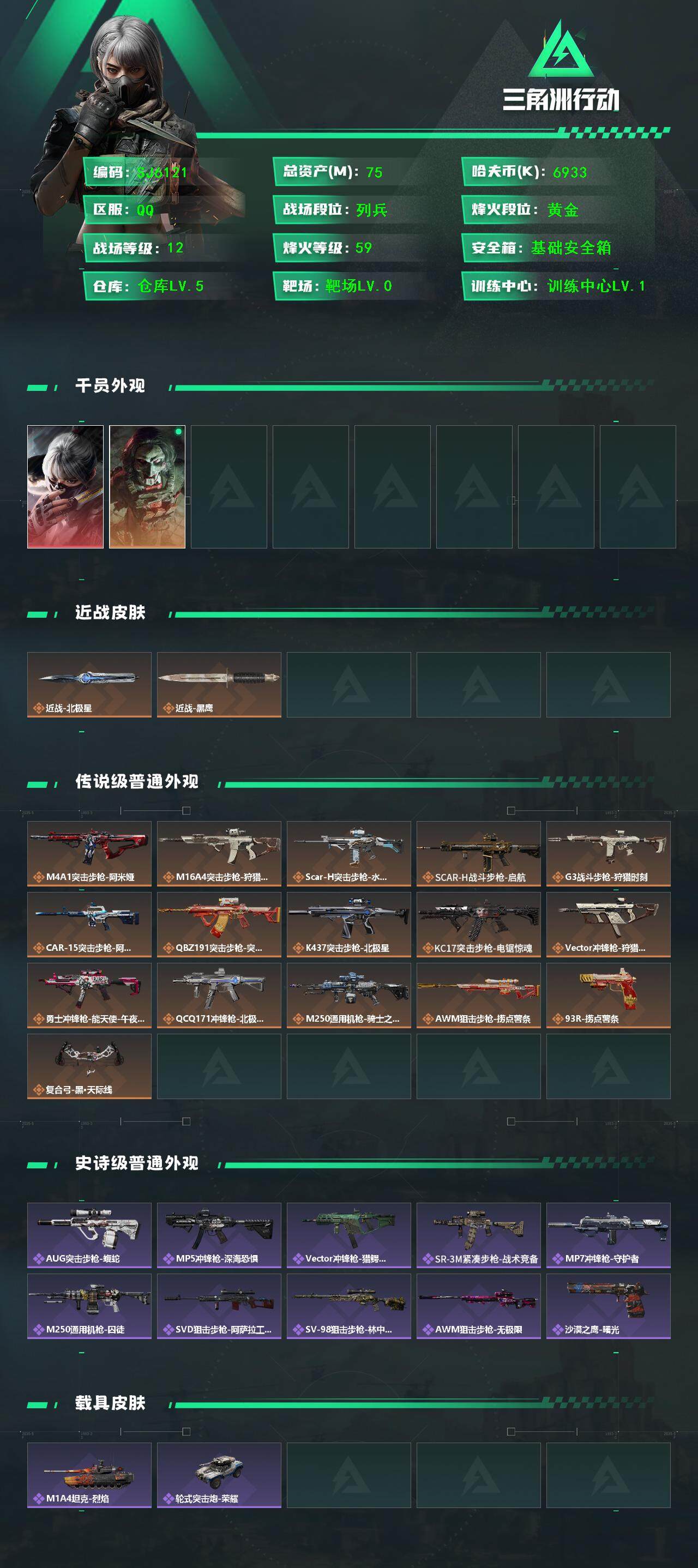总资产(M):75M/哈夫币(K):6933K/传说枪皮数:16/全面战场等级:12_段位:列兵/烽火地带等级:59_段位:黄金